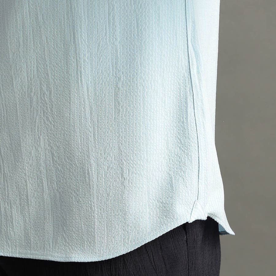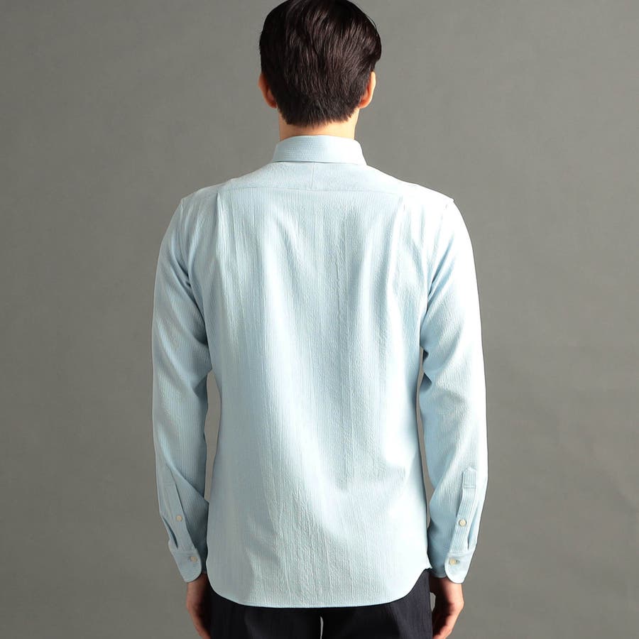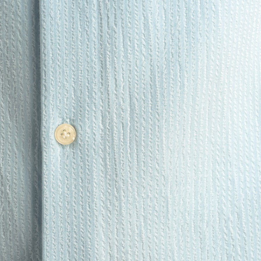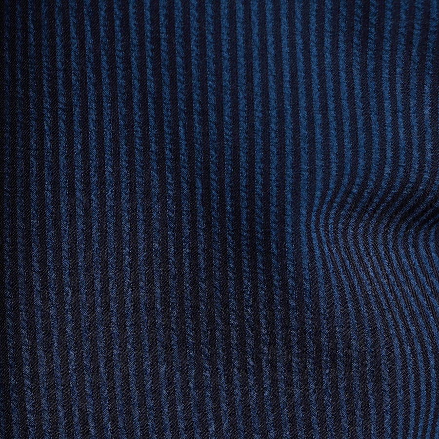 ランダムに組織変化させたポリエステルサッカー。カチオンとレギュラーの染め分けで、ストライプ柄を同系色で表現した特殊素材を採用。
