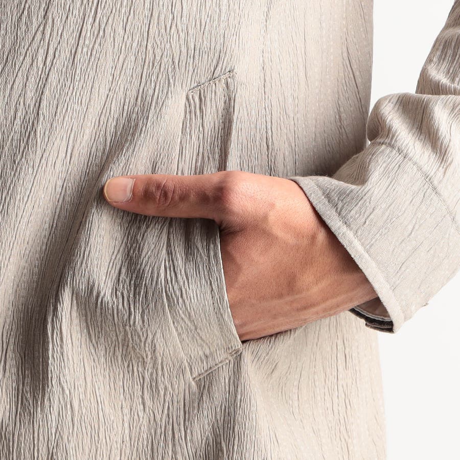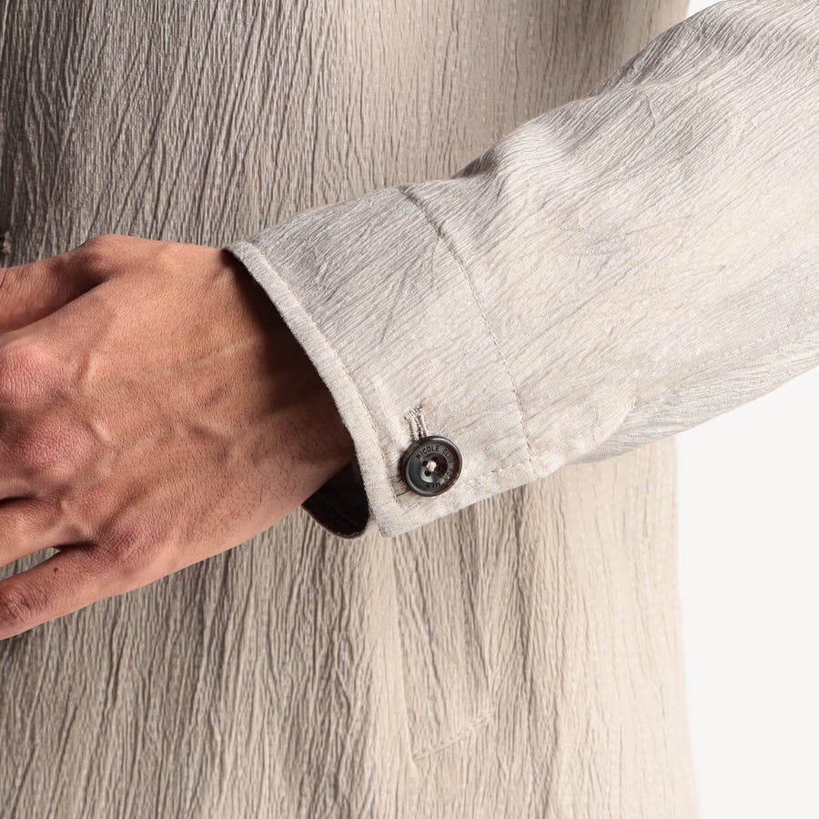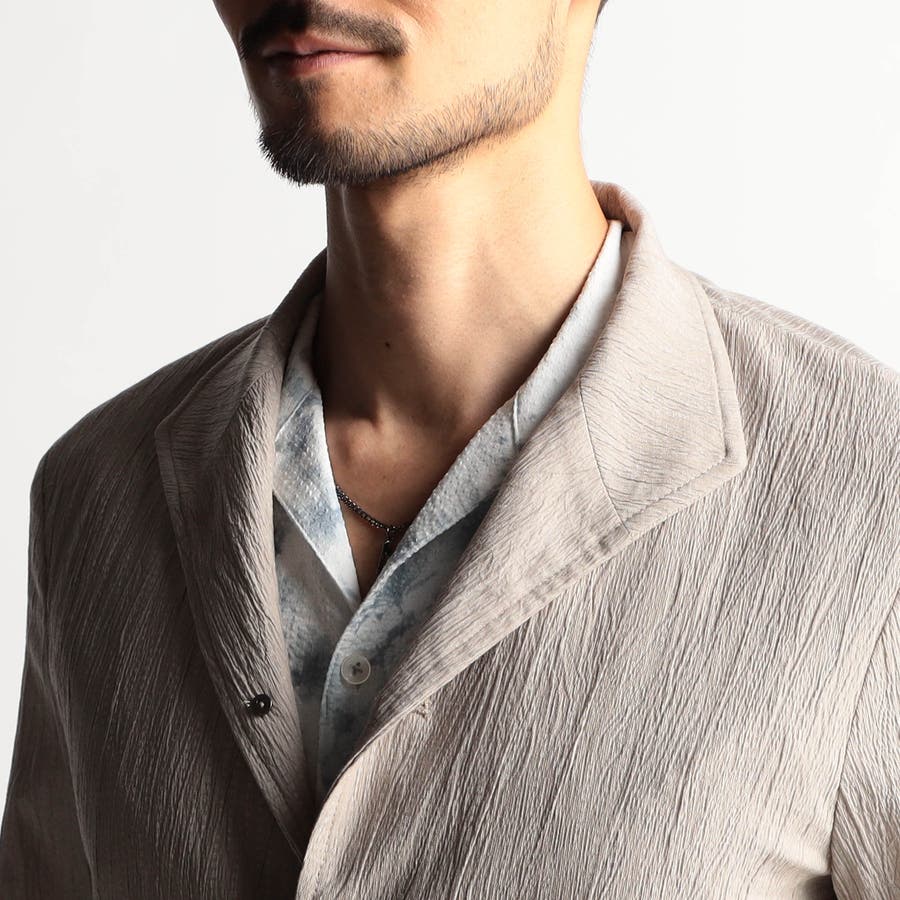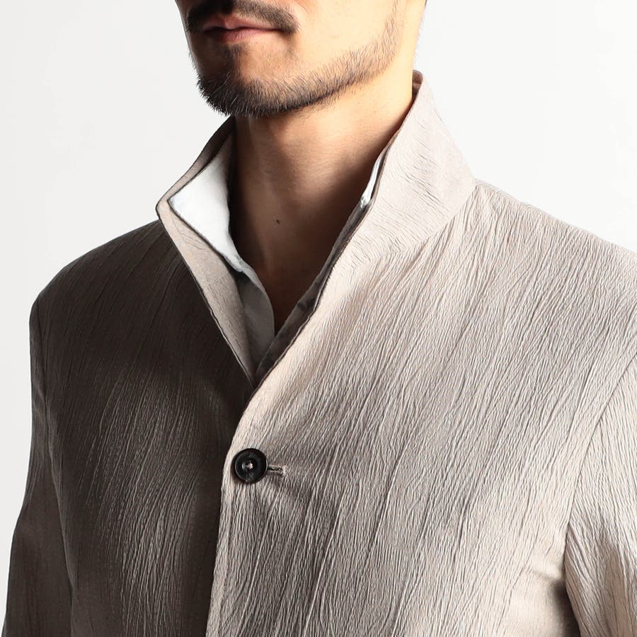 スタンドデザインのカヴァーオールジャケット。衿端にワイヤーを入れています。ねかしてラペルにしても収まる設定にしていますので、Vゾーンを綺麗に作れます。一重仕様の軽い仕上がりでシャツ感覚で着用出来ます。前身裏のみ付け、内ポケットを作っています。フロントの一番下の釦は止める設定していませんのでご注意ください。