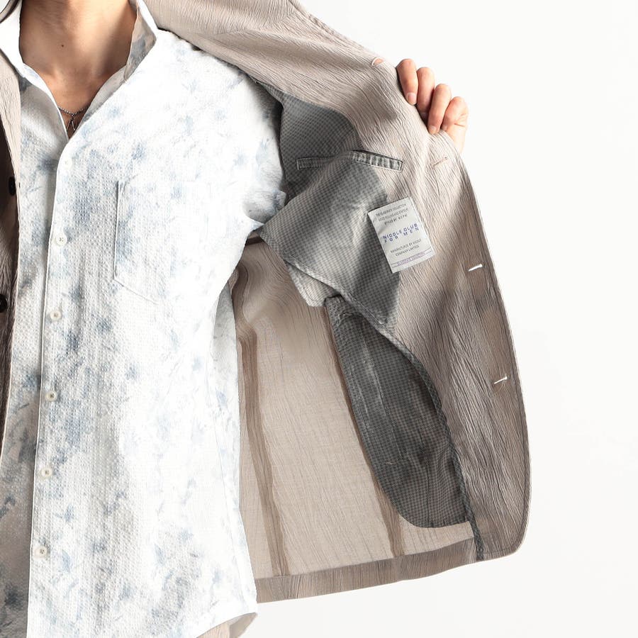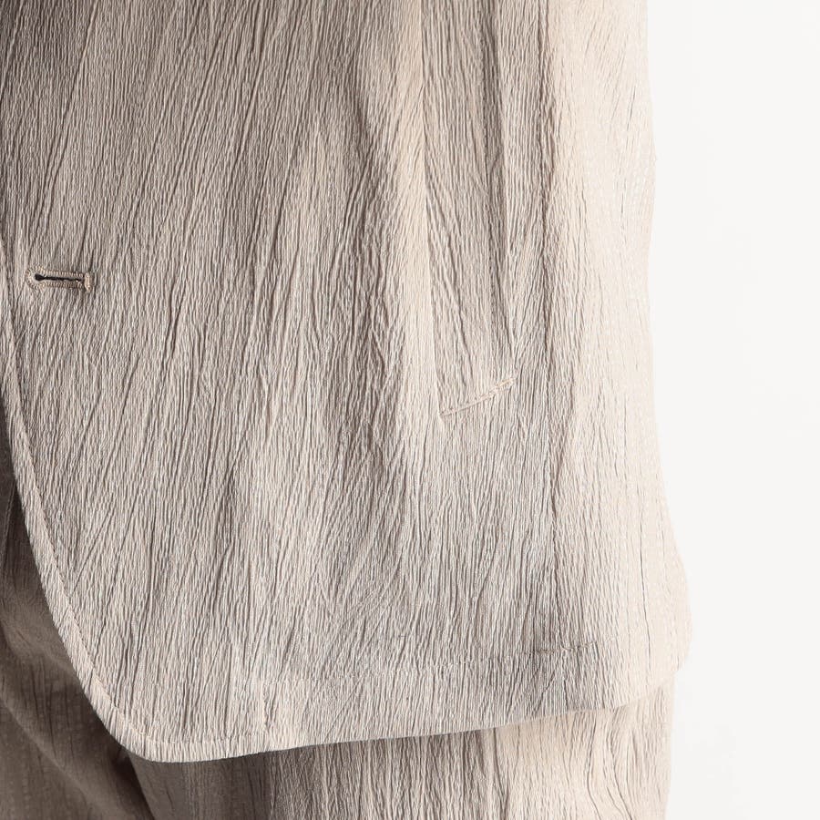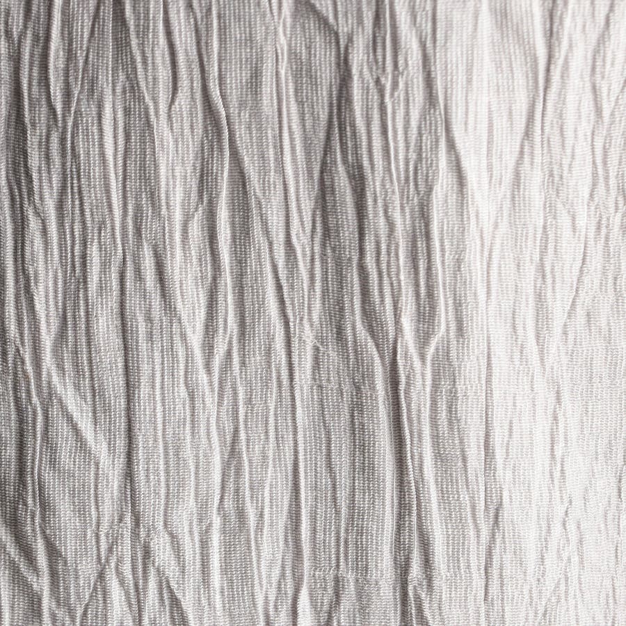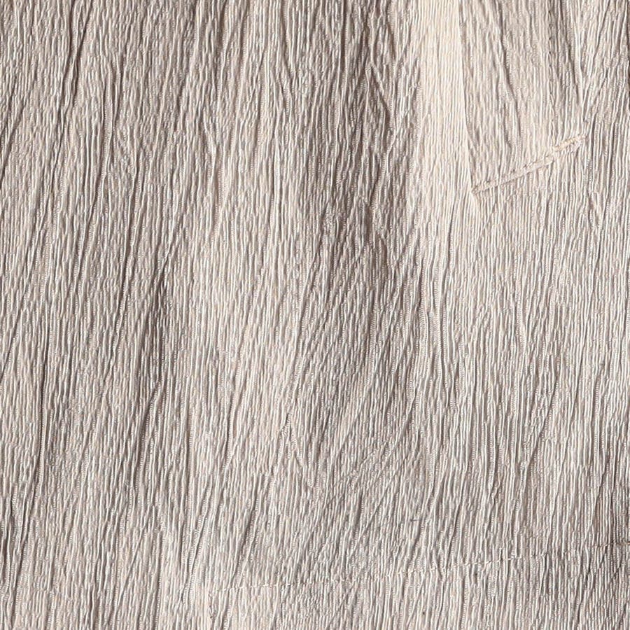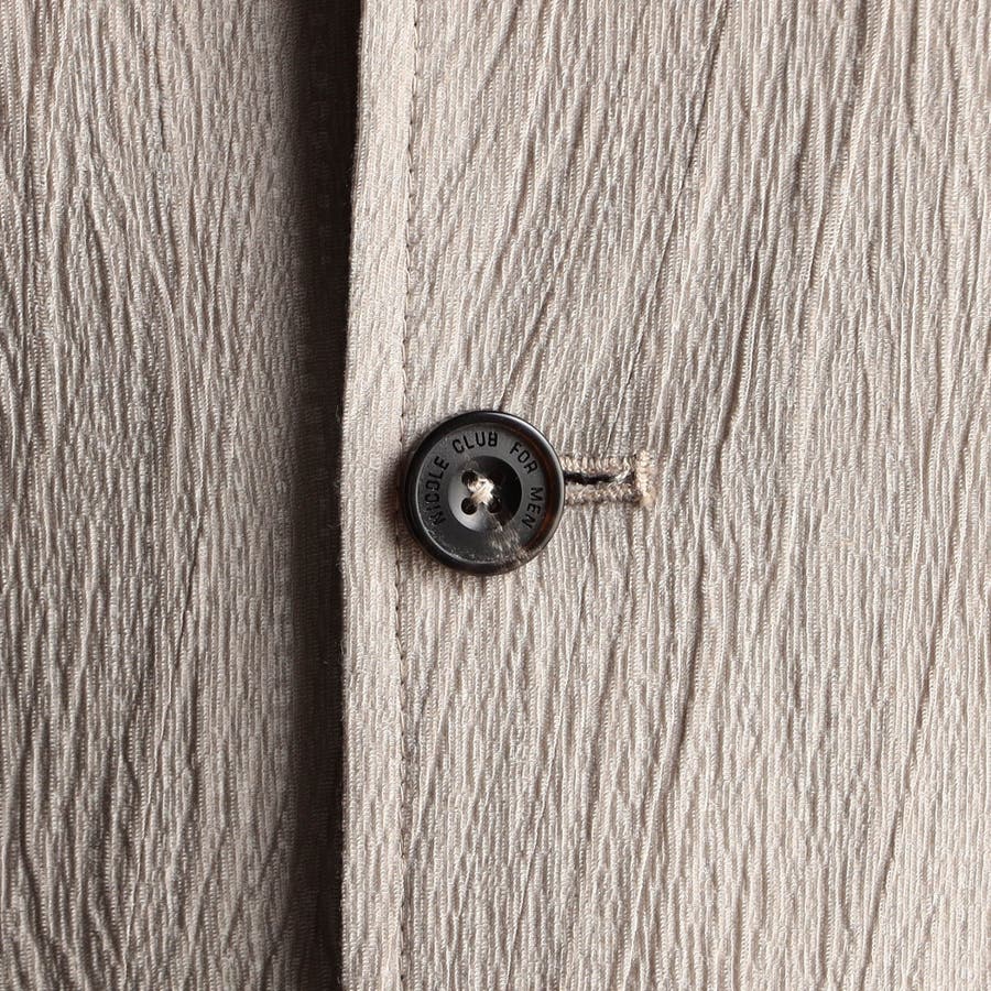 薄いポリエステル素材にランダムなドット柄のエンボスプリントを施し、楊柳の様な細かいプリーツ加工を施した素材です。楊柳特有のオウトツ感ある組織にエンボスプリント柄が生地感に面白味を出しています。生地自体のシャリっとサラッとしたドライな風合いは肌離れが良く、初夏まで長く着れます。