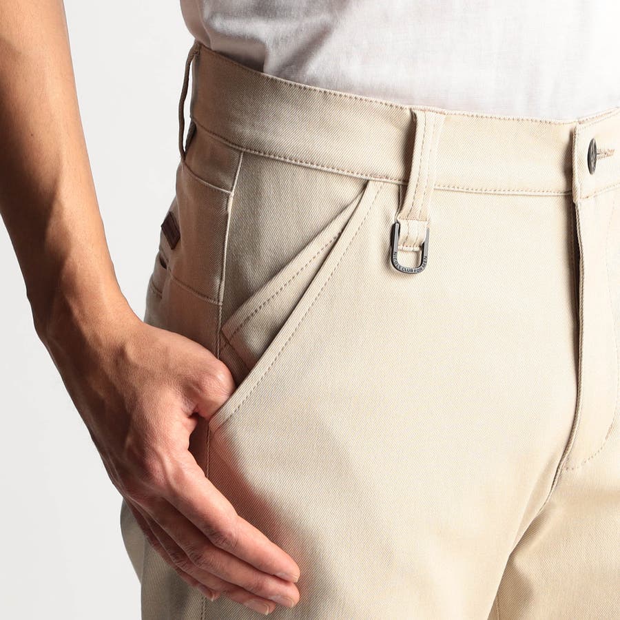 シンプルなデザインの5ポケットパンツ。スラックスを意識した直線的なデザインがポイントの綺麗めパンツです。素材にあわせてウエストベルトも少し伸びる様に縫製しています。ストレッチ裏地を別布に使用していますので穿き着心地も抜群です。オリジナルのタックボタンやDカン、腰裏の刺繍や革ネームをアクセントにしています。尻から内股にかけて伸びすぎ防止の補強布を当てて強度を高めています。