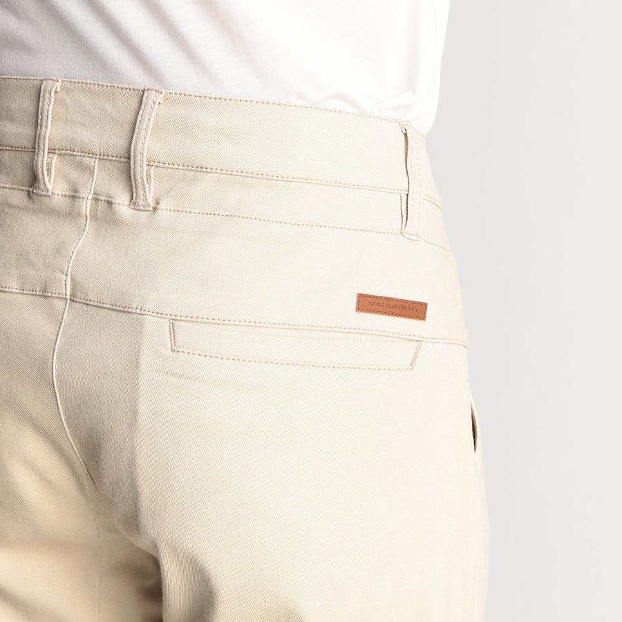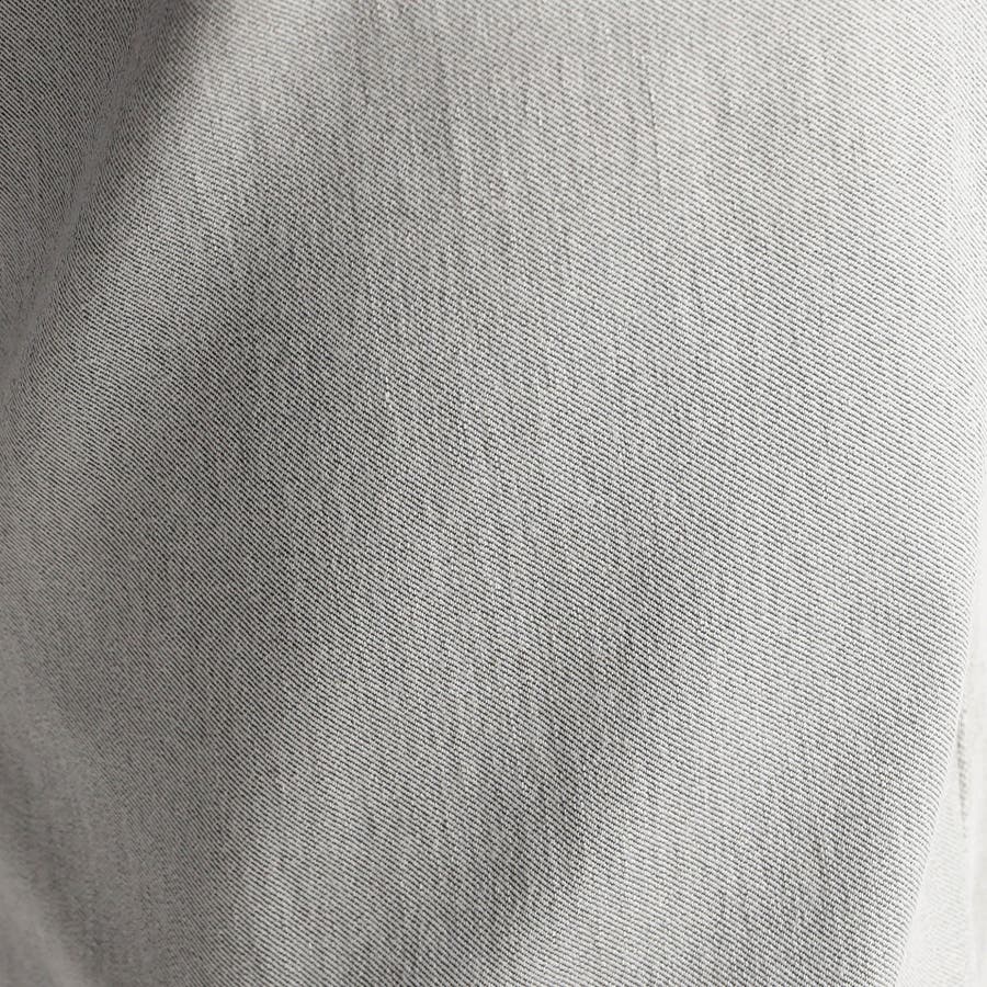 吸湿性の高い再生繊維のレーヨン糸とプリッとしたコシを出すナイロン糸を使用したハイパワーストレッチ素材です。ポリウレタン混の良く伸びてキックバックが利いたストレッチ感、シャリみのあるタッチ感は肌触りも抜群です。汚れが付きづらい撥水加工をプラスしています。