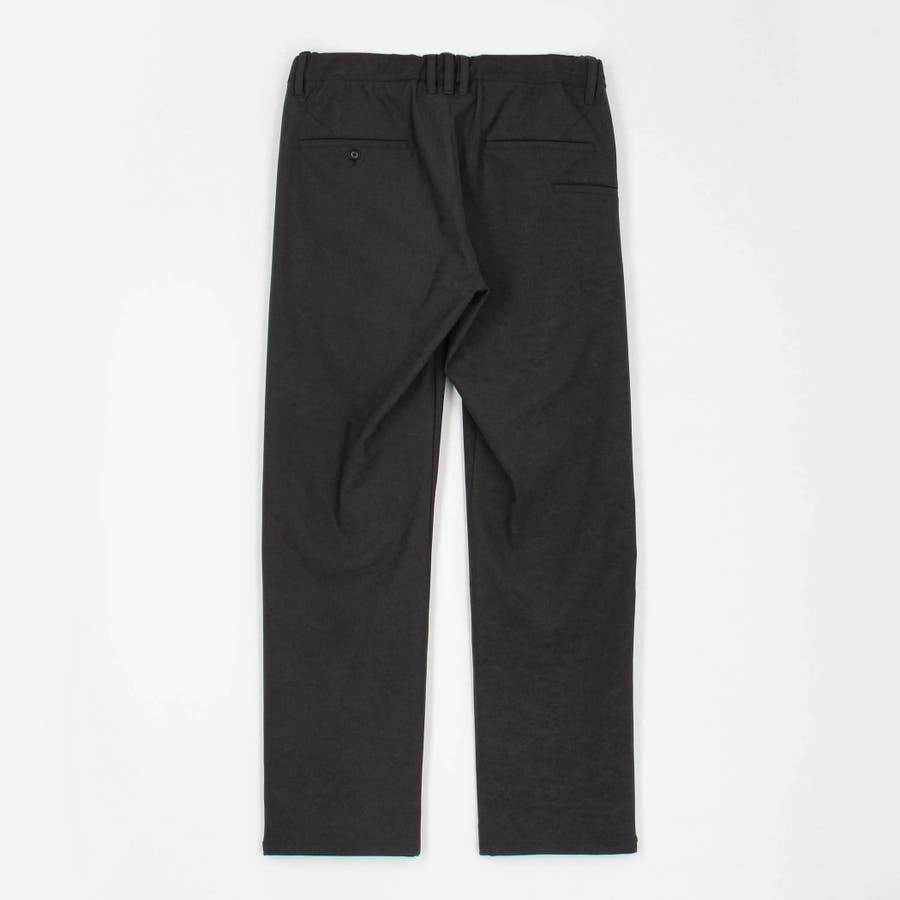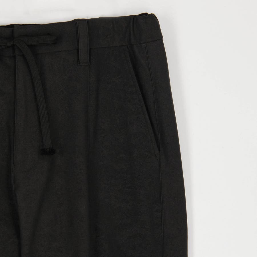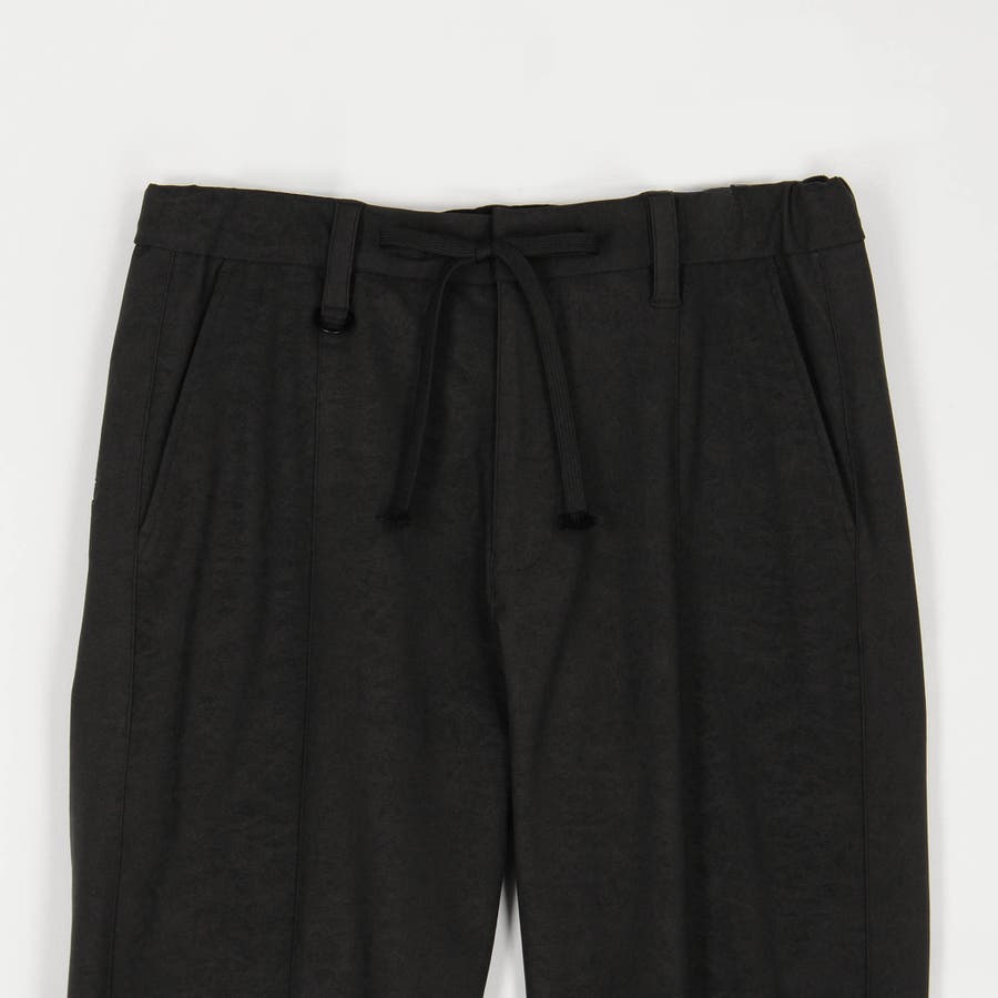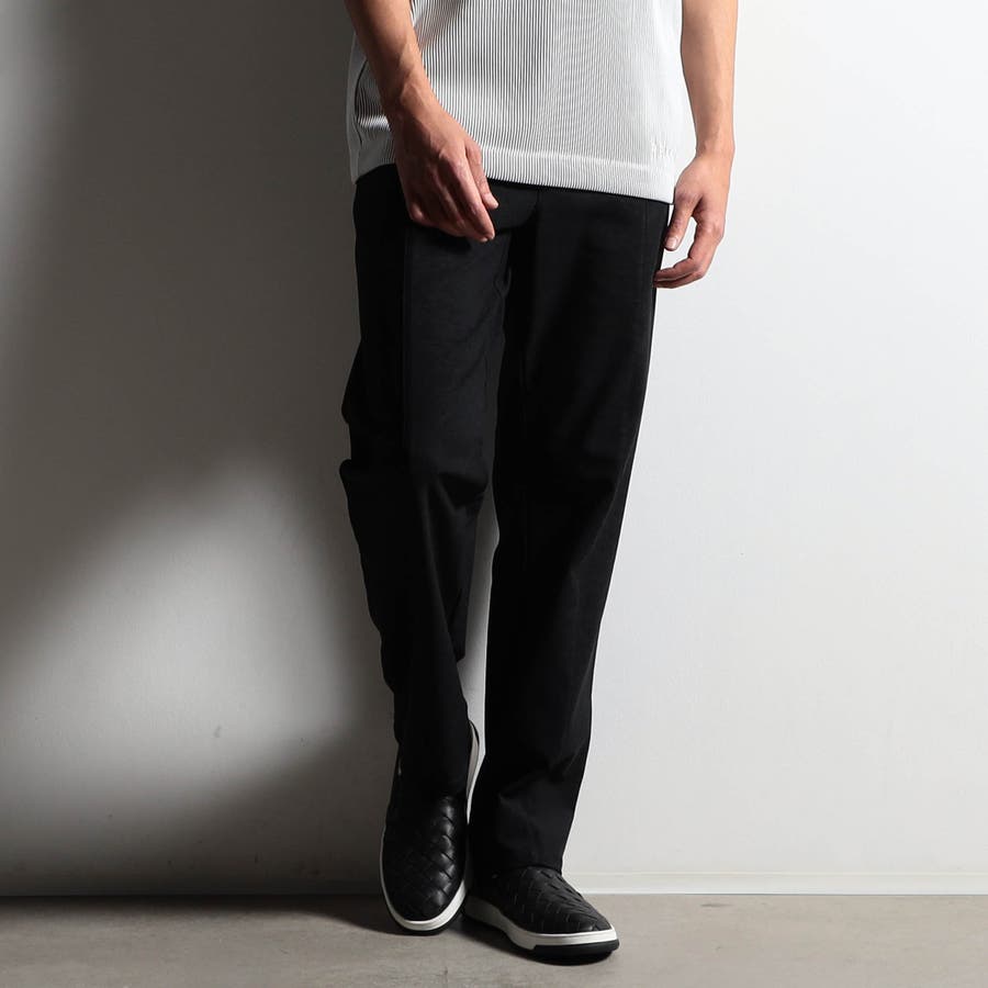前身のセンター折山部分を摘まんでピンタックにしているデザインイージーパンツ。リエラボならではのバックスタイルにこだわった3本ループとオリジナルのロゴ入り釦を使用した両玉縁ポケットで差別化をしています。裏の別布にはストレッチ素材を使用して清涼感を出し、穿き心地を高めています。