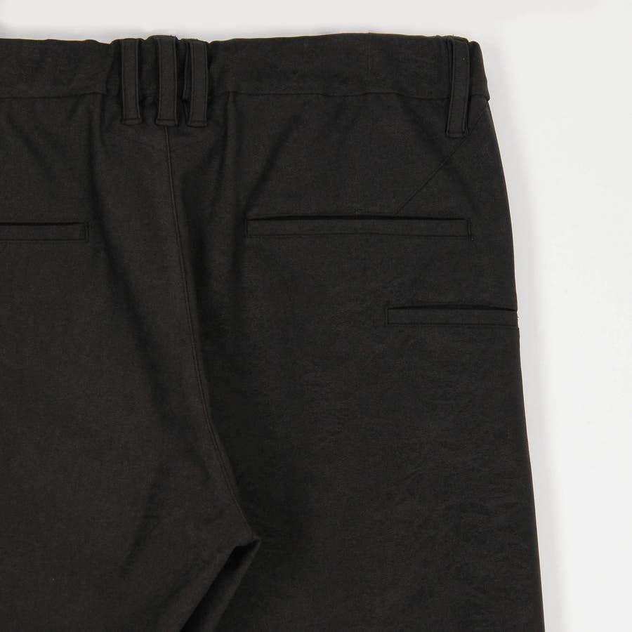 ナイロンジャージの2WAYストレッチ素材をベースに、リアルレザーの様なシボ感をエンボス加工して素材感を表現した国産素材です。ベースのプリッとした横張り感のあるしっかりとした肉感とマルチで伸びるキックバックが効いたストレッチ性、リアルレザー様な質感が特徴です。