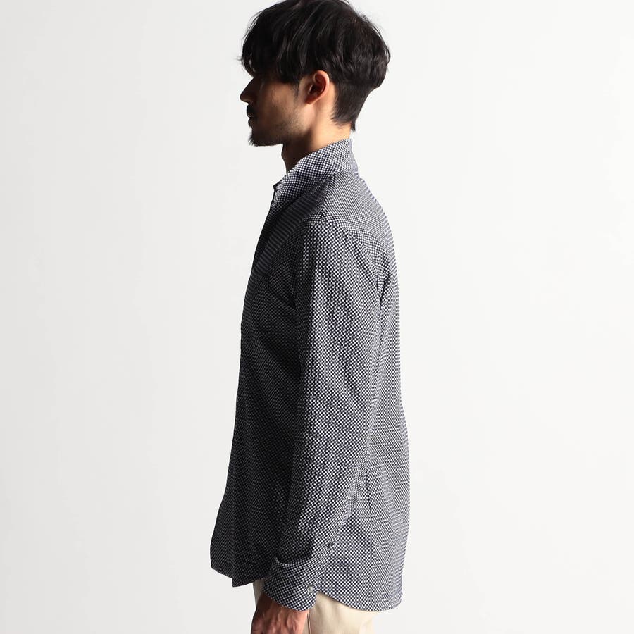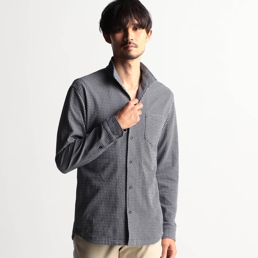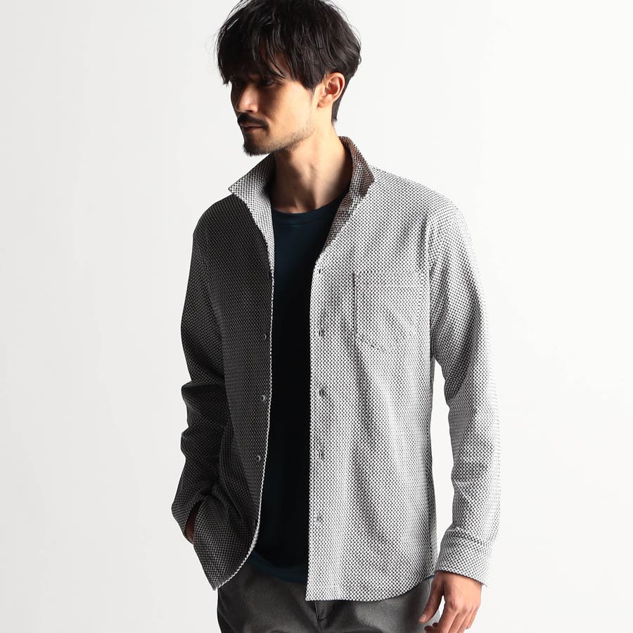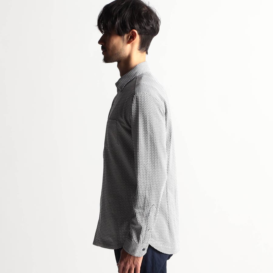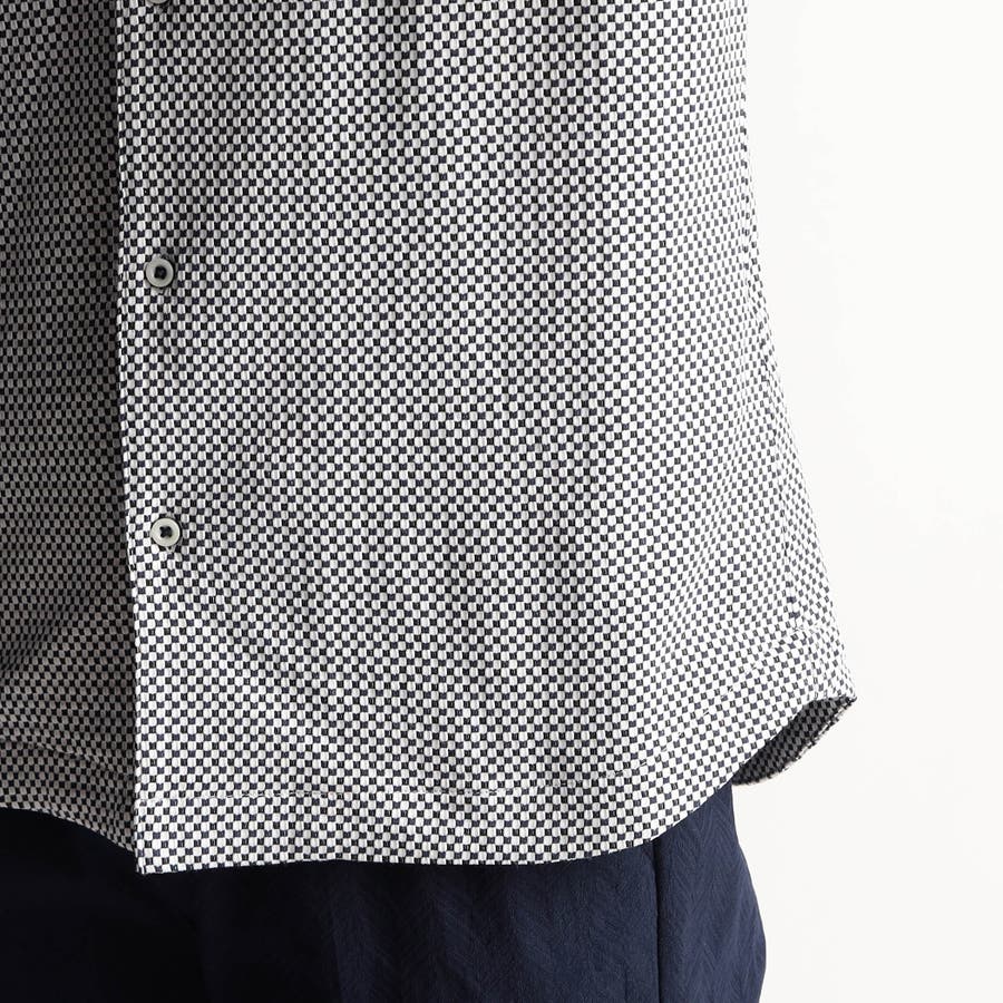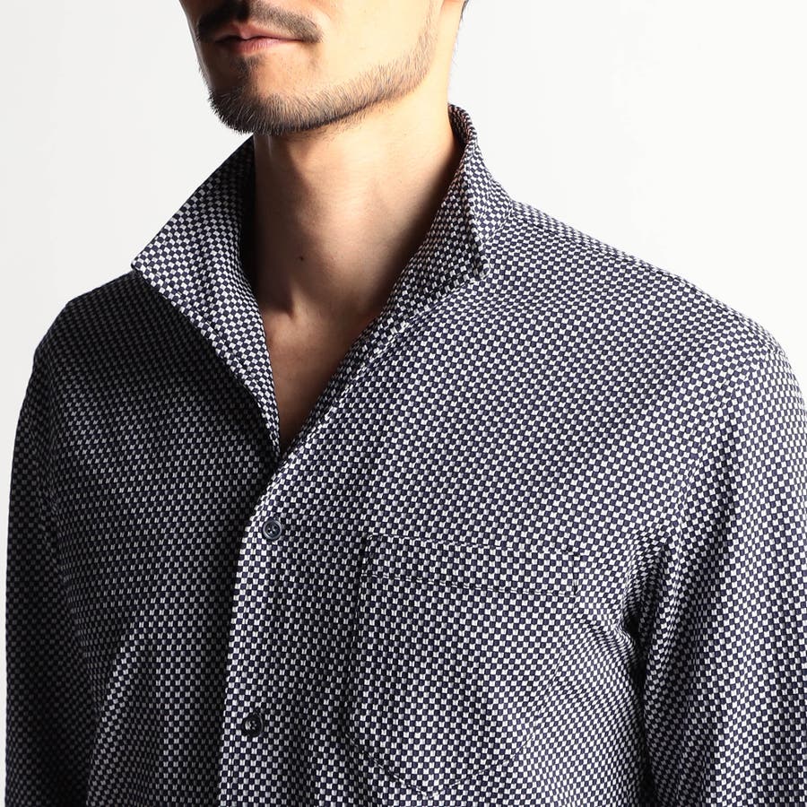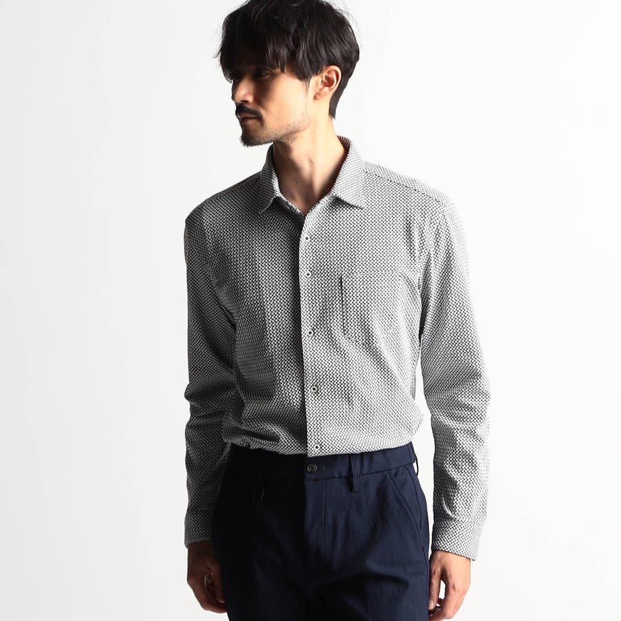 カットソー素材のシアサッカ-シャツ。衿端にワイヤ-を仕込んだスタンド・イタリアンカラ-とレギュラーカラーで展開します。レギュラーカラーは衿腰と衿幅を見直し、ジャケットを羽織った際、衿元が綺麗に見えるよう収まりの良さを追及しました。左胸のパッチポケットや袖口部分の剣ボロ仕様、オリジナルの配色ボタンがちょっとしたアクセントになっています。