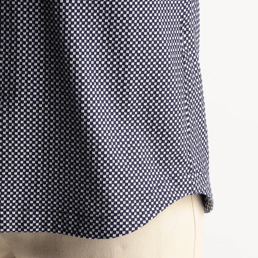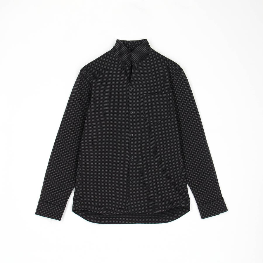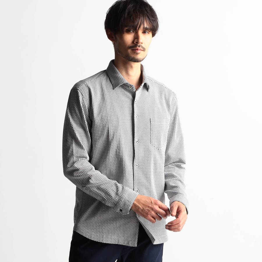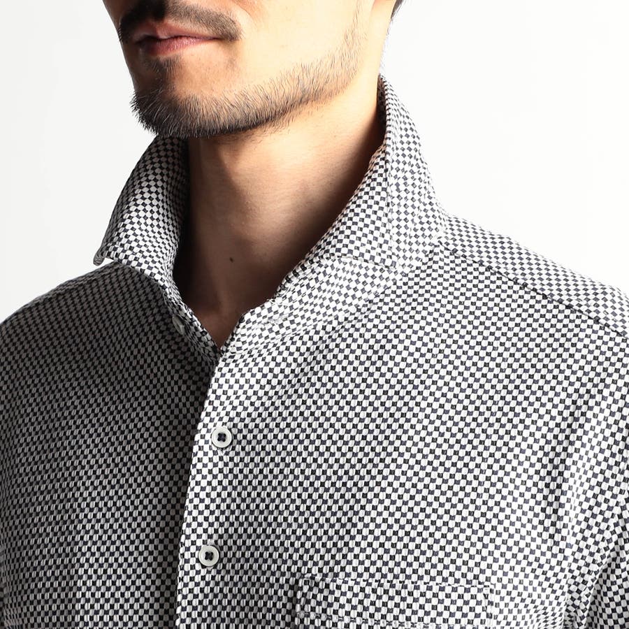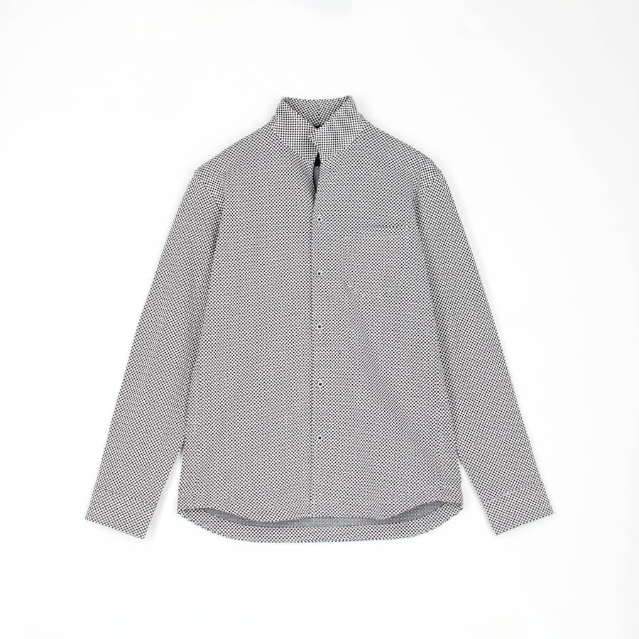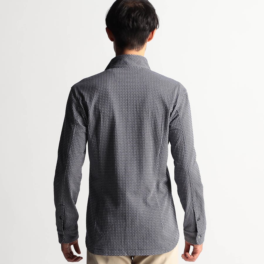 カットソー素材のシアサッカ-シャツ。衿端にワイヤ-を仕込んだスタンド・イタリアンカラ-とレギュラーカラーで展開します。レギュラーカラーは衿腰と衿幅を見直し、ジャケットを羽織った際、衿元が綺麗に見えるよう収まりの良さを追及しました。左胸のパッチポケットや袖口部分の剣ボロ仕様、オリジナルの配色ボタンがちょっとしたアクセントになっています。