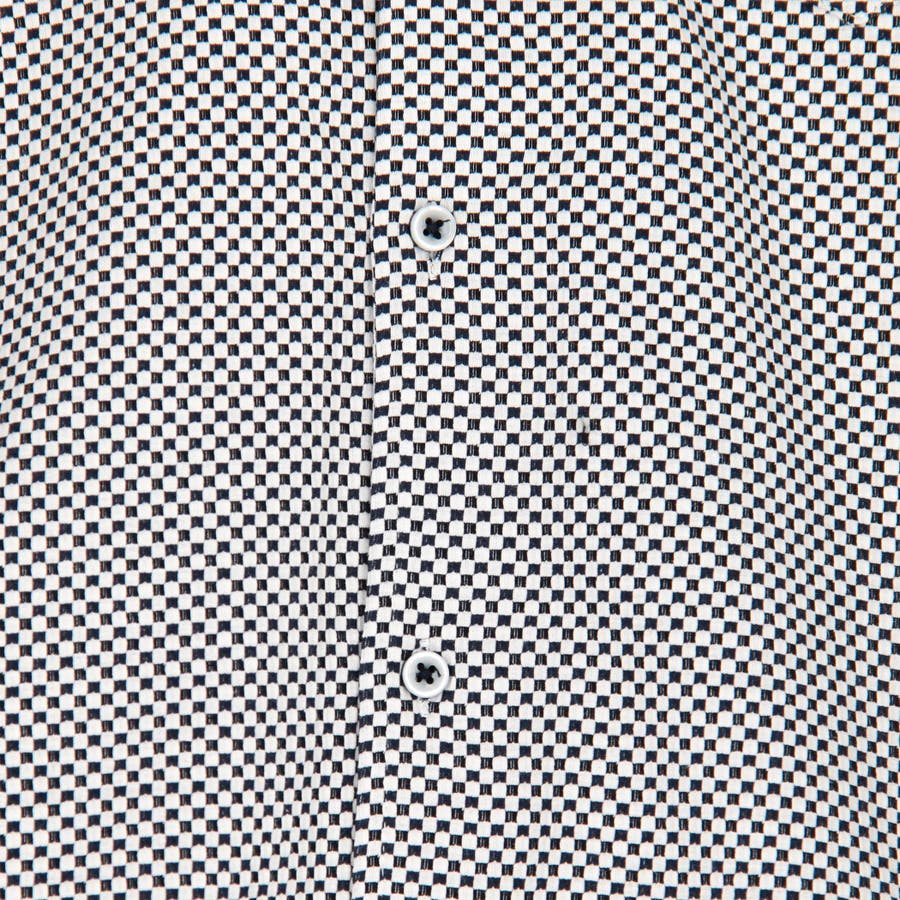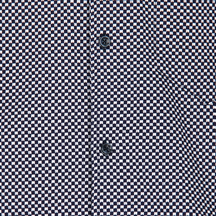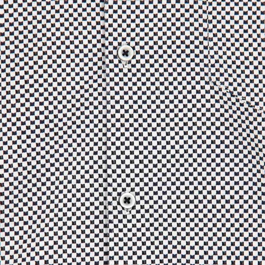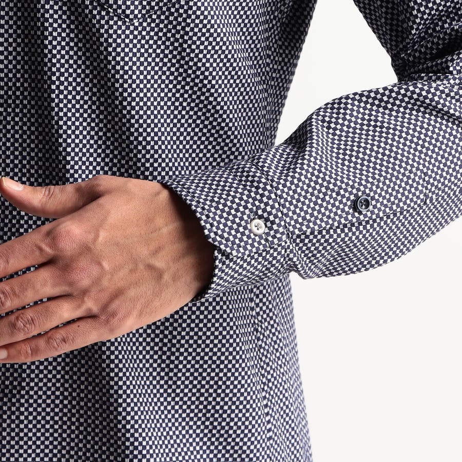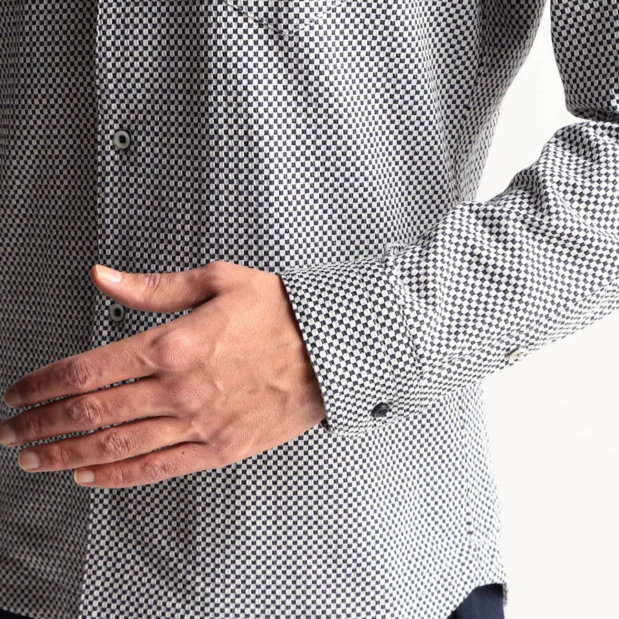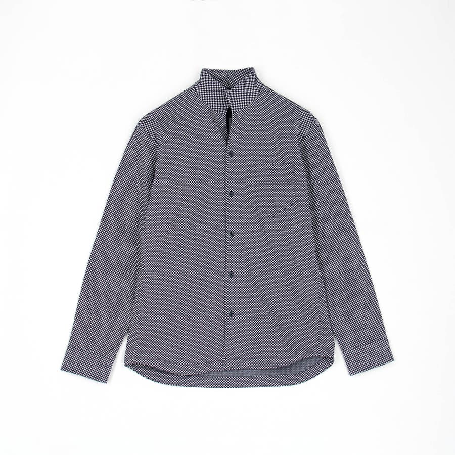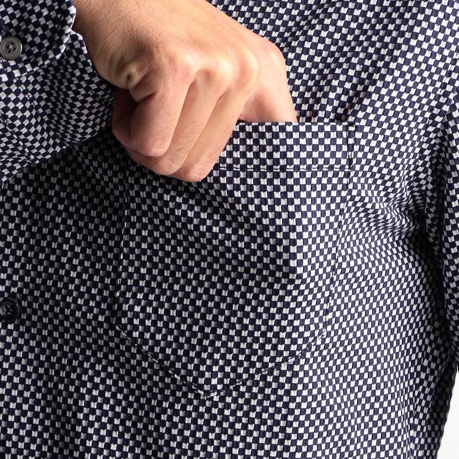カットソー素材のシアサッカ-シャツ。衿端にワイヤ-を仕込んだスタンド・イタリアンカラ-とレギュラーカラーで展開します。レギュラーカラーは衿腰と衿幅を見直し、ジャケットを羽織った際、衿元が綺麗に見えるよう収まりの良さを追及しました。左胸のパッチポケットや袖口部分の剣ボロ仕様、オリジナルの配色ボタンがちょっとしたアクセントになっています。