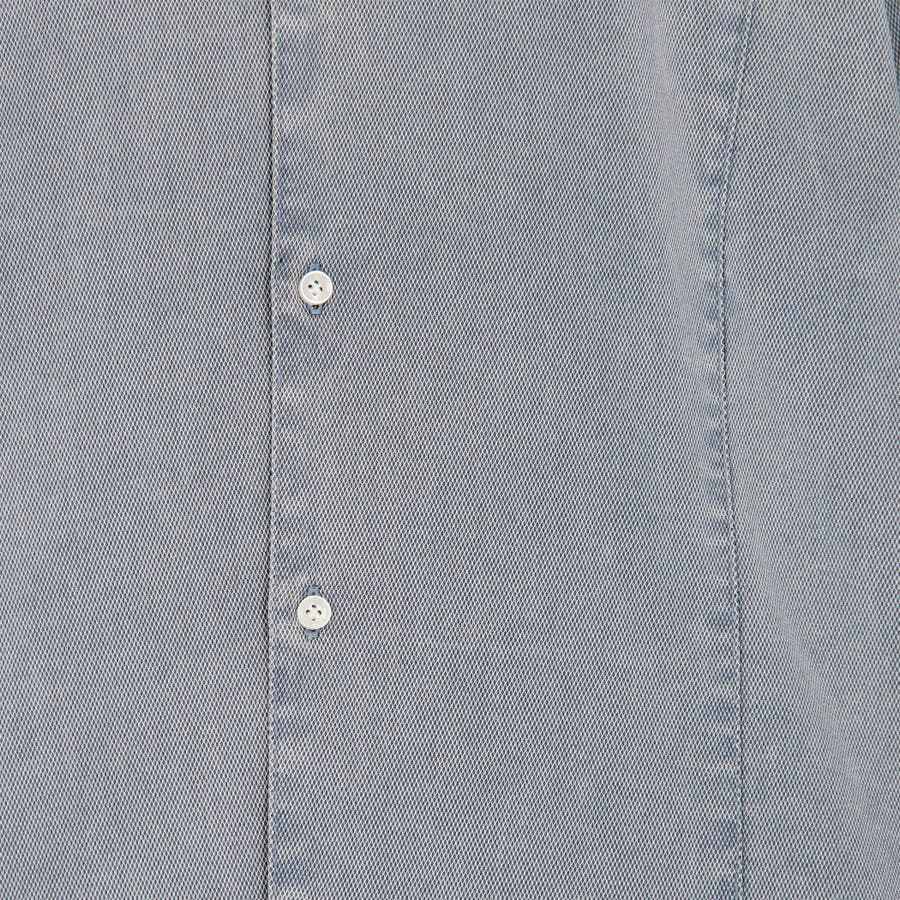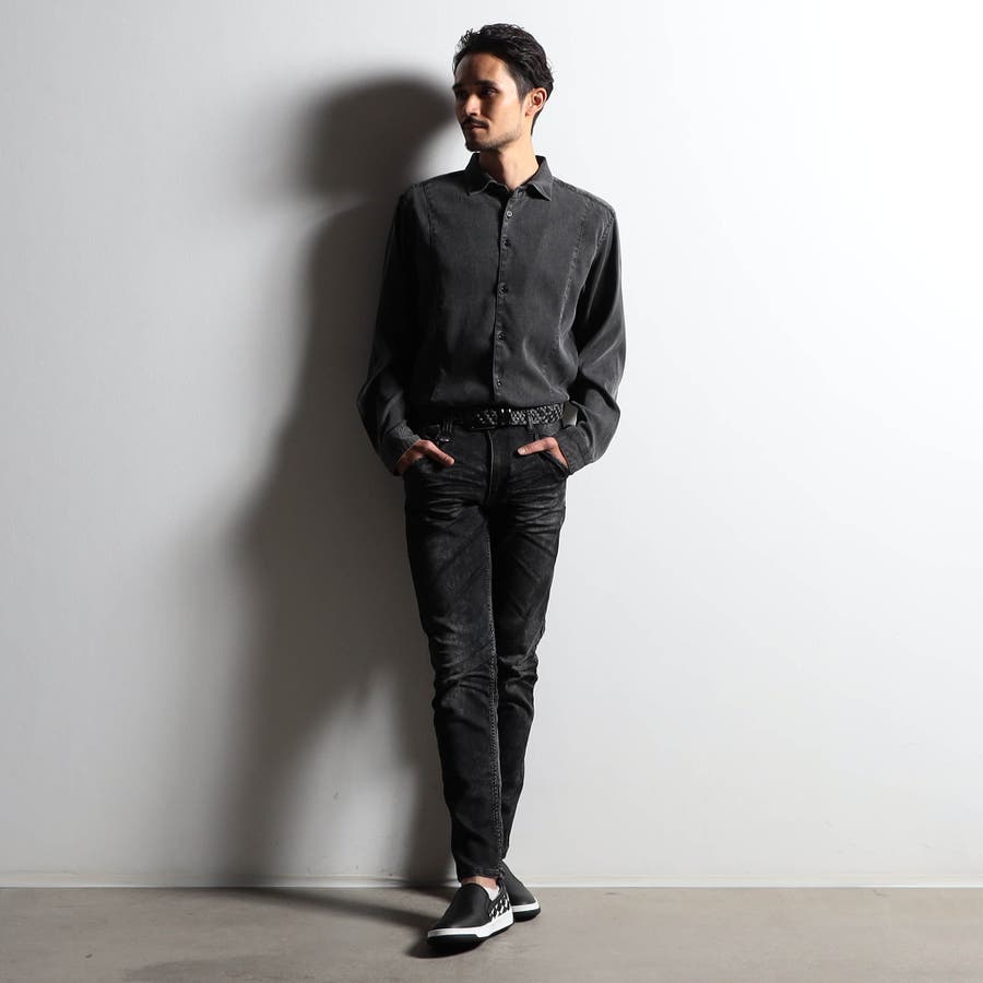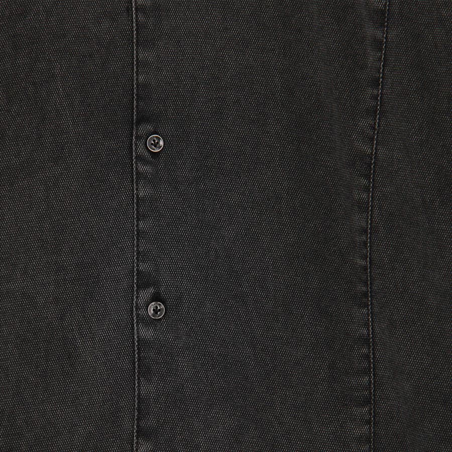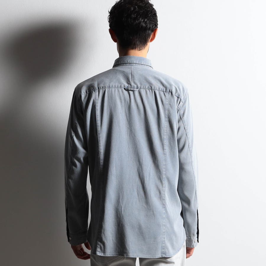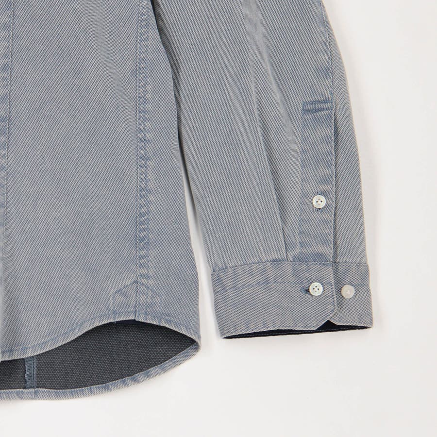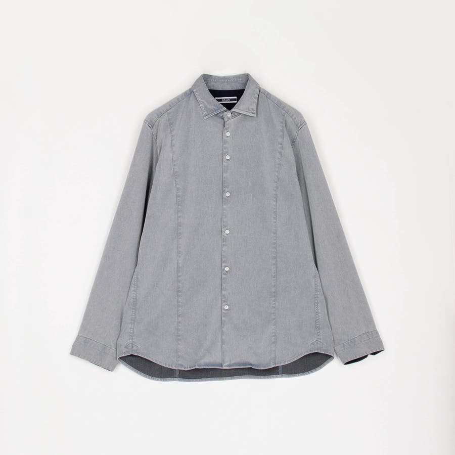 衿の前端にワイヤ-を仕込んだショートホリゾンタルカラ-シャツ。台衿から身頃のつながりを調整、釦を開けた時のVゾーンの見え方を配慮しました。身頃に入れた切り替えデザインでラインをスッキリ見せながら、加工の当たり感をポイントにしています。カフス裏など同色系のストレッチ裏地を使用してちょっとしたアクセントにしています。脇の縫い代には抗菌防臭テープを入れて機能性をプラスしています。
