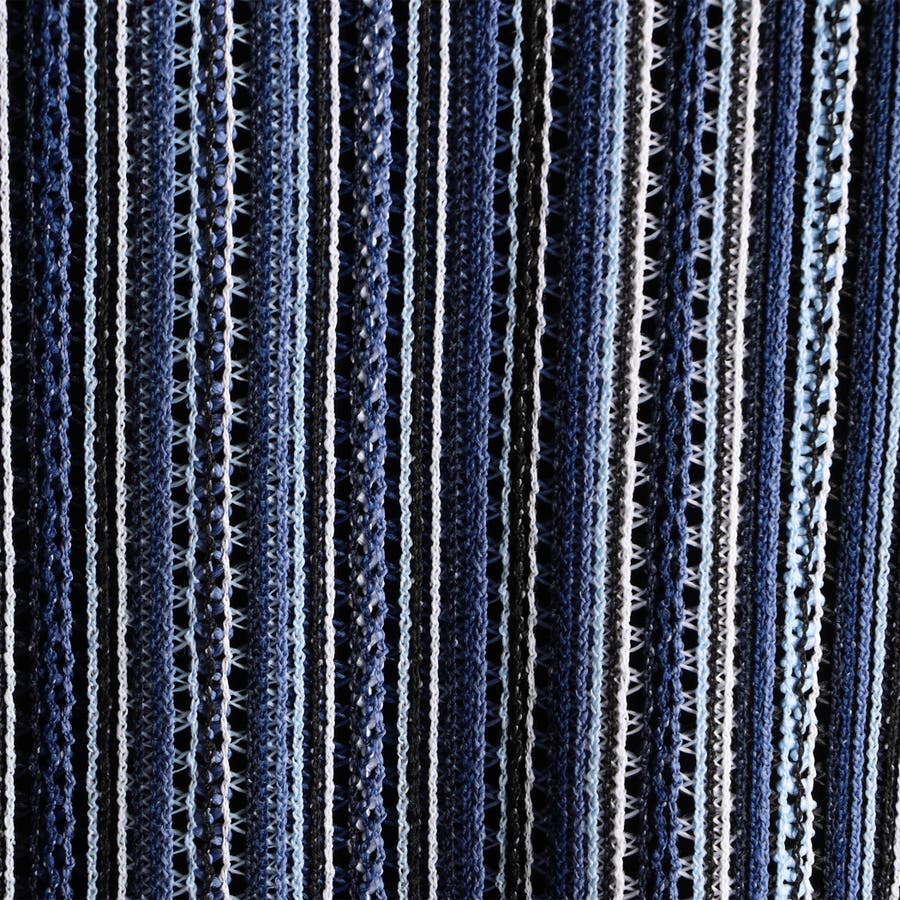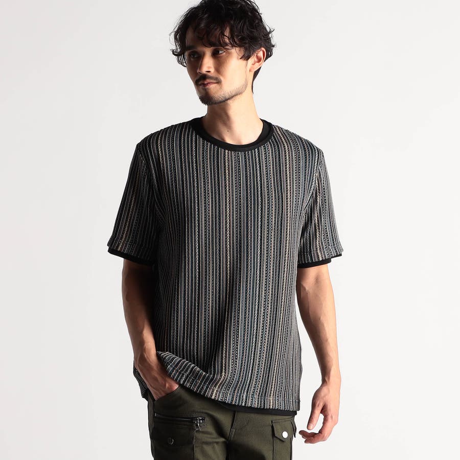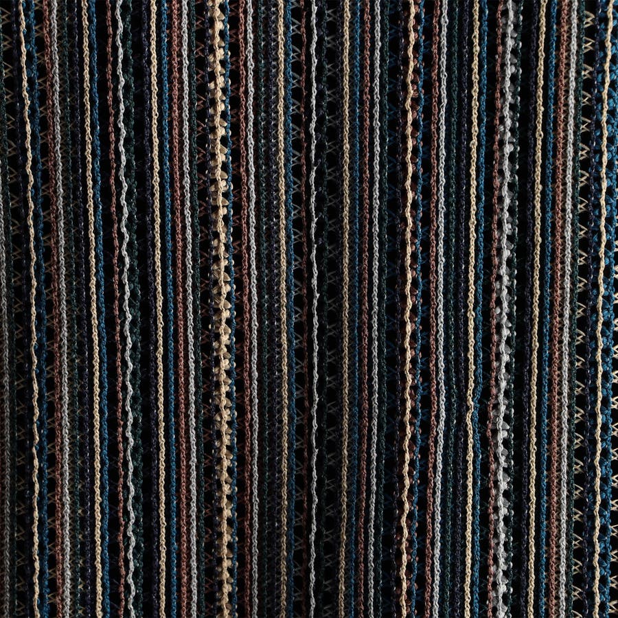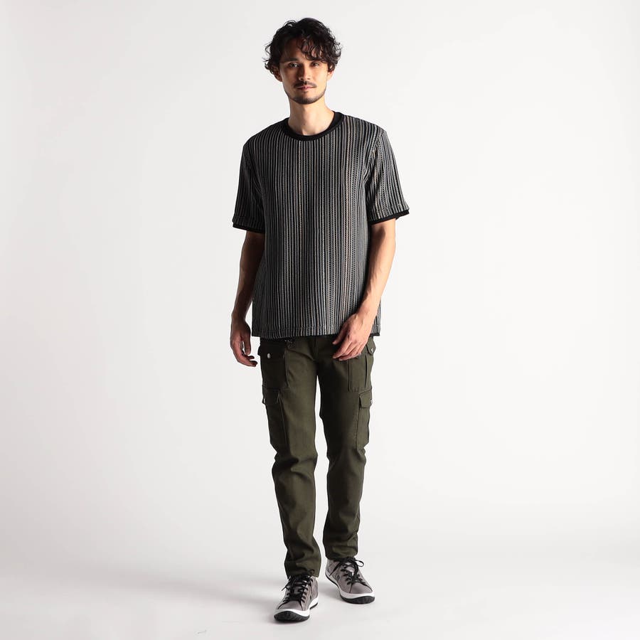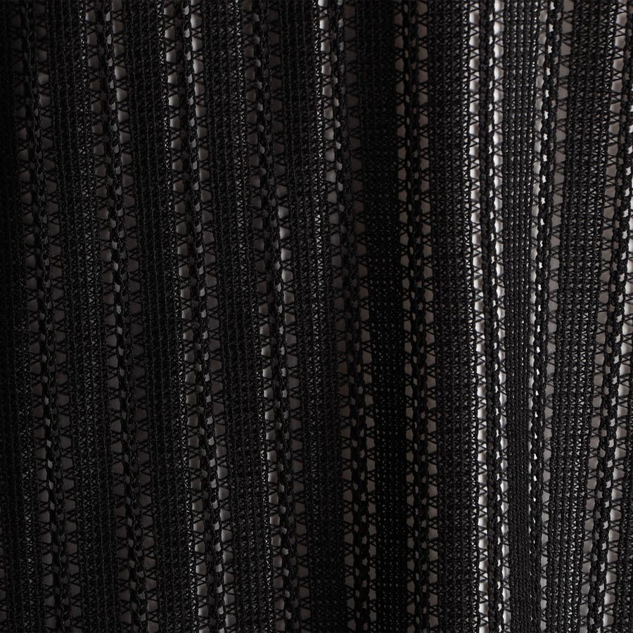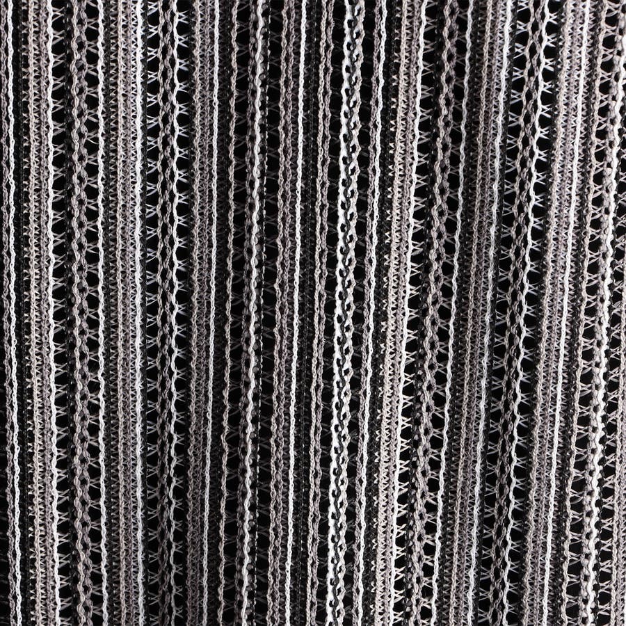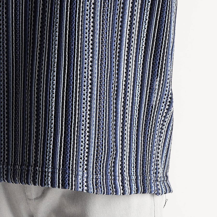 アウターにはタテ編みに編まれたラッセルレース素材を使用。レースの編み目の透け感は見た目にも涼し気な印象。ラッセル編みのニットですので、ストレッチ性も高く、着心地は抜群です。無地(49ブラック)1色と、マルチストライプ(91グレーストライプ、92ブルーストライプ、93グリーンストライプ)3色での展開です。インナーにはレイヤードする事を考え、薄手のポリエステル天竺素材を使用。薄く、通気性の高い素材感は夏でも快適に着用頂けます。