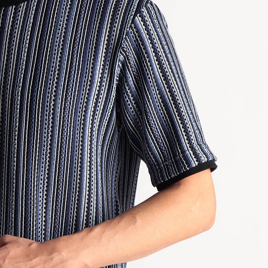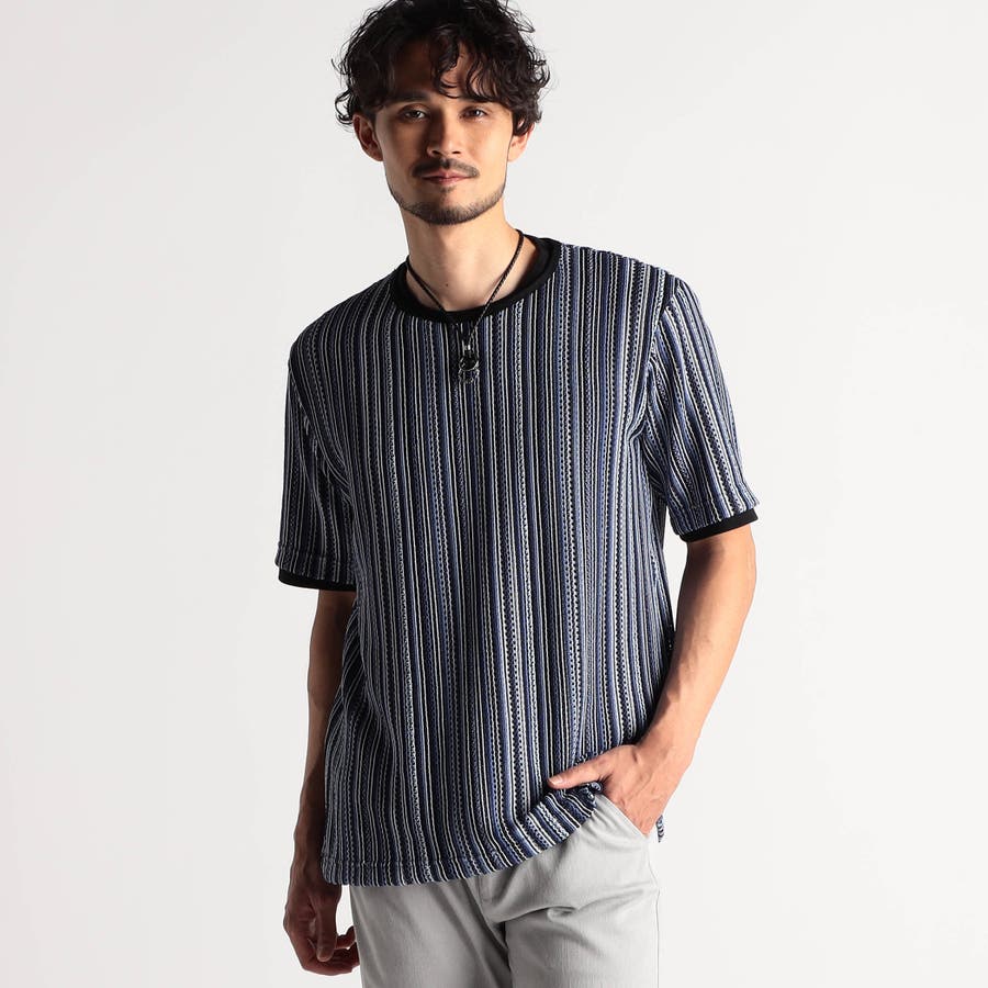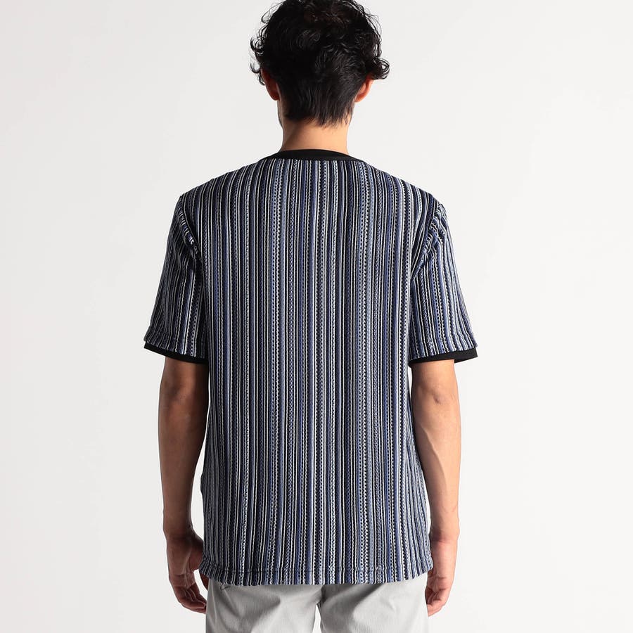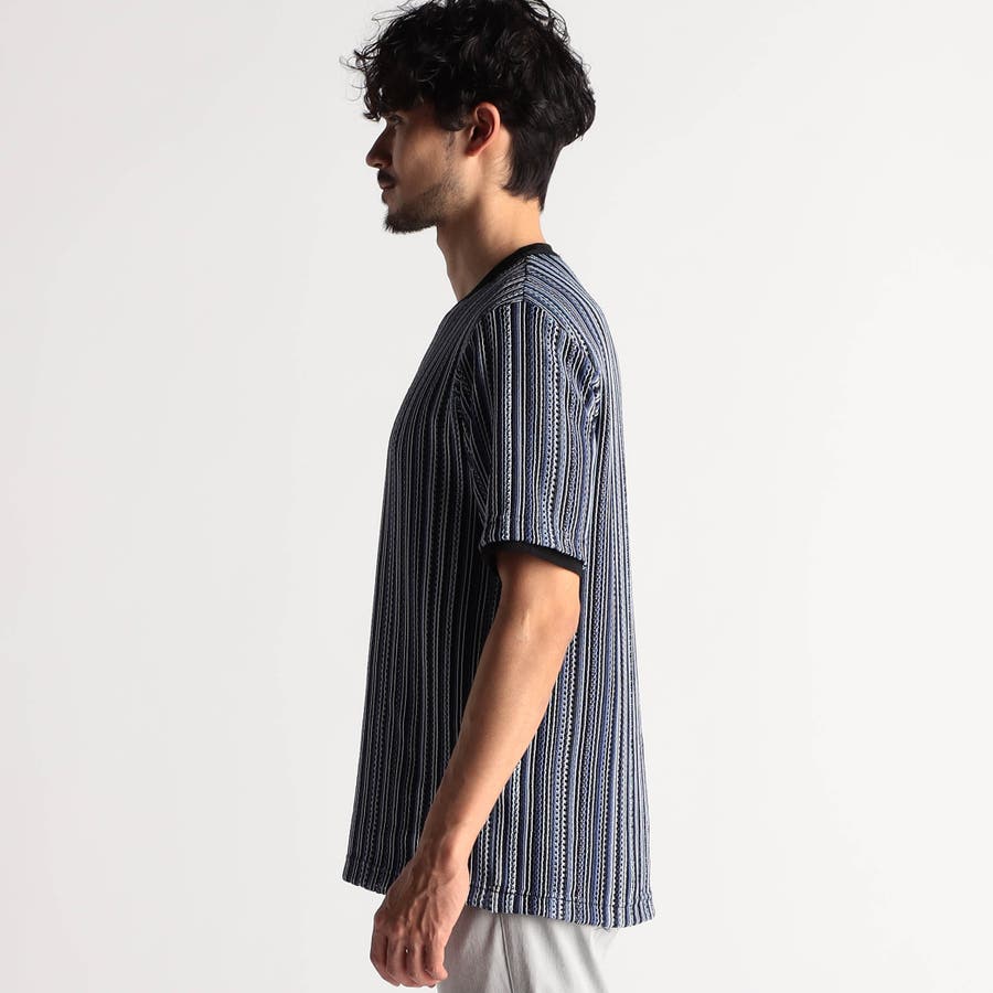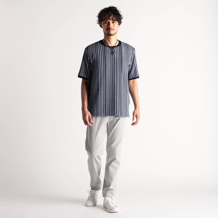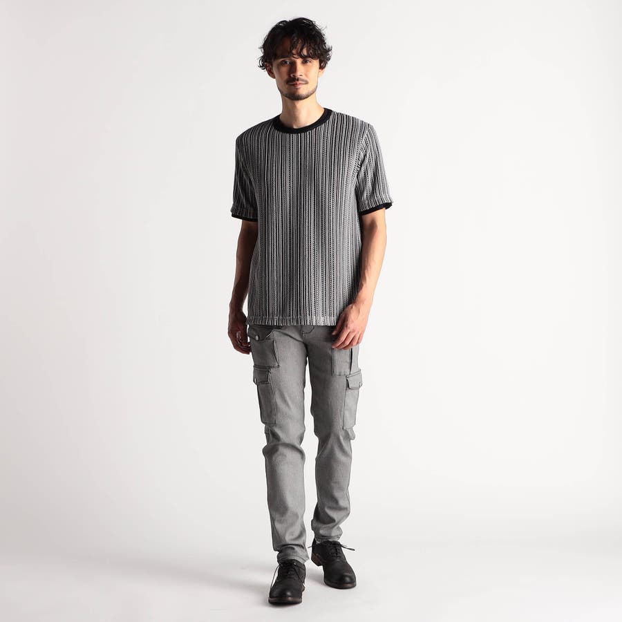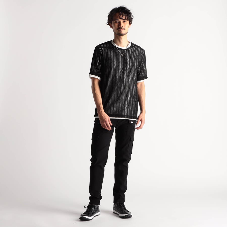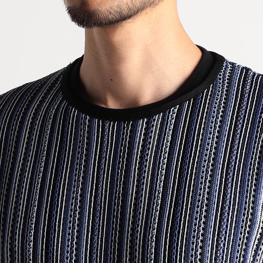 アウターにはタテ編みに編まれたラッセルレース素材を使用。レースの編み目の透け感は見た目にも涼し気な印象。ラッセル編みのニットですので、ストレッチ性も高く、着心地は抜群です。無地(49ブラック)1色と、マルチストライプ(91グレーストライプ、92ブルーストライプ、93グリーンストライプ)3色での展開です。インナーにはレイヤードする事を考え、薄手のポリエステル天竺素材を使用。薄く、通気性の高い素材感は夏でも快適に着用頂けます。
