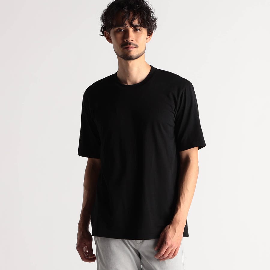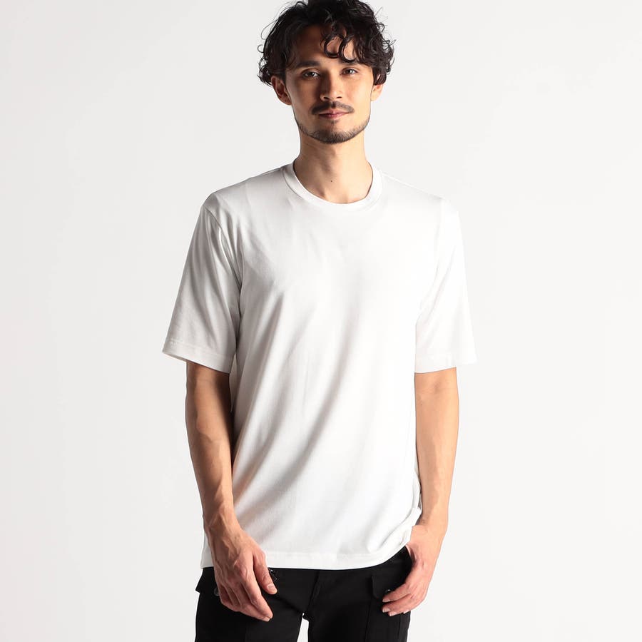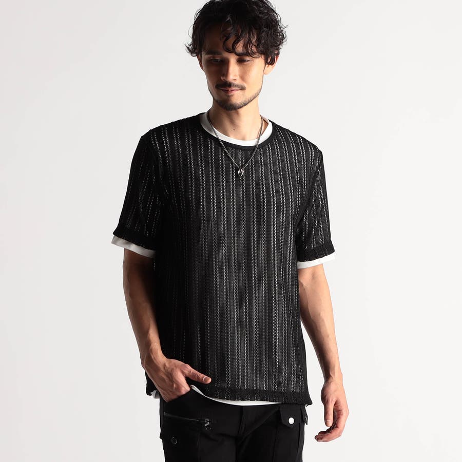 アウターのラッセルTシャツとインナーの無地Tシャツセットのアンサンブル。アウターのラッセル素材の下から見える無地Tシャツの透け感が印象的な商品です。アウターのTシャツの衿ぐりをバインダー始末にする事でスッキリと仕上げました。インナー、アウターの寸法を微妙に変える事で、綺麗にレイヤード出来るようにしております。
