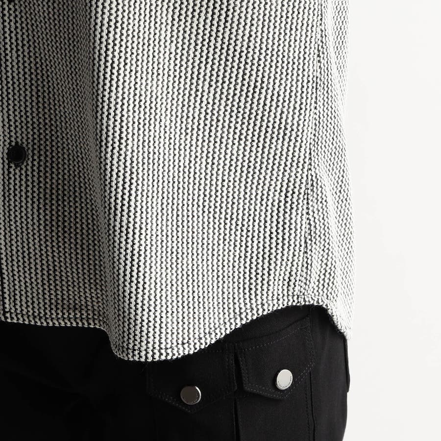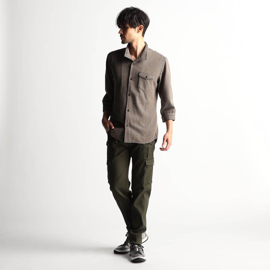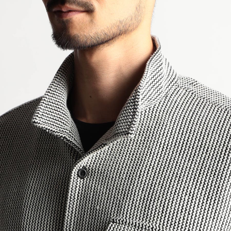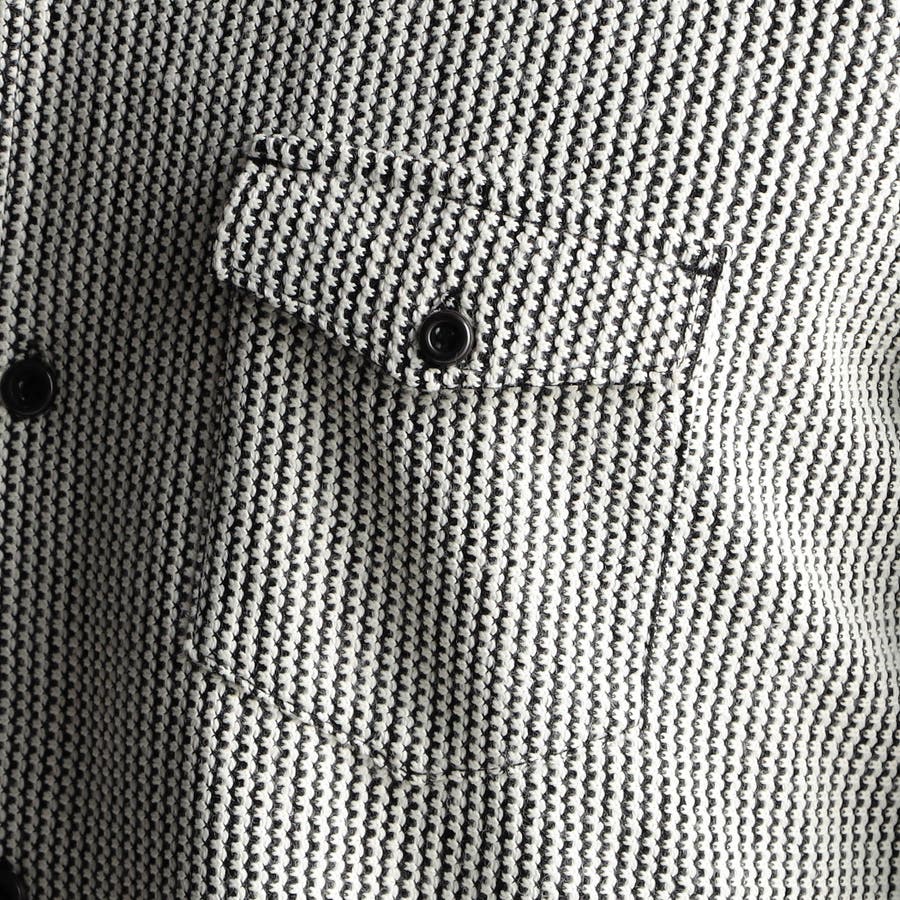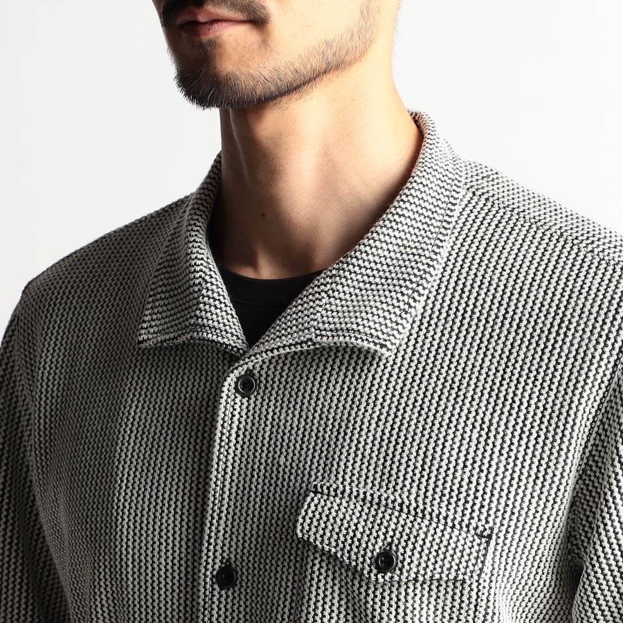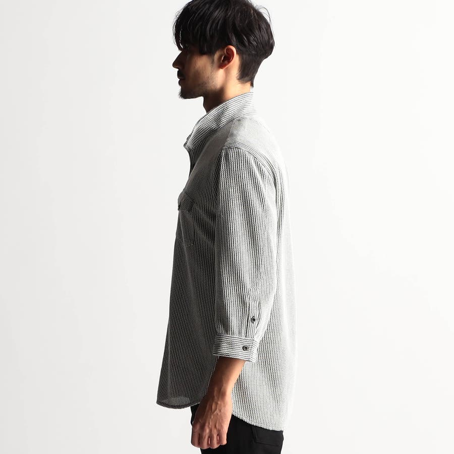 衿端まで止められるスタンドカラーが特徴的なフラップパッチデザインのシャツ。やや大きめのロゴ入りボタンを使用し、春の羽織を意識したシャツブルゾン風に仕上げています。