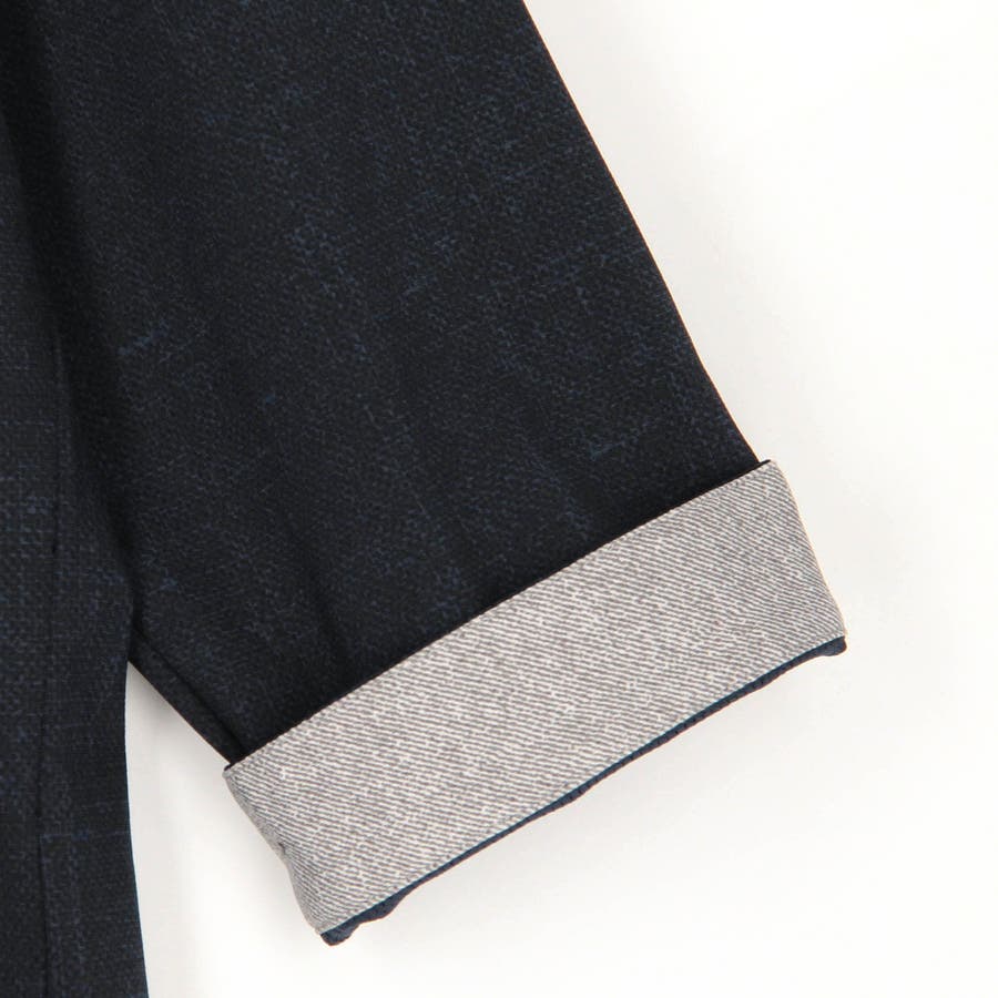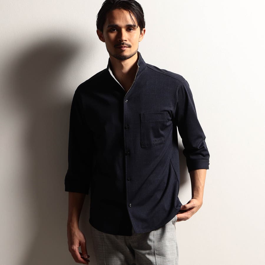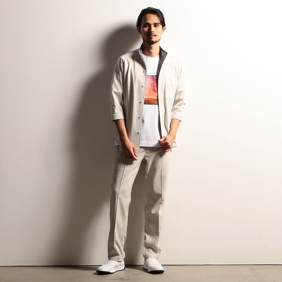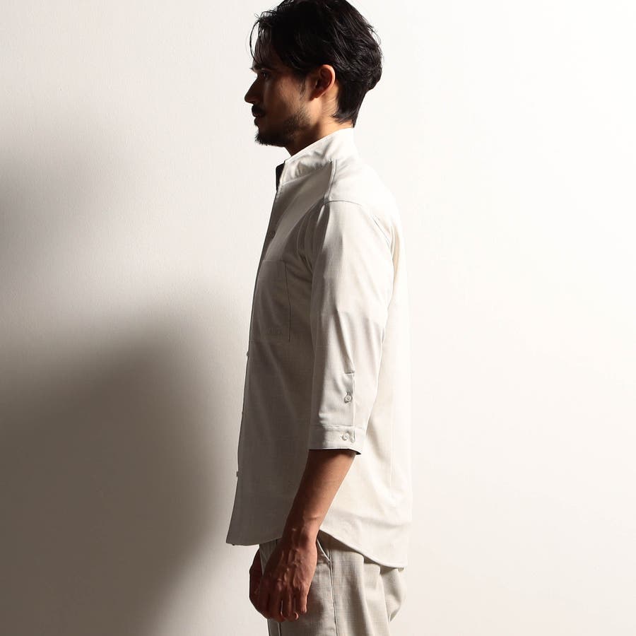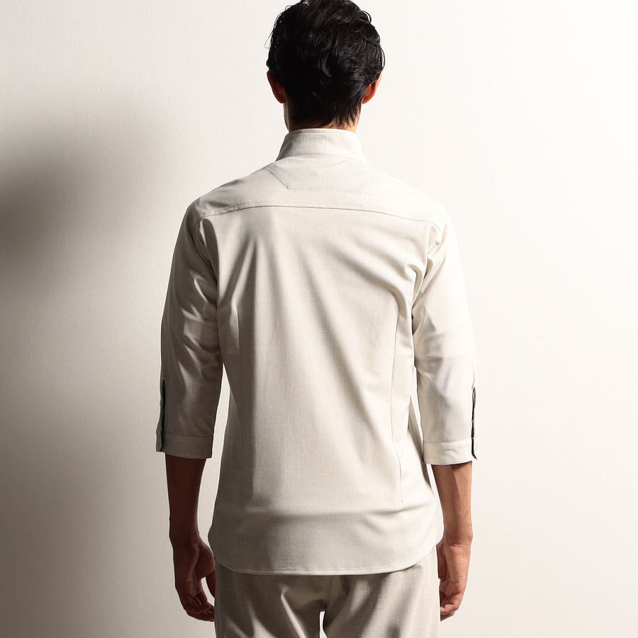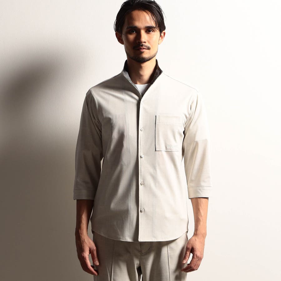 袖丈が肘下7分丈のスタンドカラーカットシャツ。衿端にワイヤーを入れ、折り返しても着用できるようにしています。メッシュ調の清涼感ある国産カスレ調プリントカットソー素材を使用し、身返しや袖口裏には同素材でプリント違いの生地を配して着用時のアクセントにしています。左胸のパッチポケット、ロゴ刺繍や別注釦、脇の縫い代には抗菌防臭テープを仕込んで機能性をプラスしています。