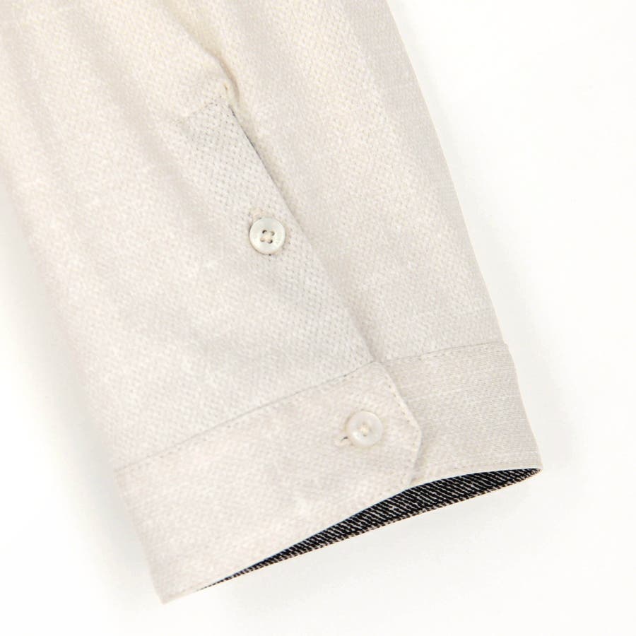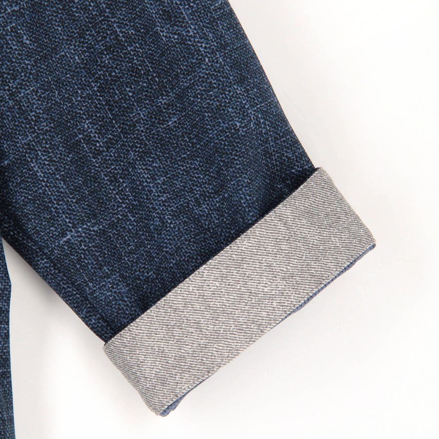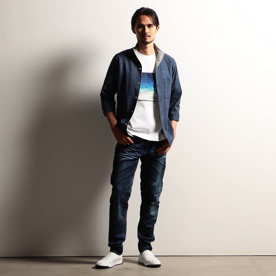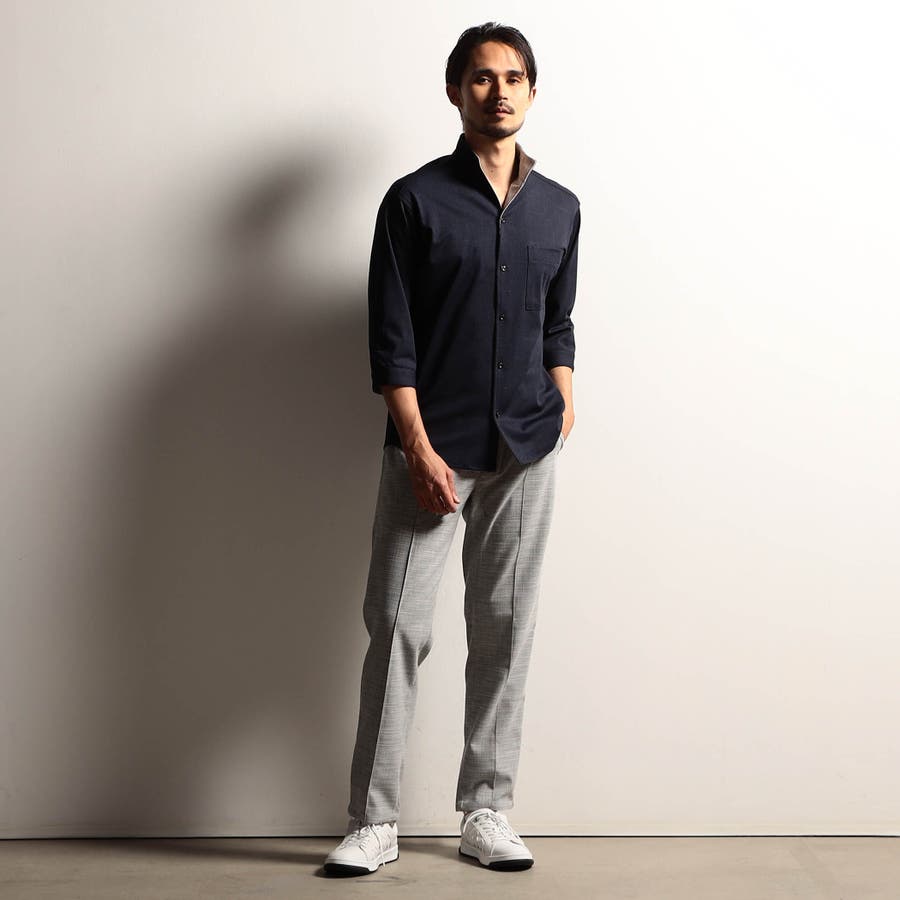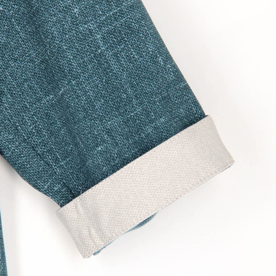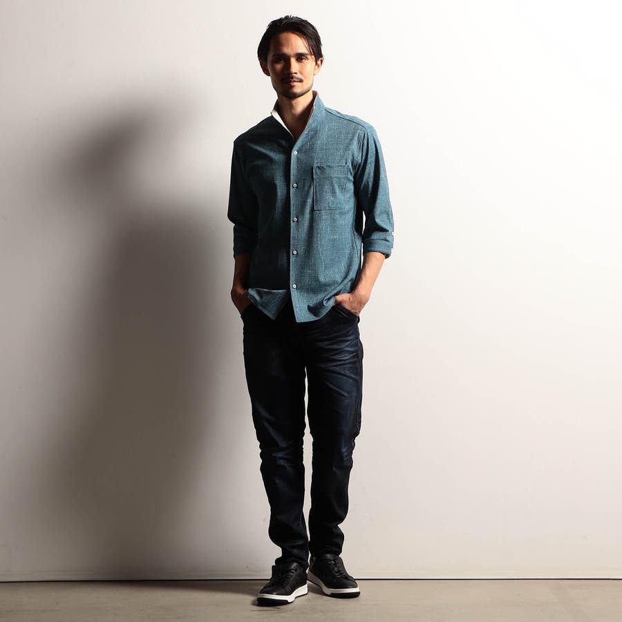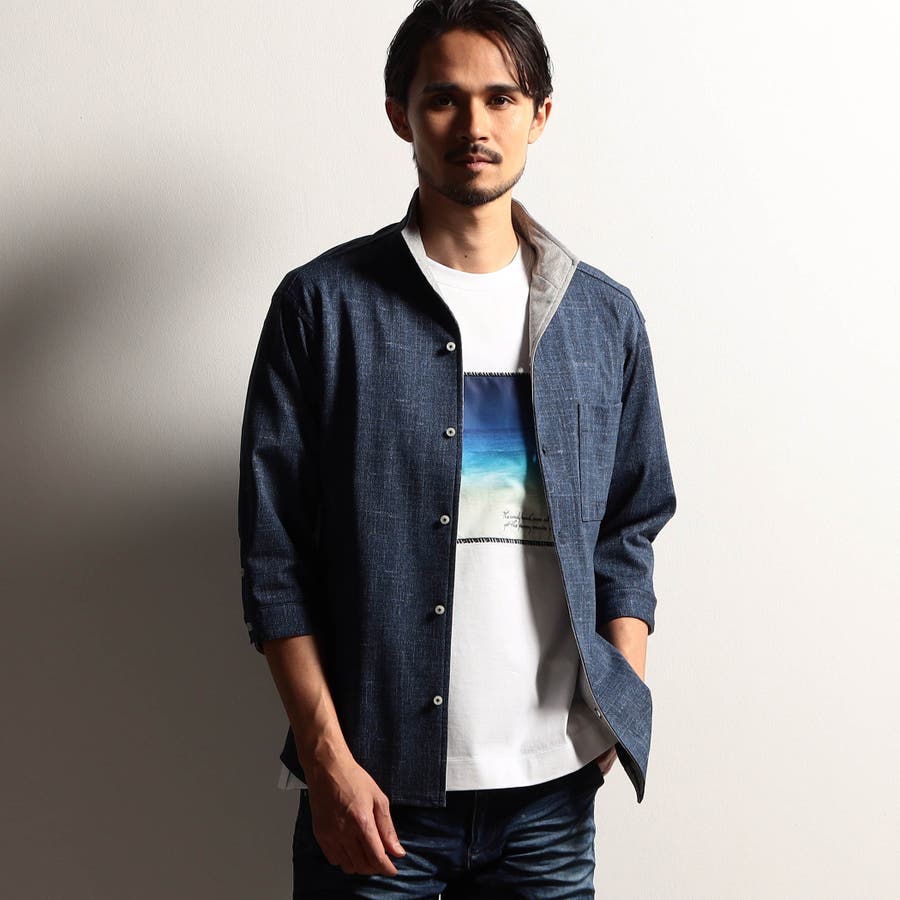 袖丈が肘下7分丈のスタンドカラーカットシャツ。衿端にワイヤーを入れ、折り返しても着用できるようにしています。メッシュ調の清涼感ある国産カスレ調プリントカットソー素材を使用し、身返しや袖口裏には同素材でプリント違いの生地を配して着用時のアクセントにしています。左胸のパッチポケット、ロゴ刺繍や別注釦、脇の縫い代には抗菌防臭テープを仕込んで機能性をプラスしています。