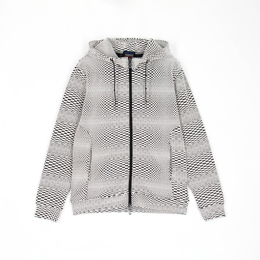 インパクトの強い幾何学柄を無地とモノト-ンで表現する事で大人綺麗目なモ-ドテイストに仕上げています。切替を生かしたシームポケット、ブランドロゴを繊細にプリントしたスピンドルがデザインポイントのフルZIPフーデッドパーカ。冬はコートの下に着用しても着ぶくれせず、春先にはTシャツの上に羽織るのに丁度よい肉厚感とサイズ感に仕上げました。