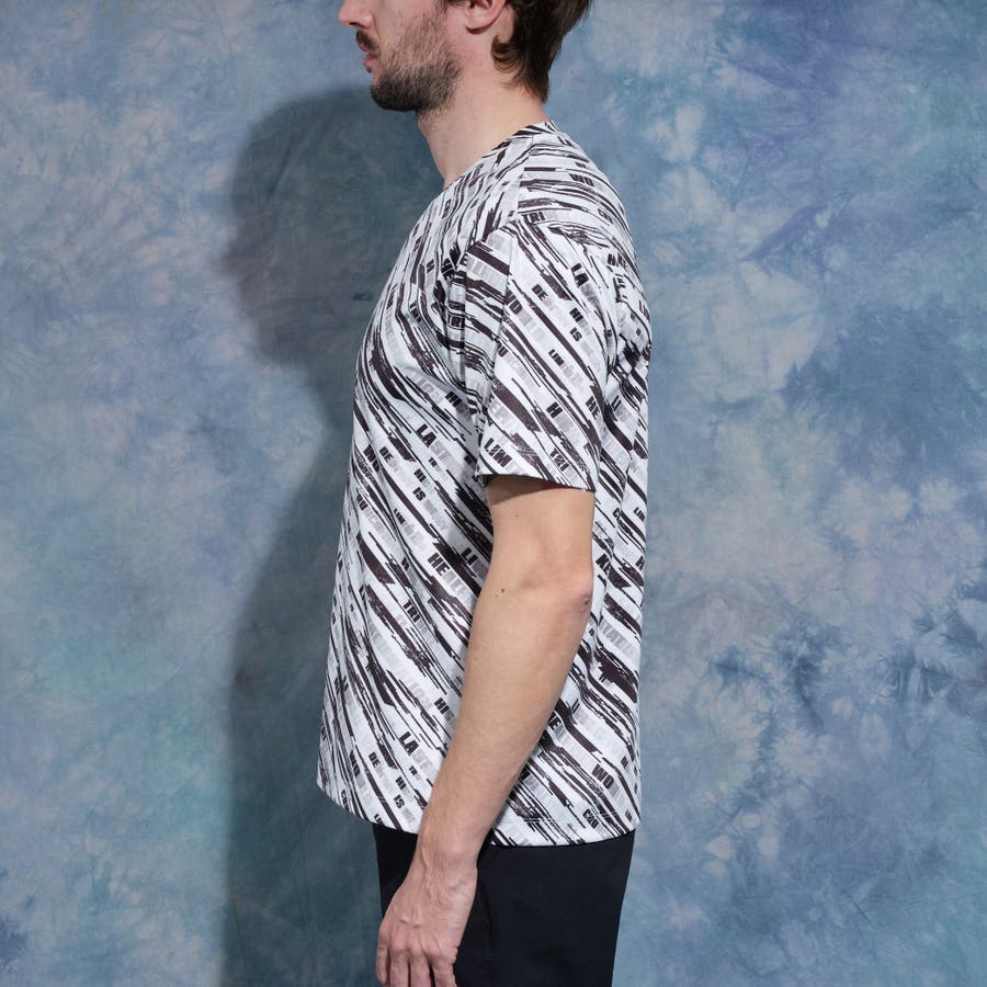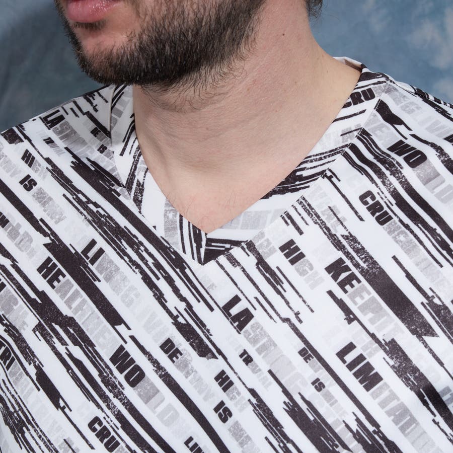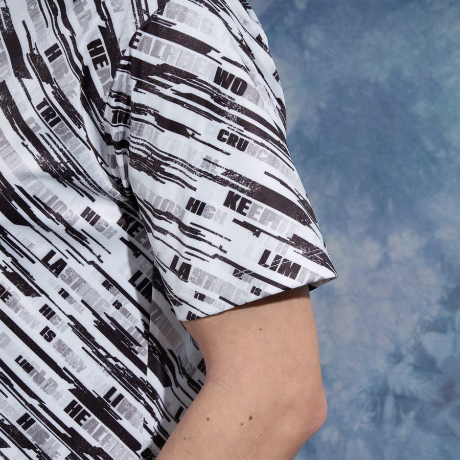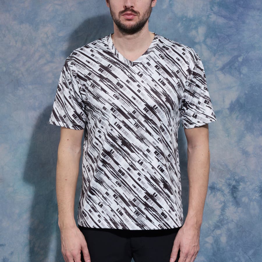 ポンチ素材にバイヤスのグラデーションロゴ&カスレ調のランダムストライプ柄の昇華転写プリントを施した一際目を惹く、Vネックプルオーバーになります。