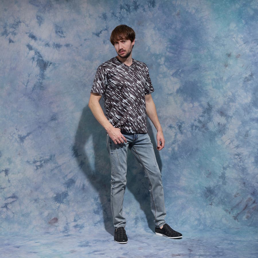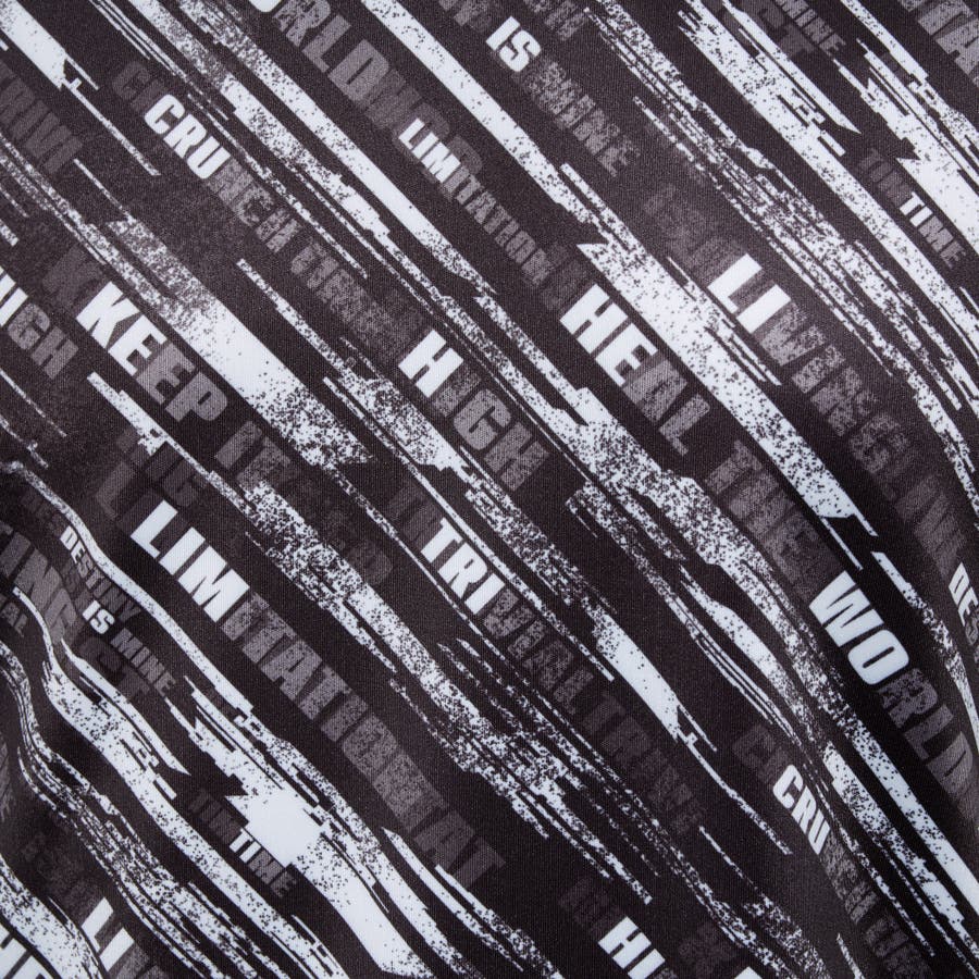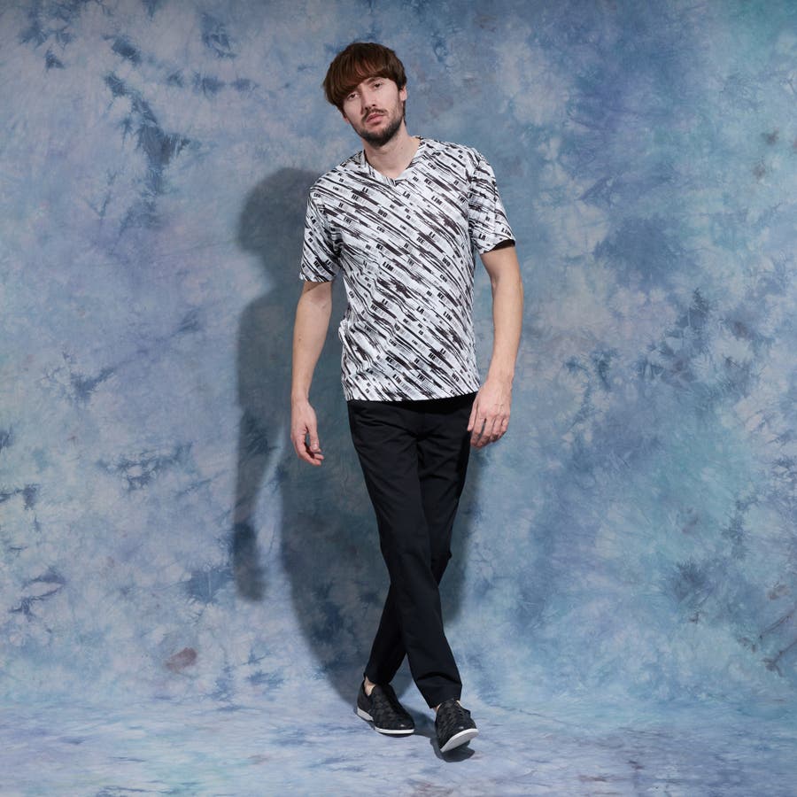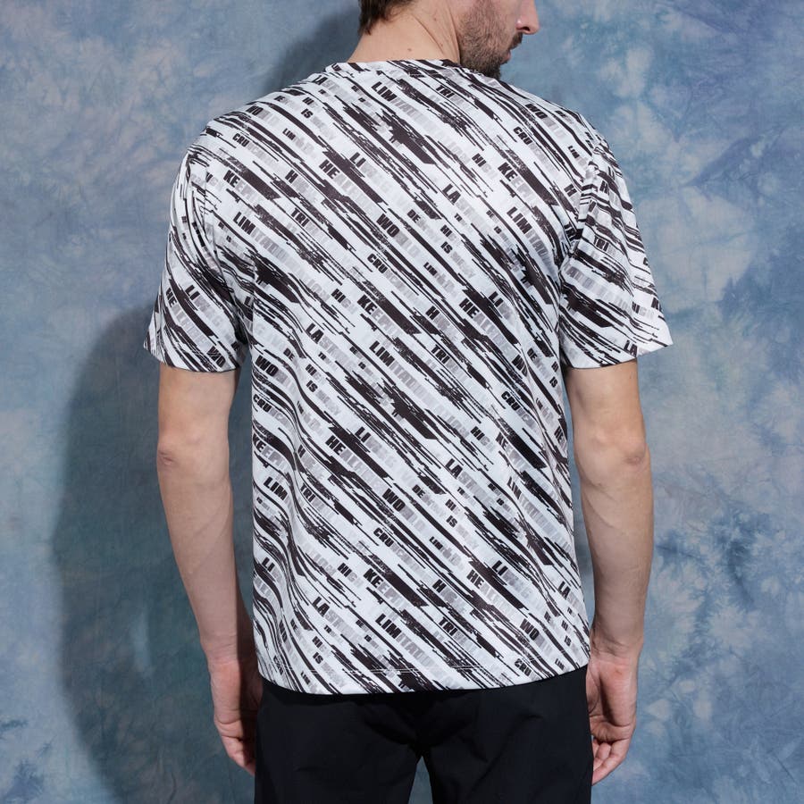 ポンチ素材にバイヤスのグラデーションロゴ&カスレ調のランダムストライプ柄の昇華転写プリントを施した一際目を惹く、Vネックプルオーバーになります。