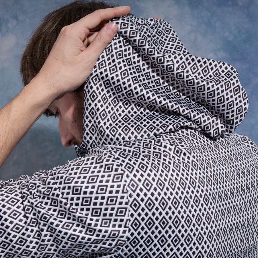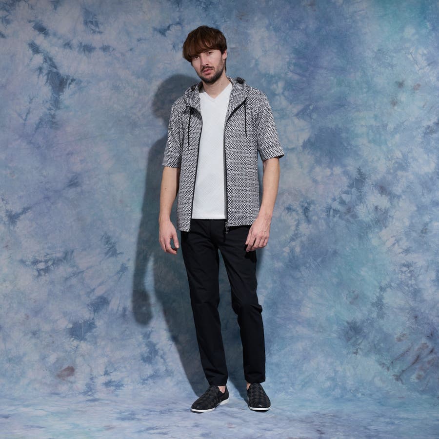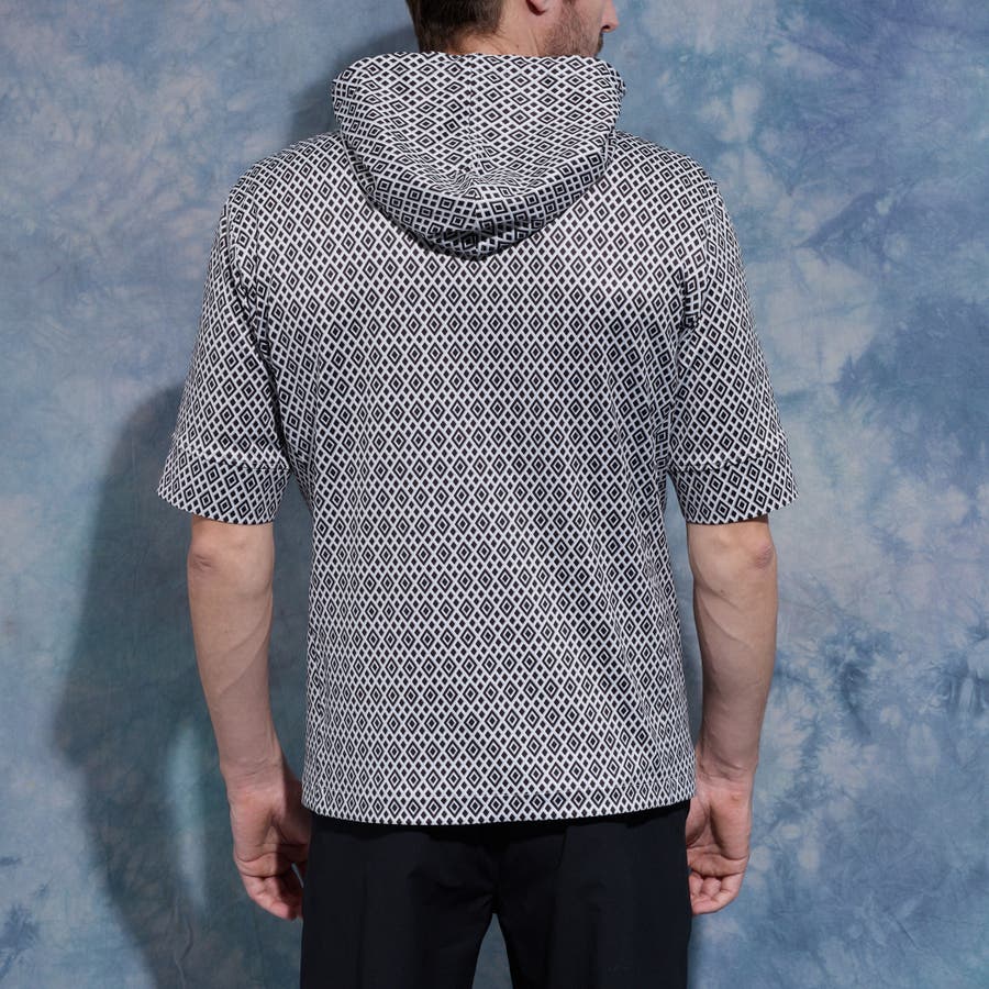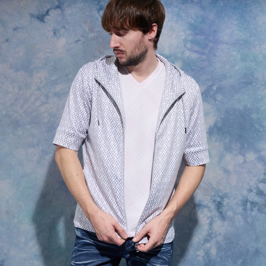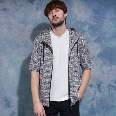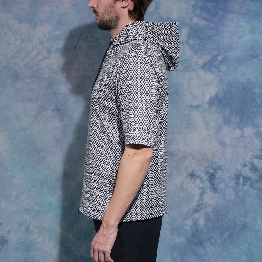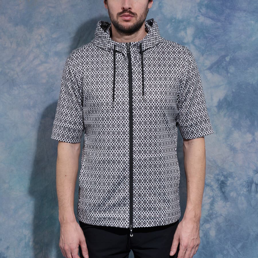 ポンチ素材に多配色ジオメトリック柄の昇華転写プリントを施した一際目を惹く、フルZIP半袖フードパーカーになります。