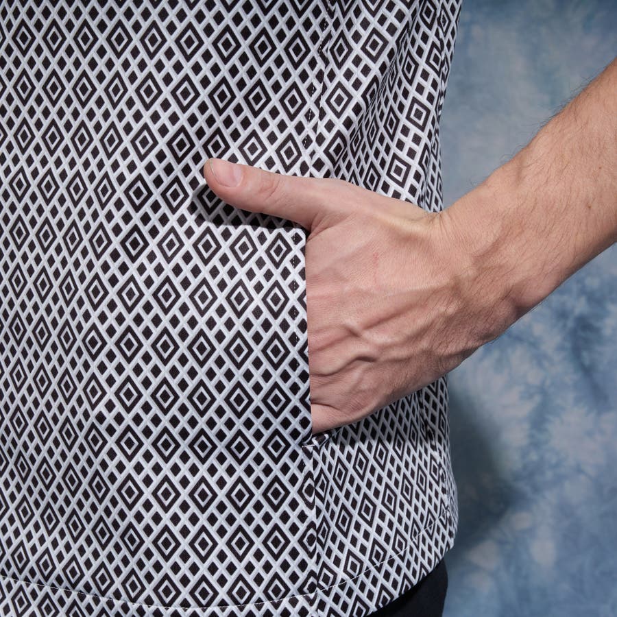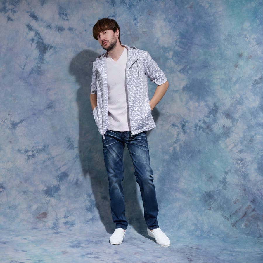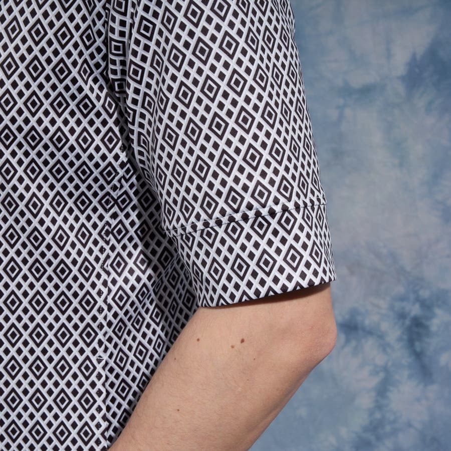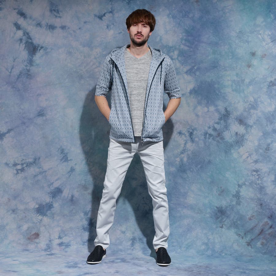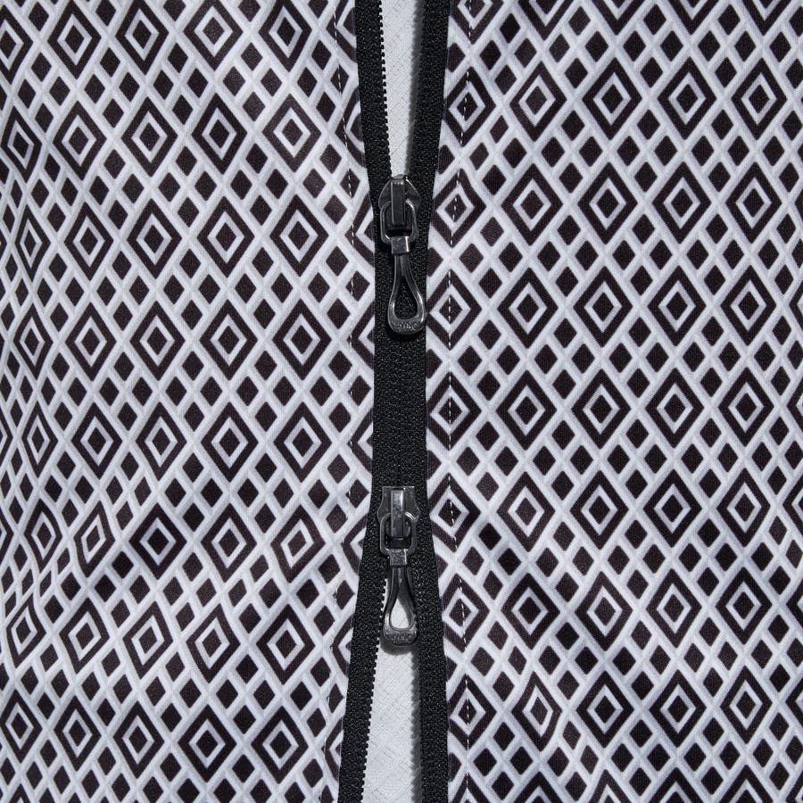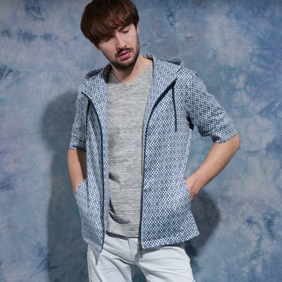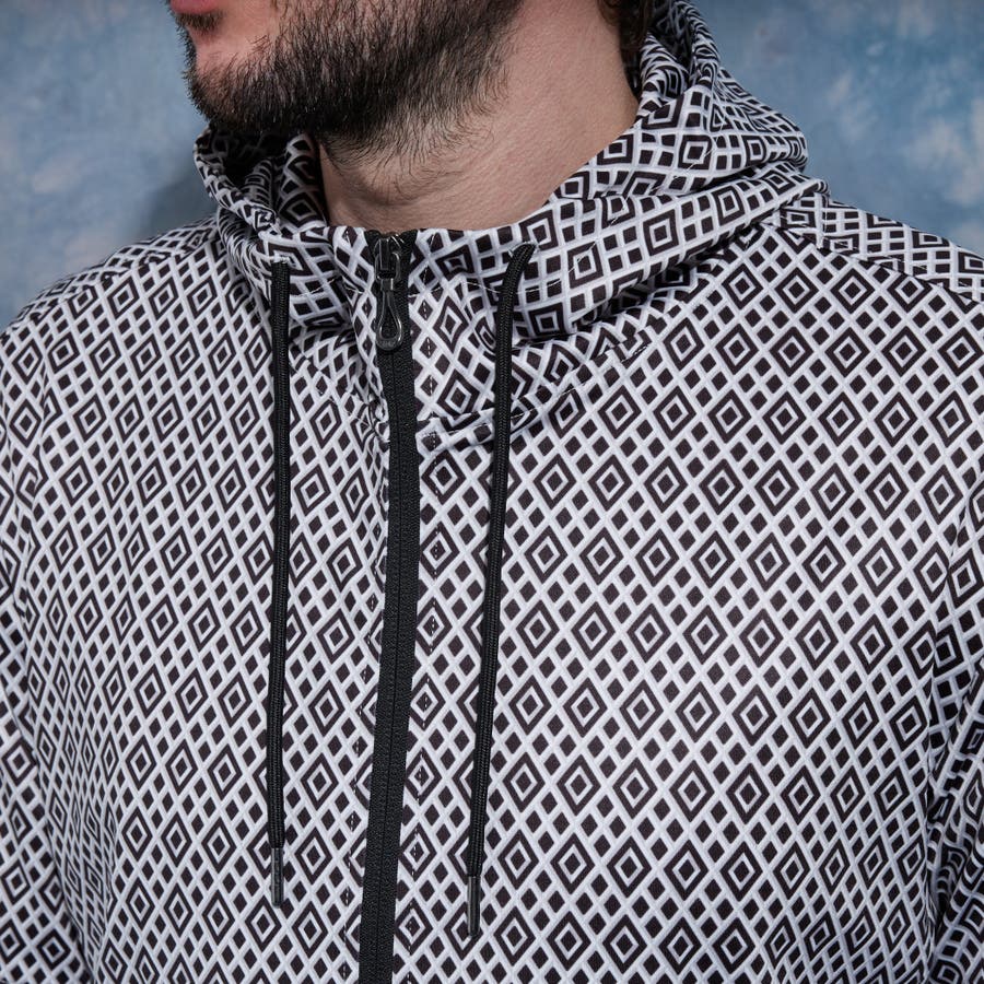 ポンチ素材に多配色ジオメトリック柄の昇華転写プリントを施した一際目を惹く、フルZIP半袖フードパーカーになります。