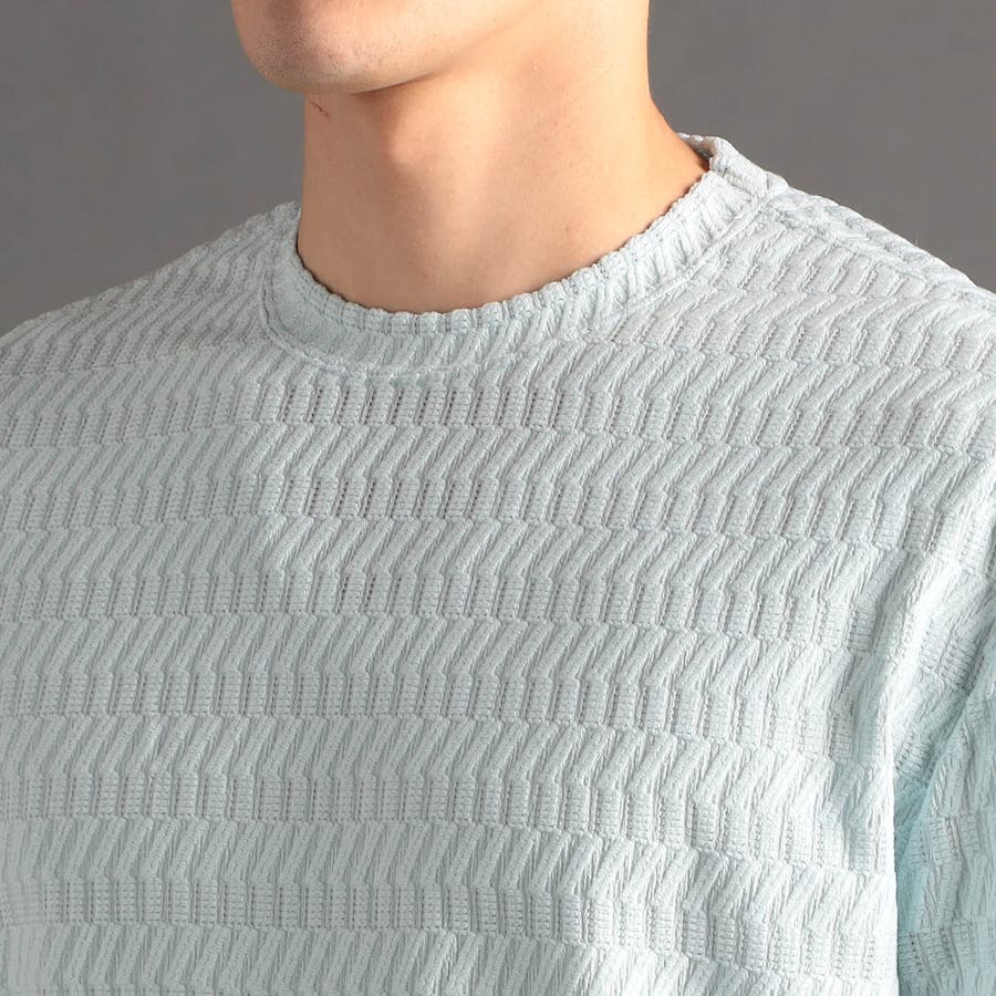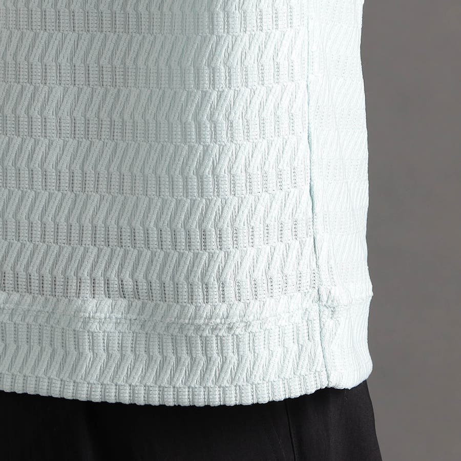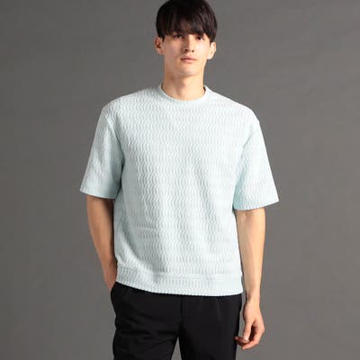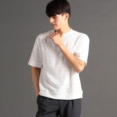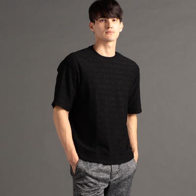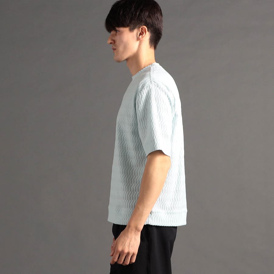 ポリエステルにポリウレタンをMIXしたジオメトリックジャカードニット。程よい肉感にメッシュを編成した通気性にも優れたニットです。