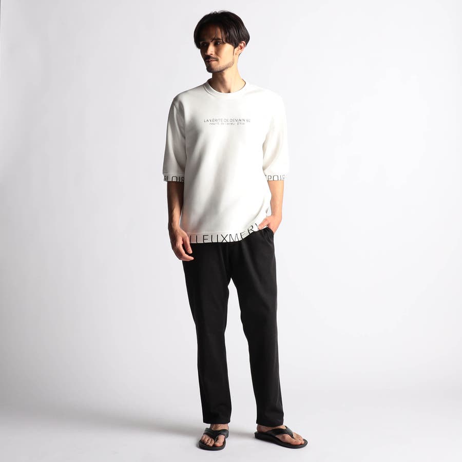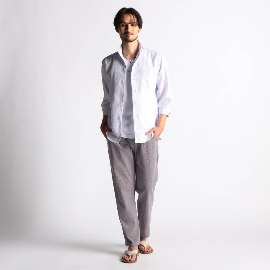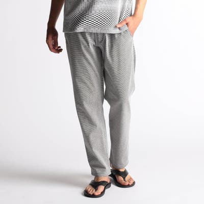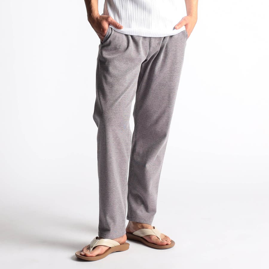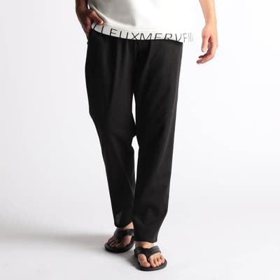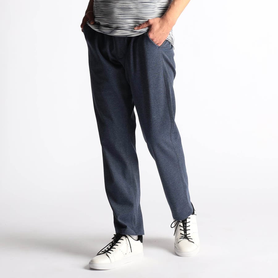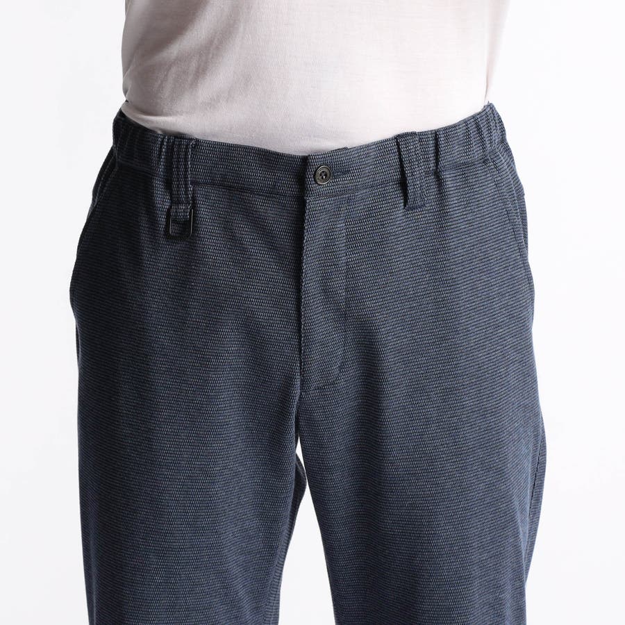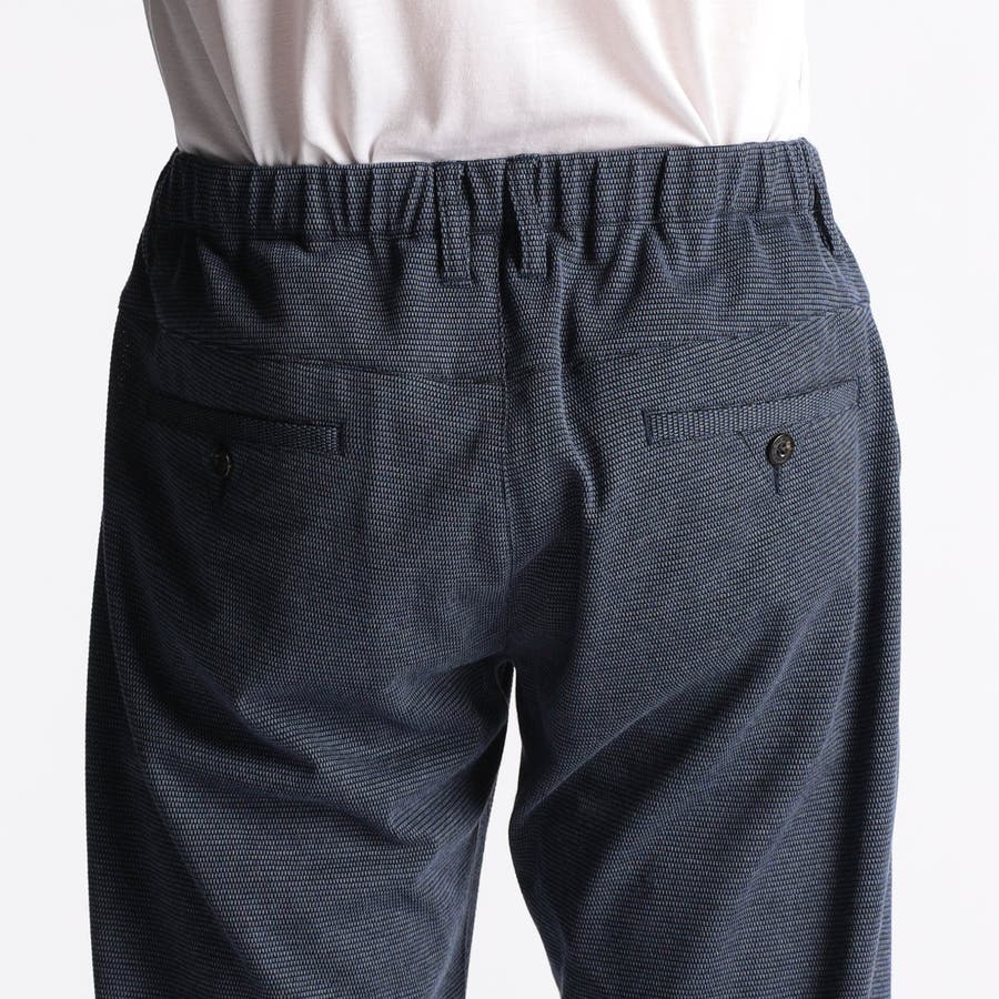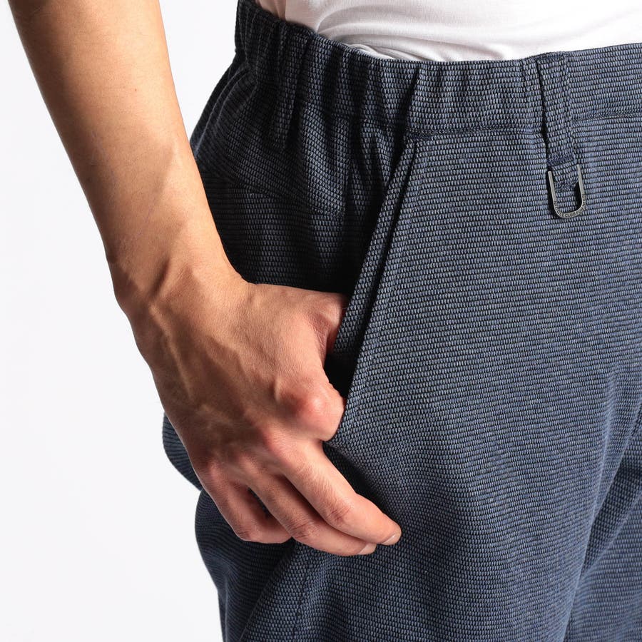 ウエストベルトには平ゴムとスピンドルを通していますのでサイズ調整をしやすくしたイージーパンツ仕様。腰回りから太ももは程良い太さで、裾口にかけて細くテーパードしたシルエットのノータックパンツになります。股下は少し短い8分丈設定です。