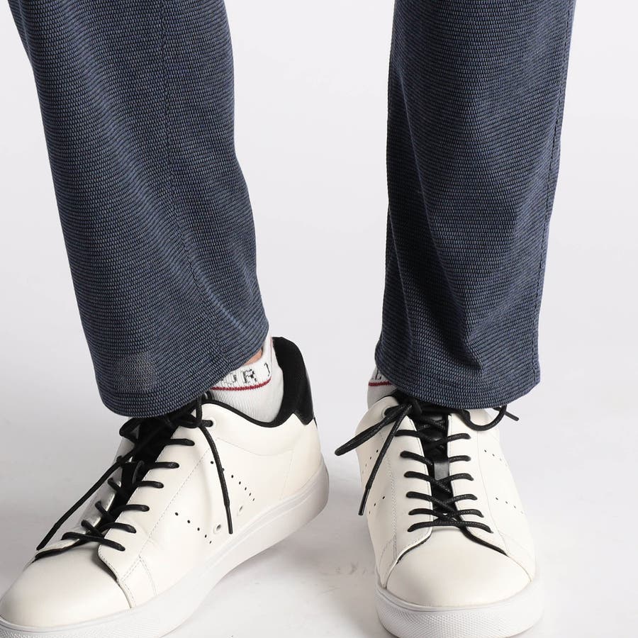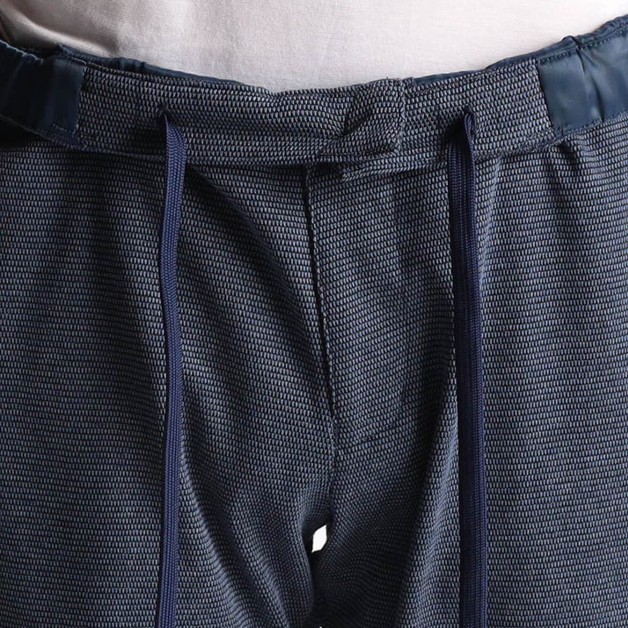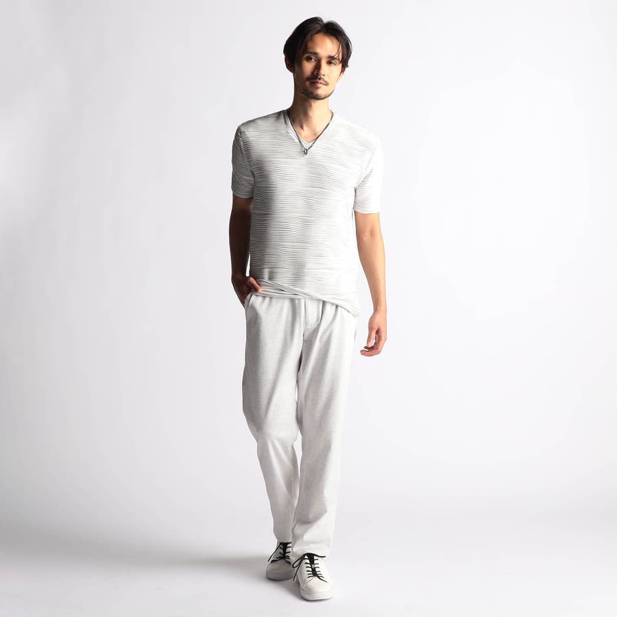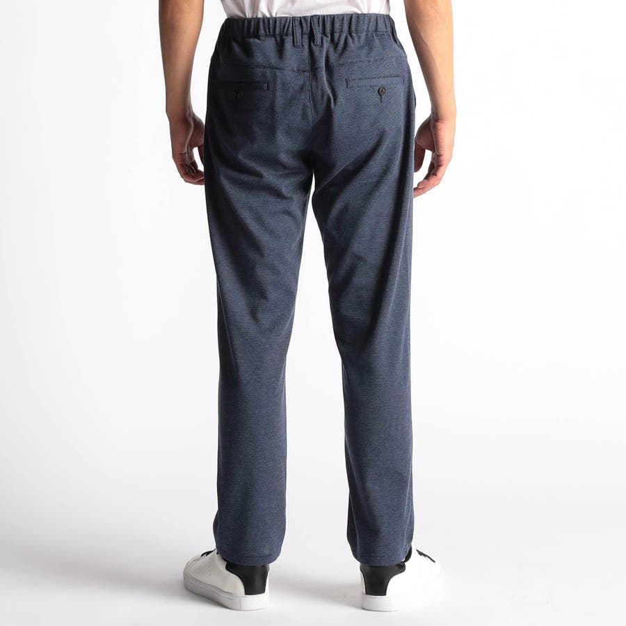 イージーパンツ仕様のスラックスデザイン。裏側の別布はストレッチ裏地を使用して、全体を軽く仕上げ、サラッとした肌触りと表地に追従する様に馴染みを良くしています。右脇ポケットには少し大きめのモバイルポケットを作っています。19ライトグレーのみ膝裏を付けて透け防止にしています。