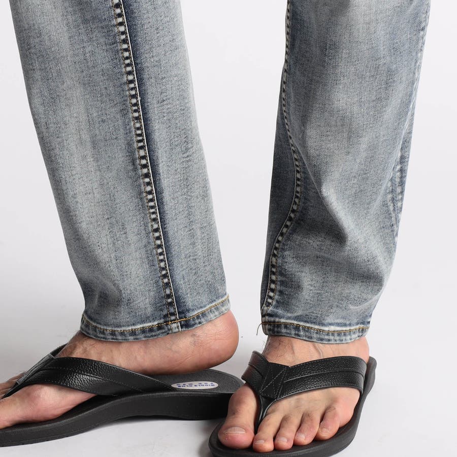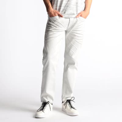膝から裾口にかけて少しストレートなシルエットに設定、全体的には細身のサイズ感です。股下は8分丈で裾上げしなくても、そのまま履ける設定にしています。