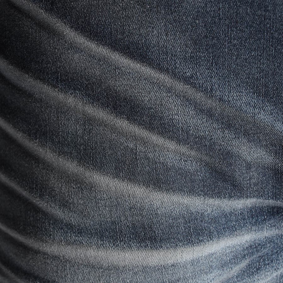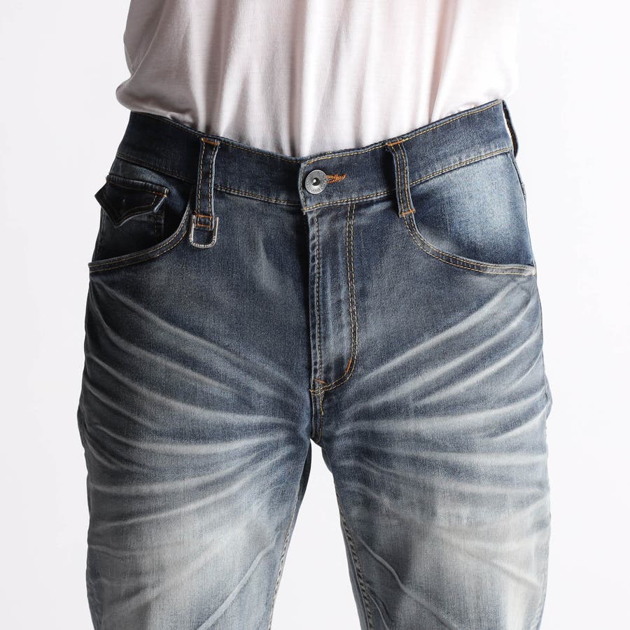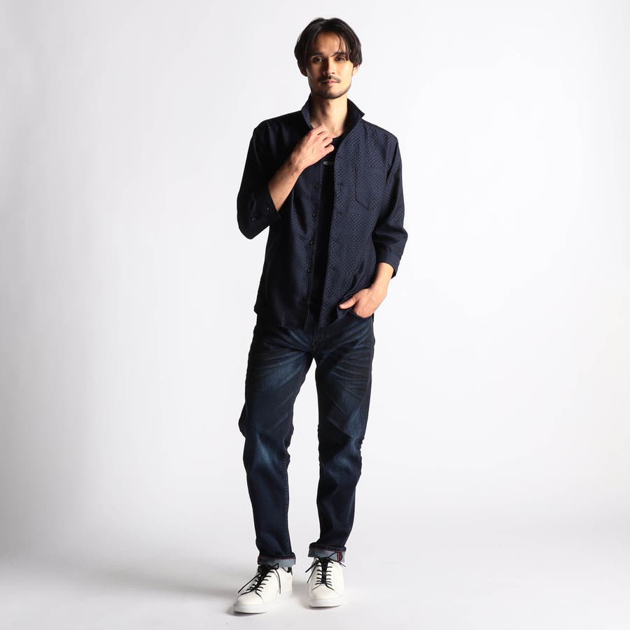09ホワイトは製品洗いと撥水加工を施して洗い晒し感の雰囲気ある印象に仕上げ、前股・太もも内側・脇・膝裏に3Dシワ加工を施しています。64サックスは全体的にブリーチ加工を施し、フェードしたブルーカラーにリアルユーズド加工をプラスしています。67ネイビーはブラスト加工で色差をしっかり出したユーズド加工後、黒のオーバーダイ加工で全体を濃く仕上げ、更に3Dシワ加工、黒顔料の吹き付け加工を施してシワに陰影感をつけています。