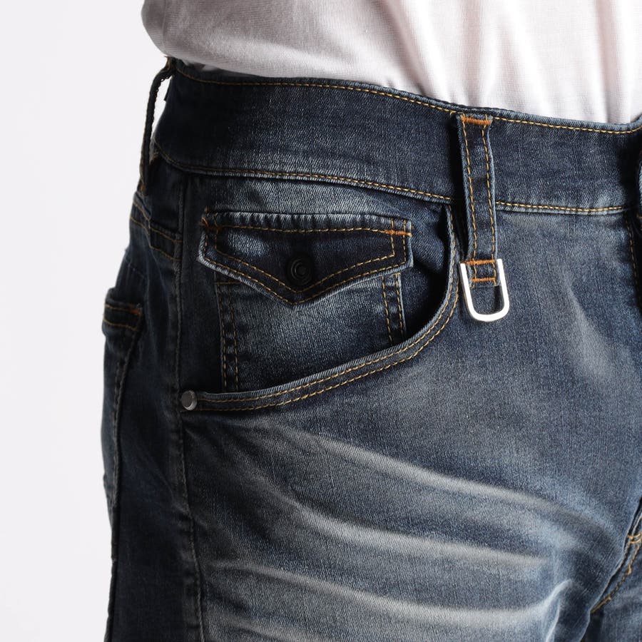 右前のフラップ付コインポケットをアクセントにした5ポケットデザイン。素材にあわせてウエストベルトも少し伸びる様に縫製しています。裏側、ストレッチ裏地を別布に使用していますので穿き着心地も抜群です。配色ステッチなどデニムらしい仕様にこだわった作りにしています。