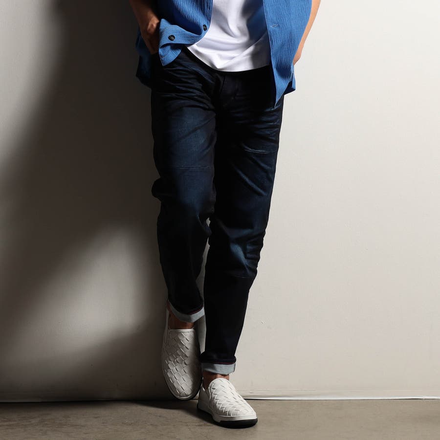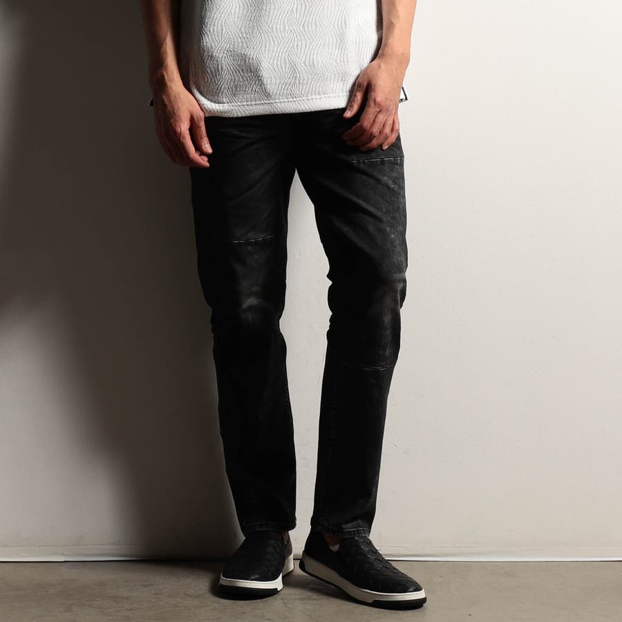 最終の製品加工を岡山のデニム専門の加工所(Wellsウェルズ)に依頼。中国で縫製後、ユーズド加工を施し、全体のサイズ感を調整しています。国内で最終加工、顔料を混ぜた樹脂コーティング剤を部分的吹き付け、所々アイロンでしっかり抑える事で縫い代の厚みがある部分や平たい部分に光沢を出してコーティングパンツの様な質感に仕上げます。最後に立体的でリアルな3Dシワ加工を施し、更に陰影感をつける様に顔料を吹き付けています。