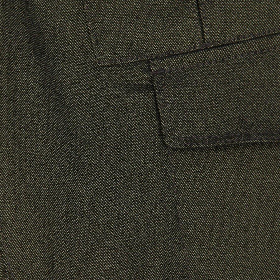 アシンメトリーなデザインのカーゴポケットパンツ。ふくらはぎ位のクロップドパンツ(七分丈)で、切り替えを利用した立体的なシルエットが特徴です。素材にあわせてウエストベルトも少し伸びる様に縫製、裏側の別布にストレッチ裏地を使用していますので穿き着心地も抜群です。オリジナルのボタンやDカンを使用し、腰裏の刺繍や革ネームなど細かい部分までこだわっています。