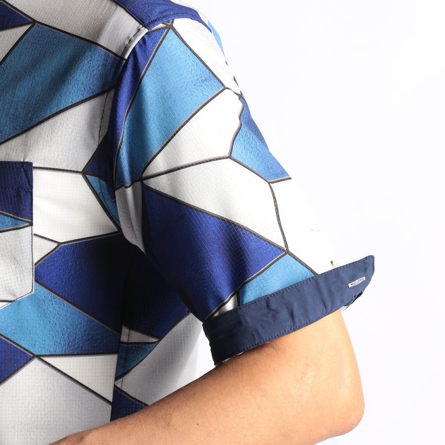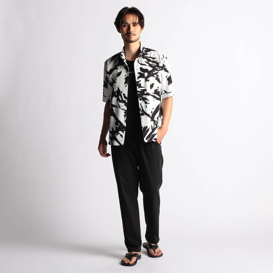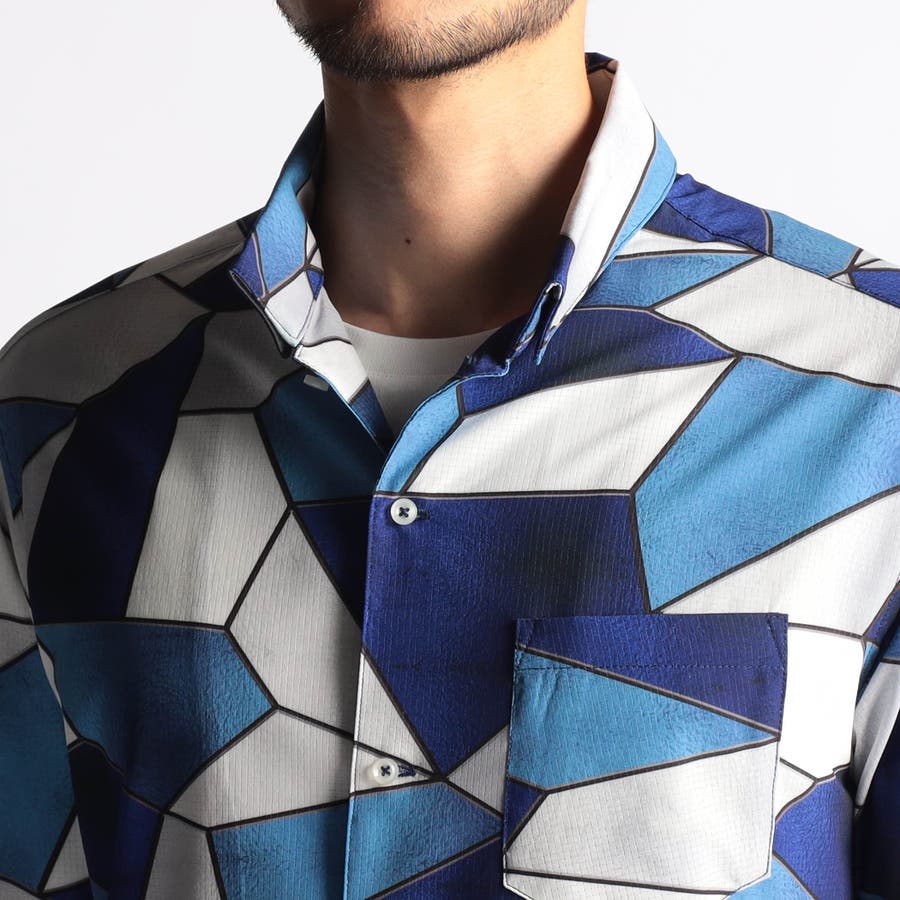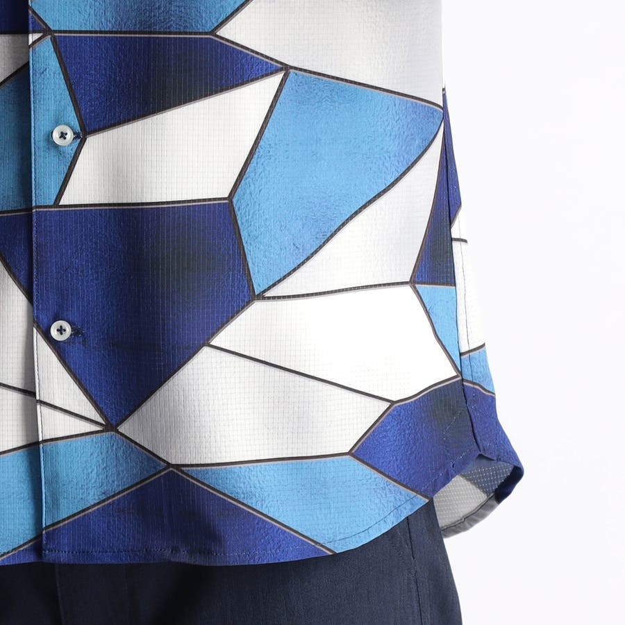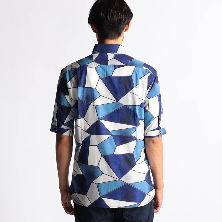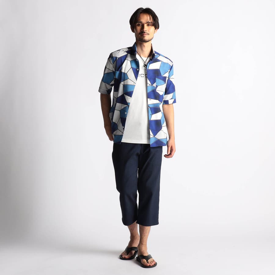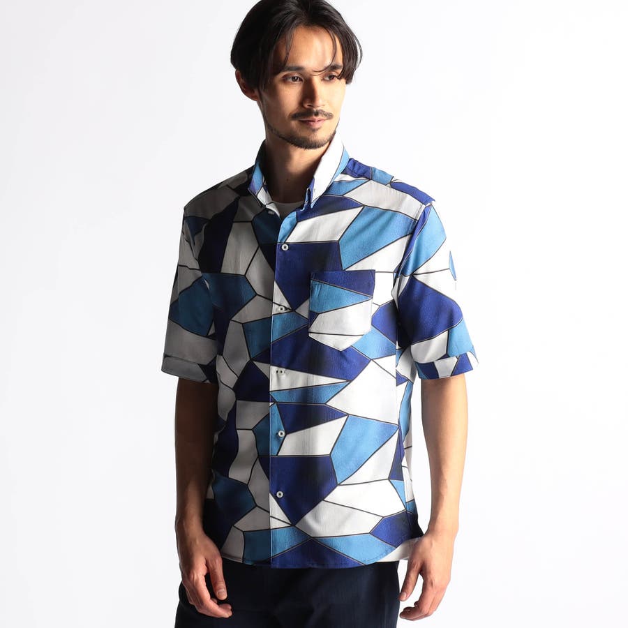 NEWデザイン、スタンドボタンダウンカラ-の5分袖シャツ。スタンドカラーをそのまま折り返して釦止めした新しい衿デザインです。ヨーク裏、カフス裏など無地配色の素材を使いアクセントにしています。生地のプリント配色とリンクした釦も、ちょっとしたアクセント。メッシュ調の清涼感ある素材はレーヨン系のアロハシャツの様なプリントシャツとは一線を画します。インパクトのある大胆なプリント柄ですが、程良く効いたストレッチ性とサラッとしたタッチはとても着やすく、オリジナリティの高いシャツです。