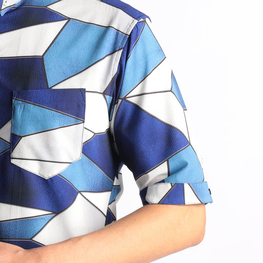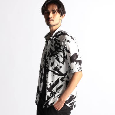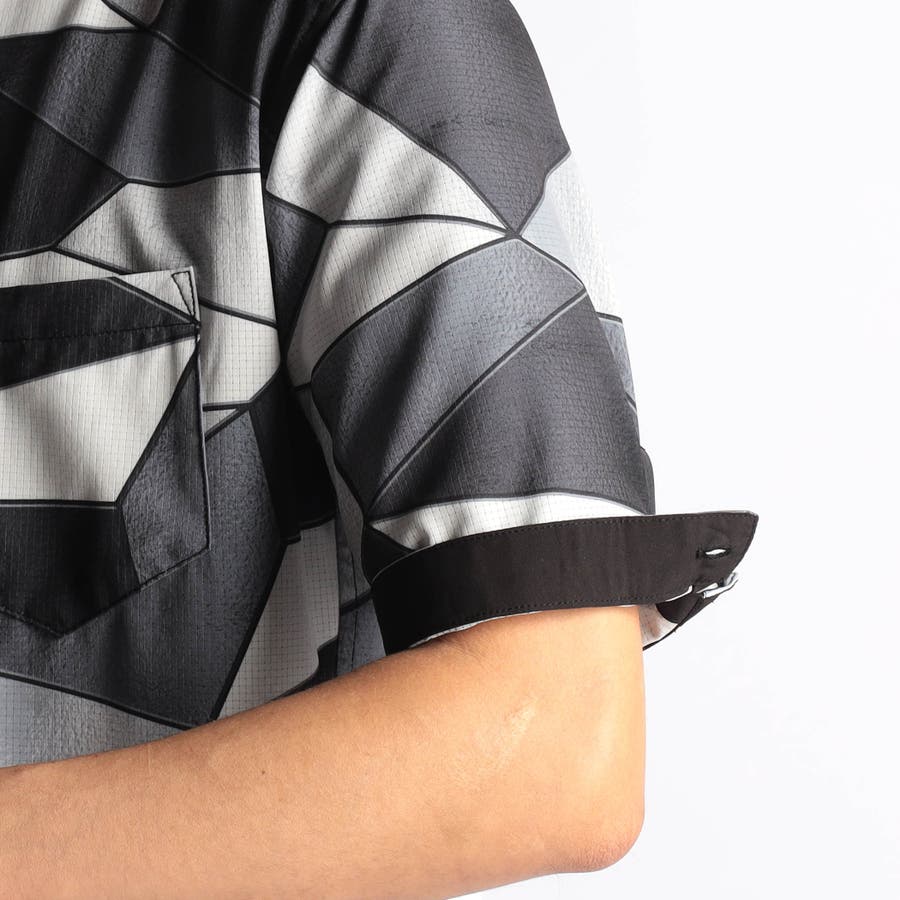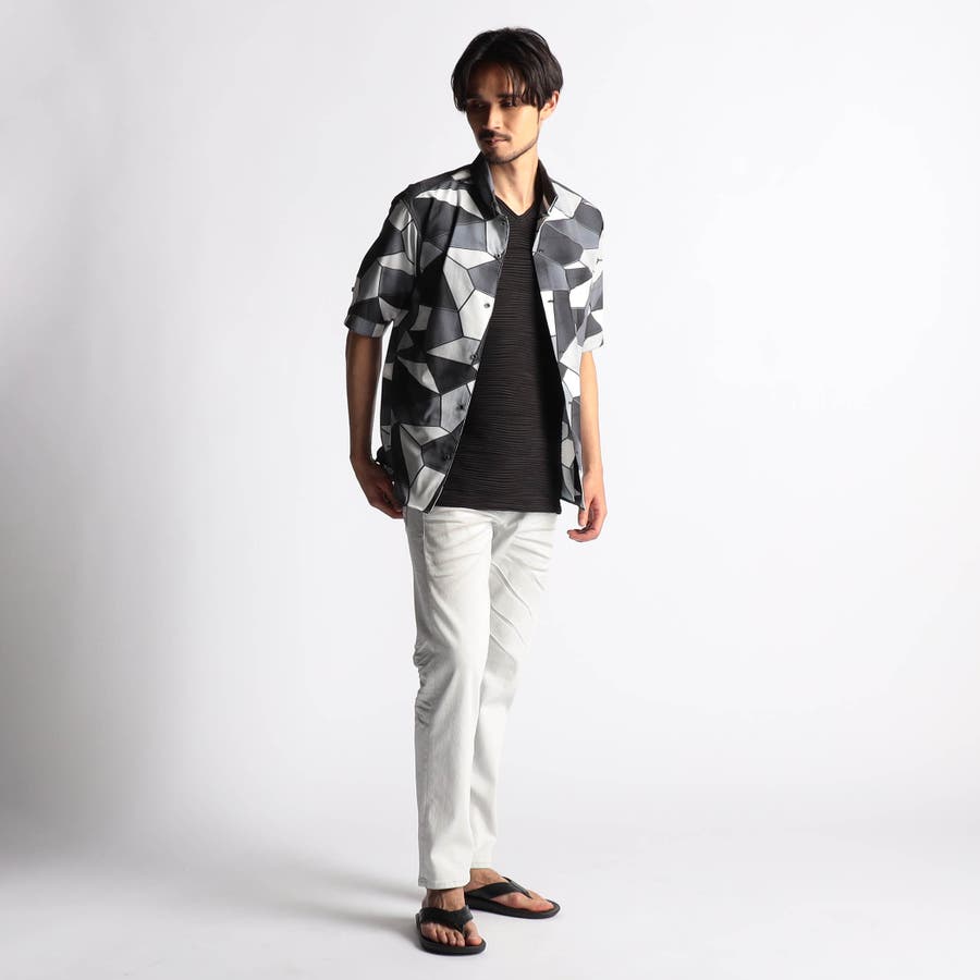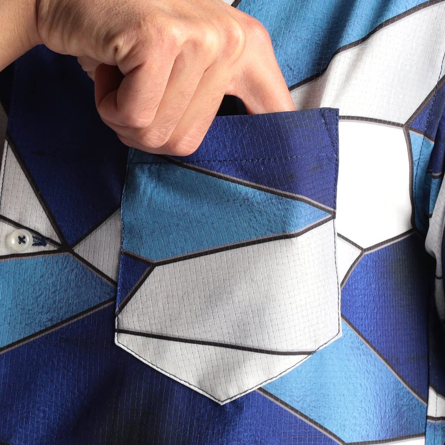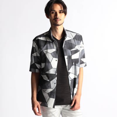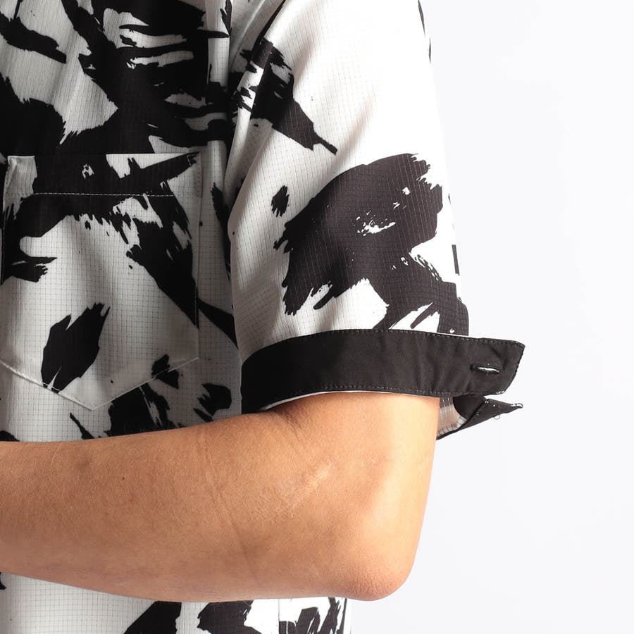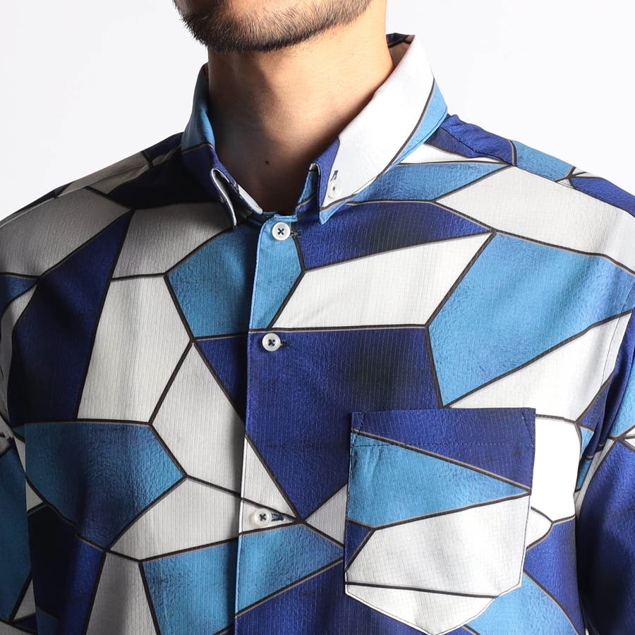 NEWデザイン、スタンドボタンダウンカラ-の5分袖シャツ。スタンドカラーをそのまま折り返して釦止めした新しい衿デザインです。ヨーク裏、カフス裏など無地配色の素材を使いアクセントにしています。生地のプリント配色とリンクした釦も、ちょっとしたアクセント。メッシュ調の清涼感ある素材はレーヨン系のアロハシャツの様なプリントシャツとは一線を画します。インパクトのある大胆なプリント柄ですが、程良く効いたストレッチ性とサラッとしたタッチはとても着やすく、オリジナリティの高いシャツです。