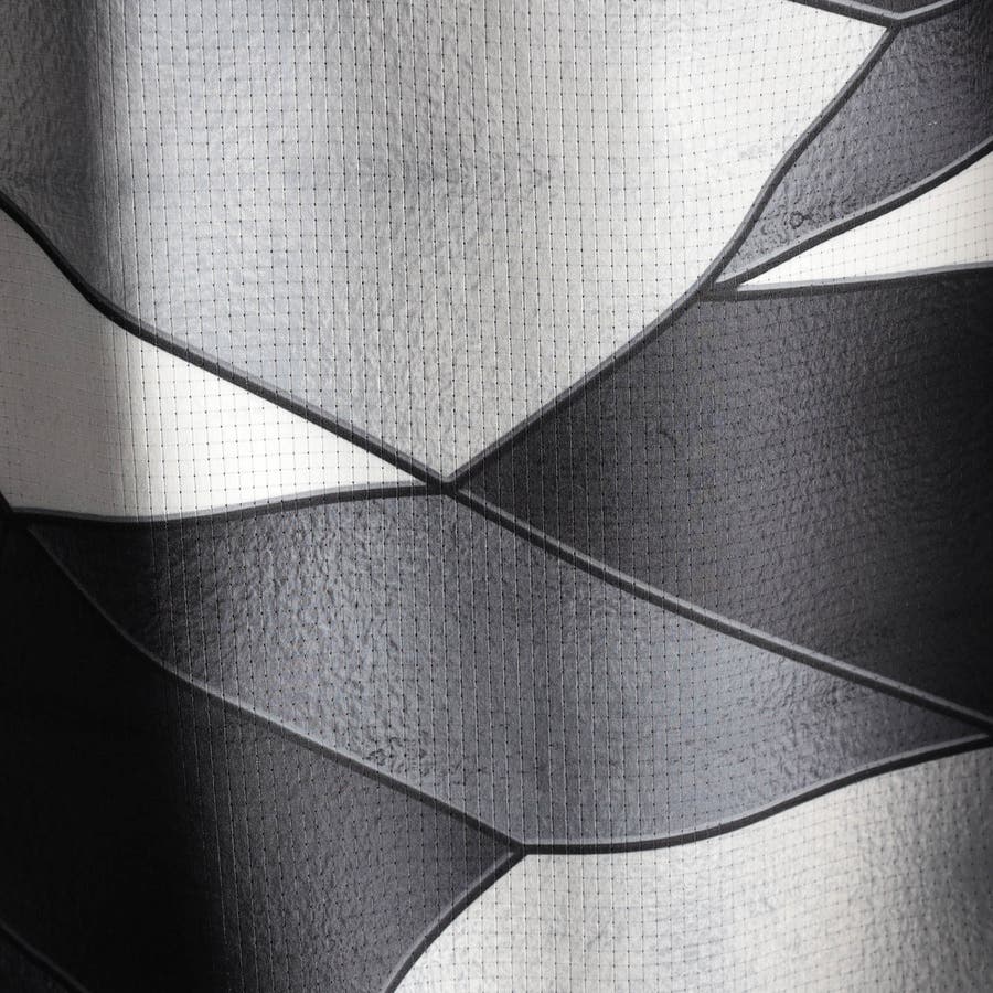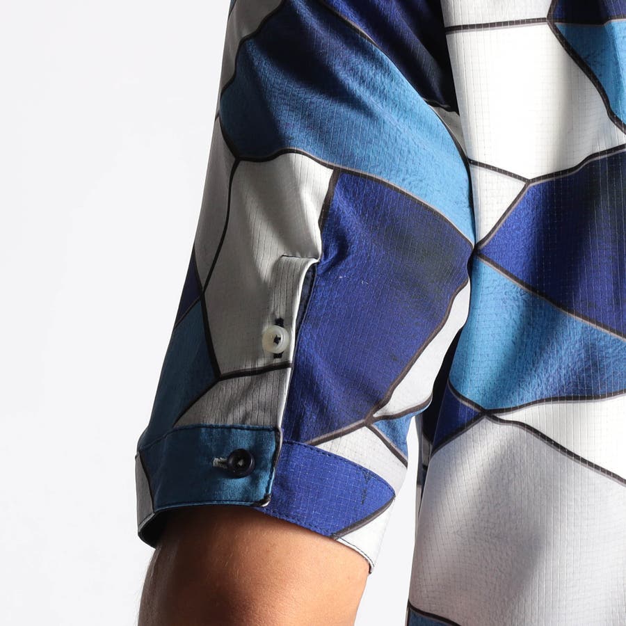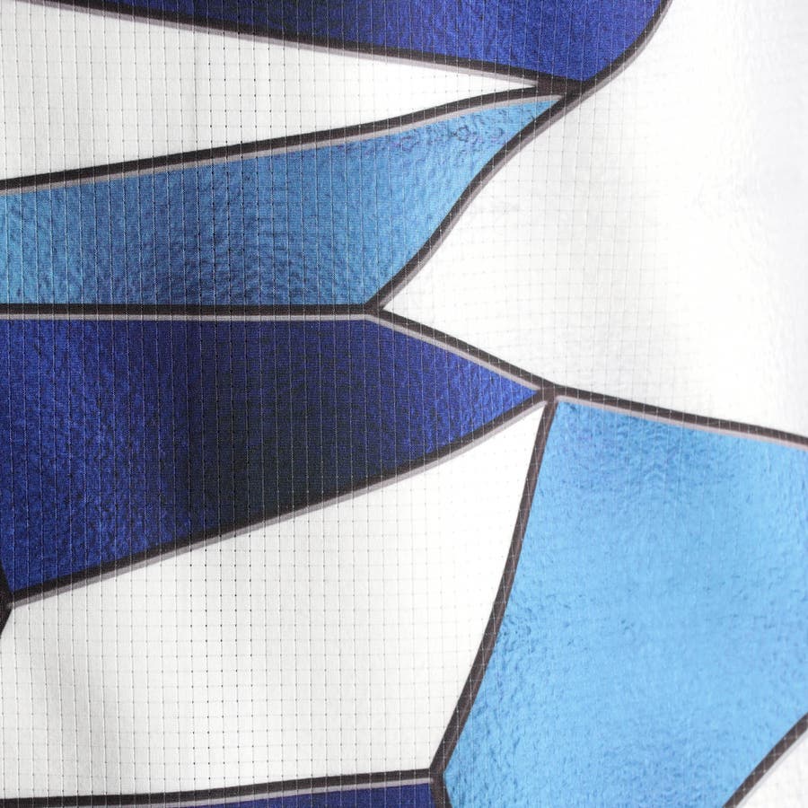 ストレッチポリエステルのスクウェアメッシュ素材をベースに、アラカルトのオリジナルプリント展開です。マルチなストレッチ性、吸水速乾性、防シワ性に優れた高機能素材なので取り扱いも楽です。09ホワイトは大胆なスプラッシュ調の柄がはっきりした白黒のモノトーンプリント。49ブラックと60ブルーはステンドグラスをモチーフにアレンジ、転写プリントで硝子の質感まで表現しています。