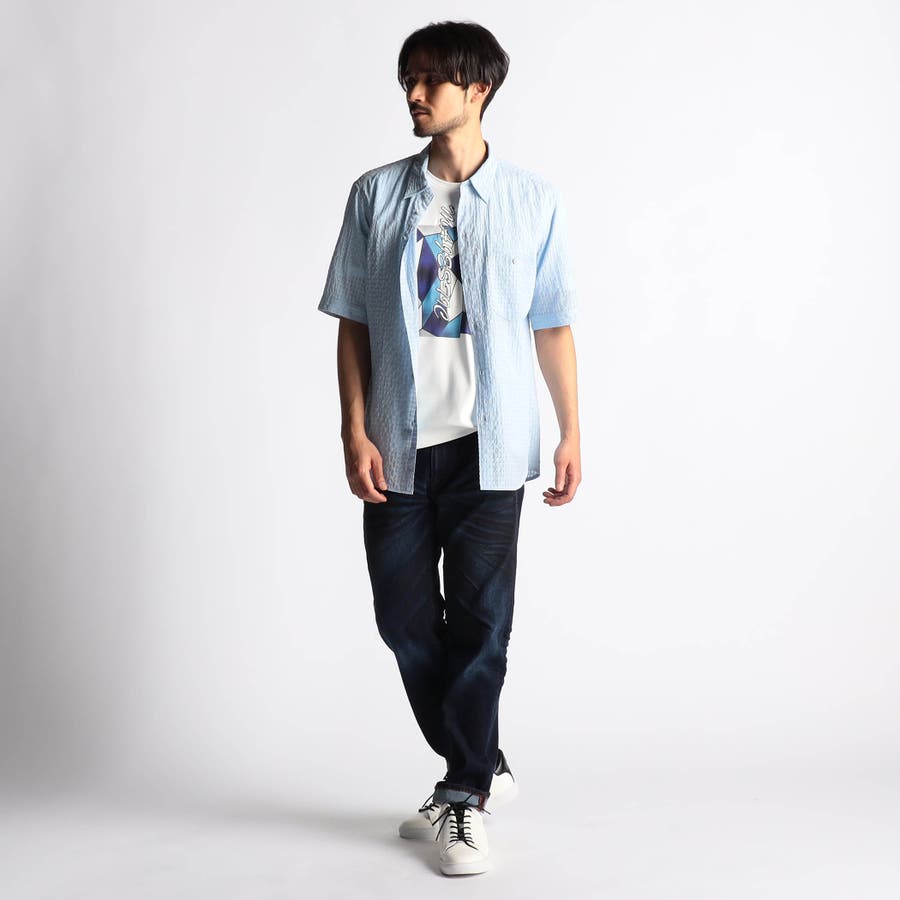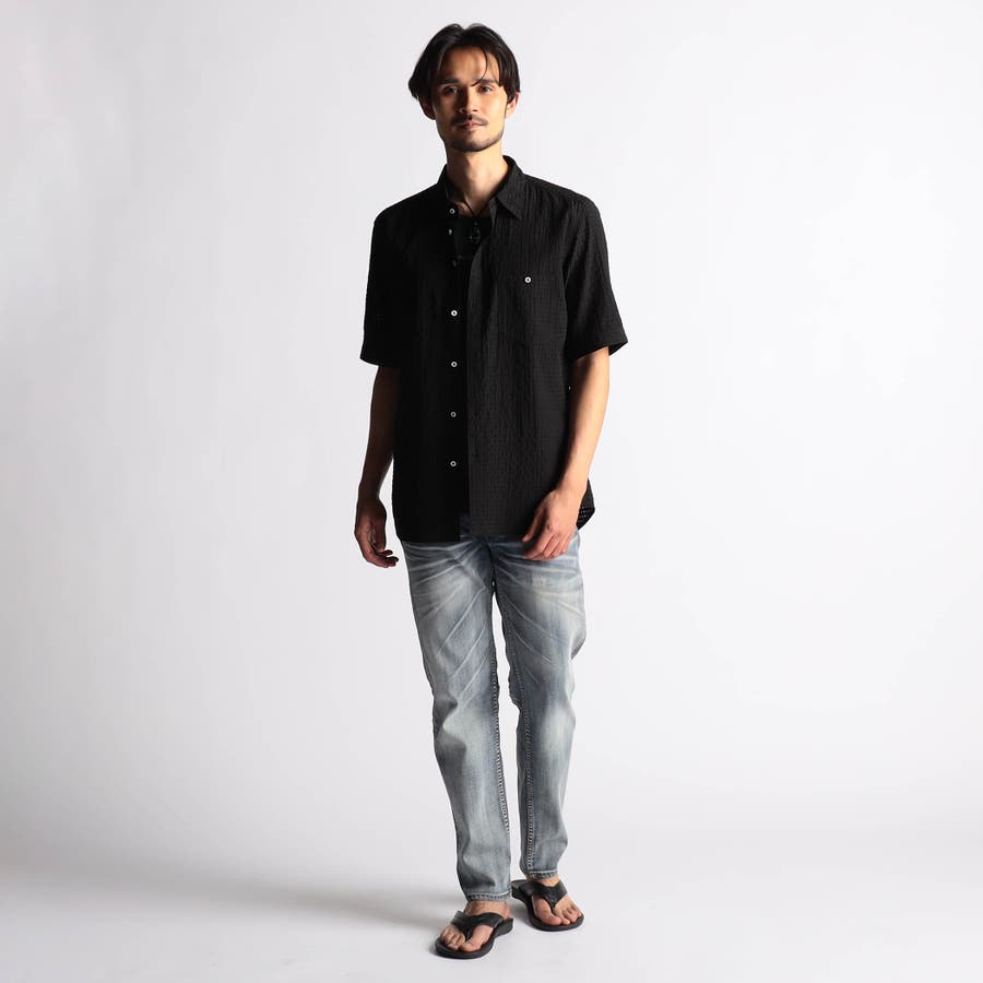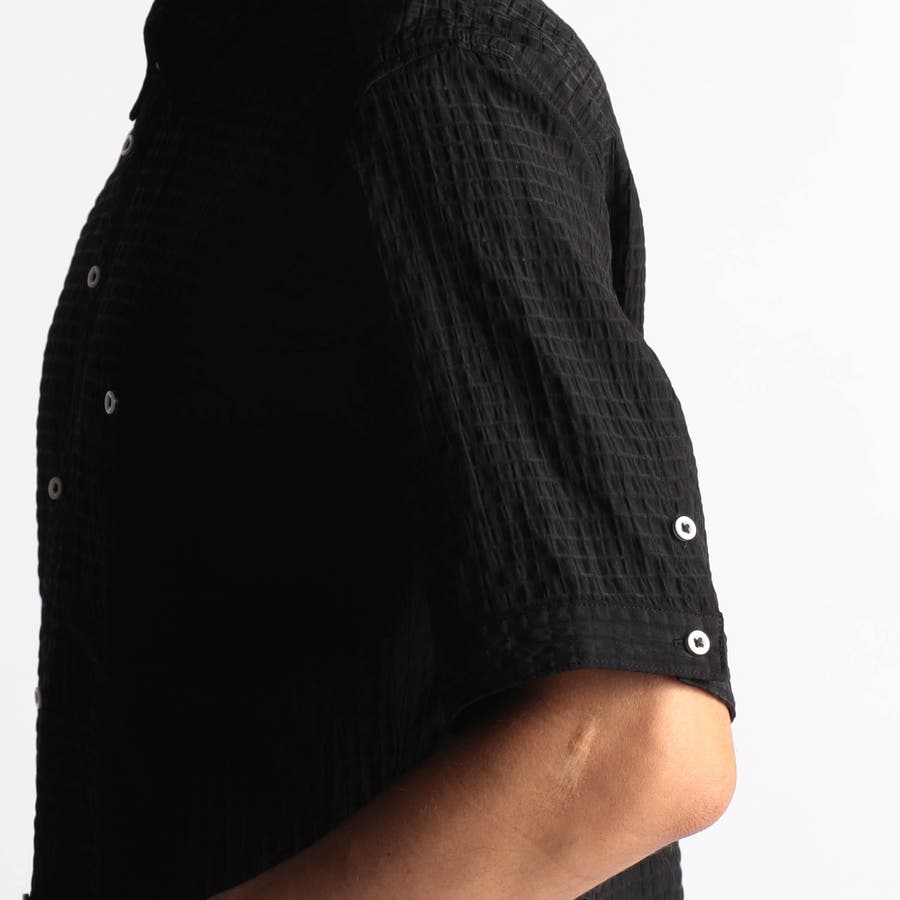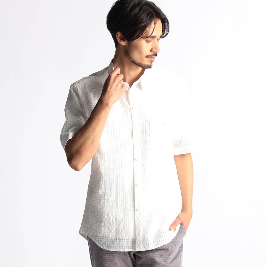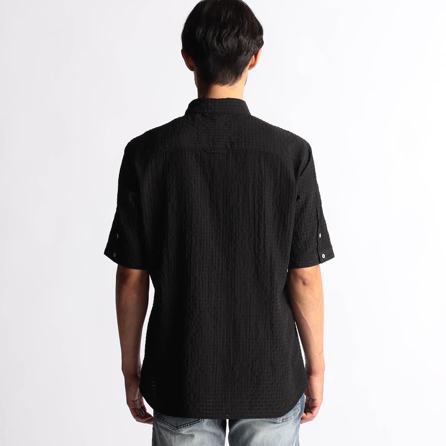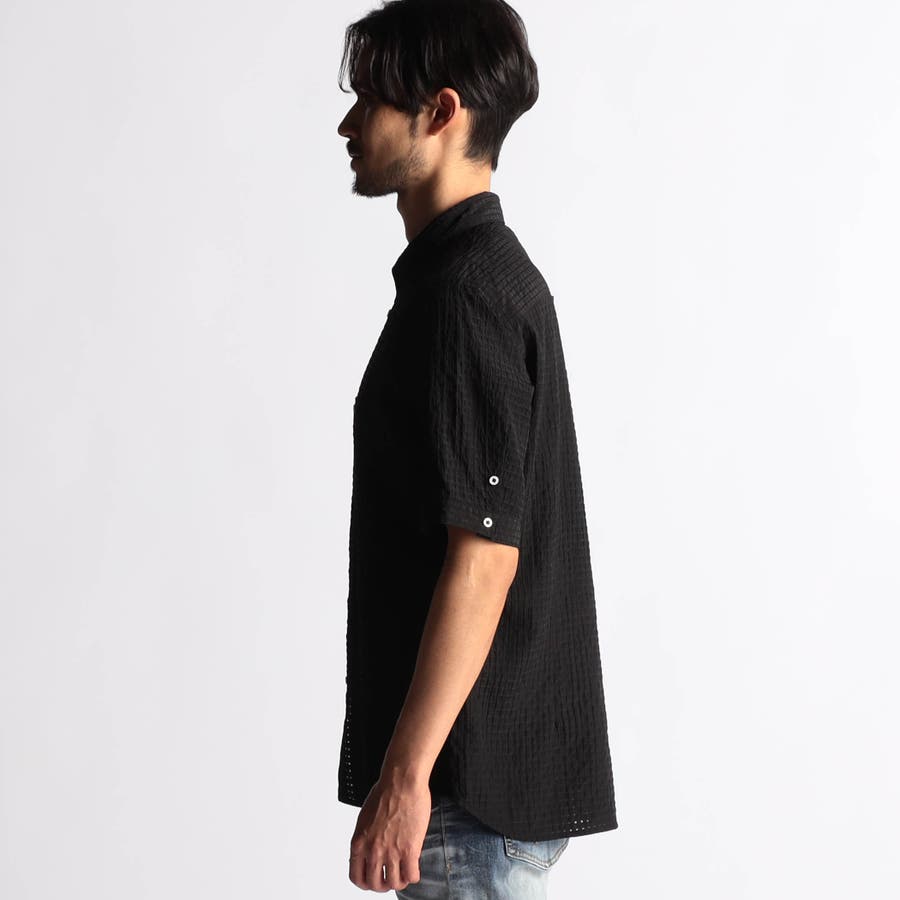 羽根衿の先端にワイヤ-を仕込んだショートレギュラーカラ-の5分袖シャツ。衿や身返し、カフスなどには表地をふらし芯として使い、ワイヤー部分の補強や透け感に違和感の無い見え方に仕上げています。左胸に釦止め仕様のポケットや同色系の裏地を使用、生地色とリンクした配色釦や付け糸も変えたりして、アクセントを加えています。
