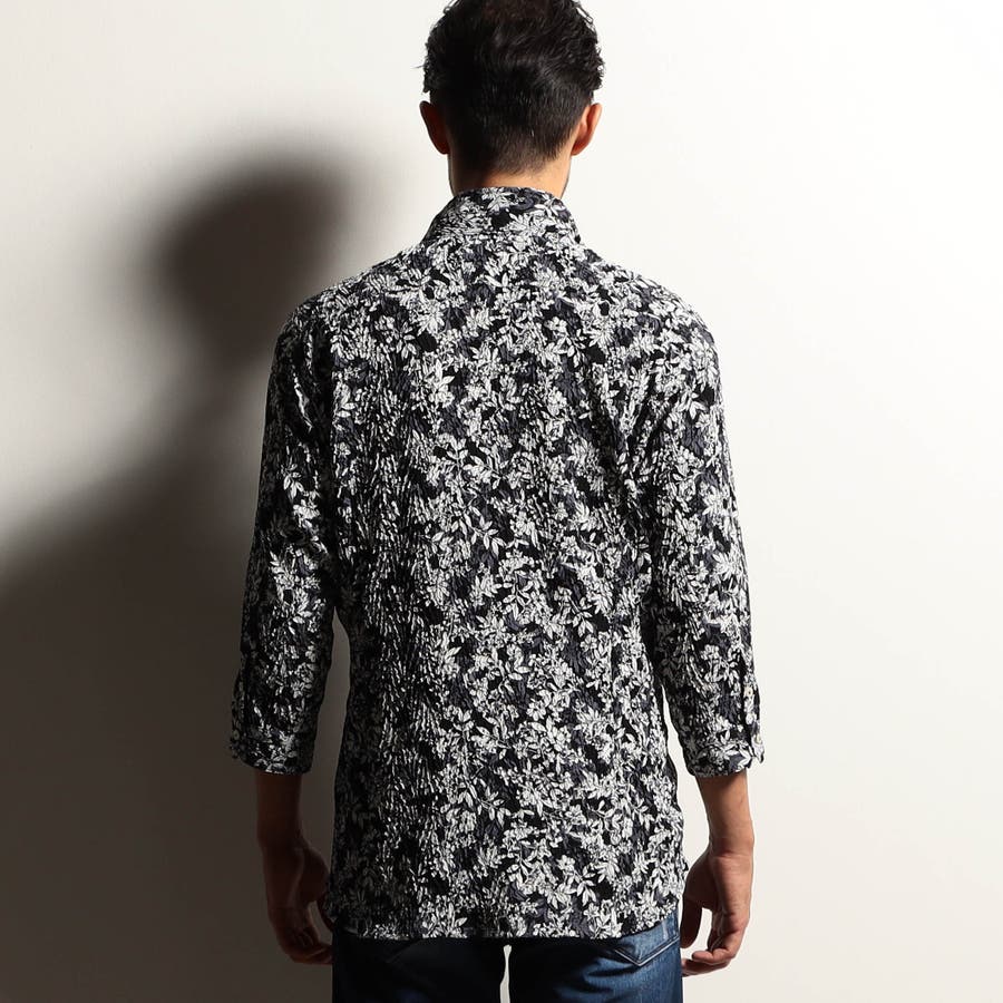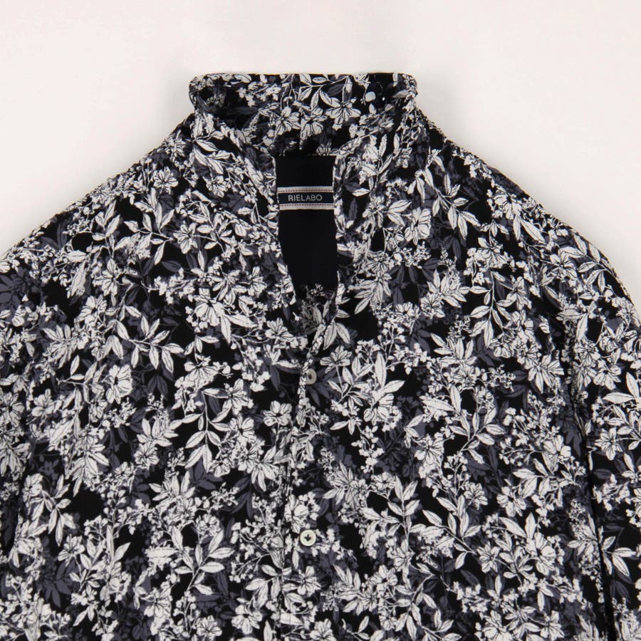 スタンド・イタリアンカラーの7分袖シャツ。衿と身返しを一体型に作り、Vゾーン、釦を開けた時の見え方が綺麗に見える様に作りました。更にワイヤーも衿の前端から上端に通しているのでくせを付けやすいです。袖口裏などに同色系ストレッチ裏地を使用、左裾に入れたロゴ刺繍と、身生地の配色に合わせたリエラボ別注釦と釦付け糸をアクセントにオリジナリティを高めています。釦付け方法は烏(カラス)付けと言う、手作業で付けています。