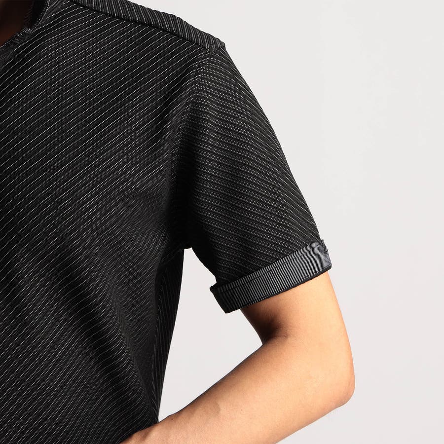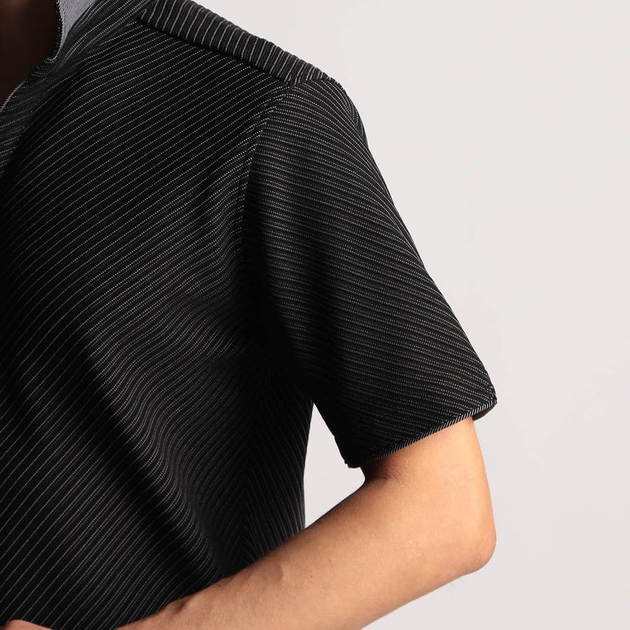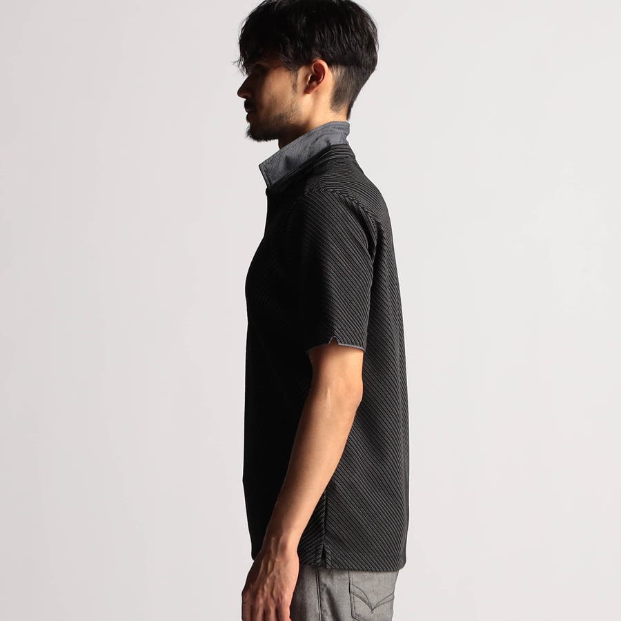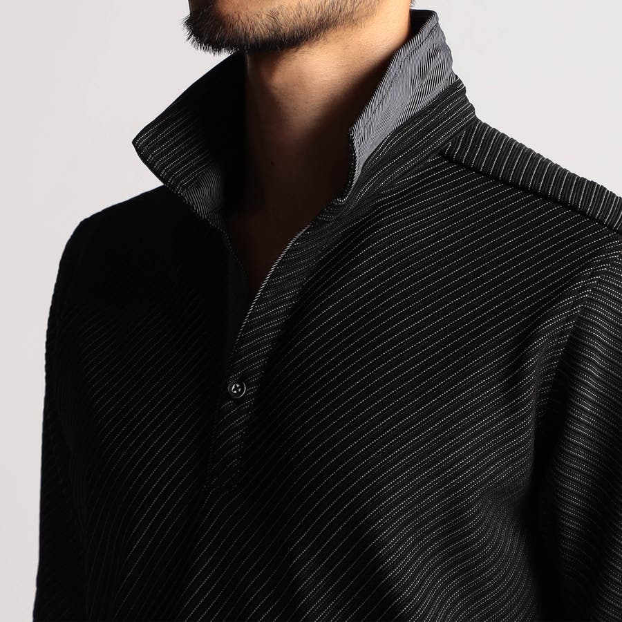 張りのある素材感でスポーティに着こなせるスキッパーポロ。身生地のタックボーダーは衿以外 全パーツバイヤス取りしています。要所の別生地には布帛のピンストライプを使い上品なギミックをプラスしました。しっかりとした素材でスキッパーポロのポイントである前開きのVゾーンを綺麗に保ちます。衿に仕込んだワイヤー、袖口、裾のサイドスリット等、ワンライク上の仕様を随所に盛り込んだポロシャツに仕上げています。