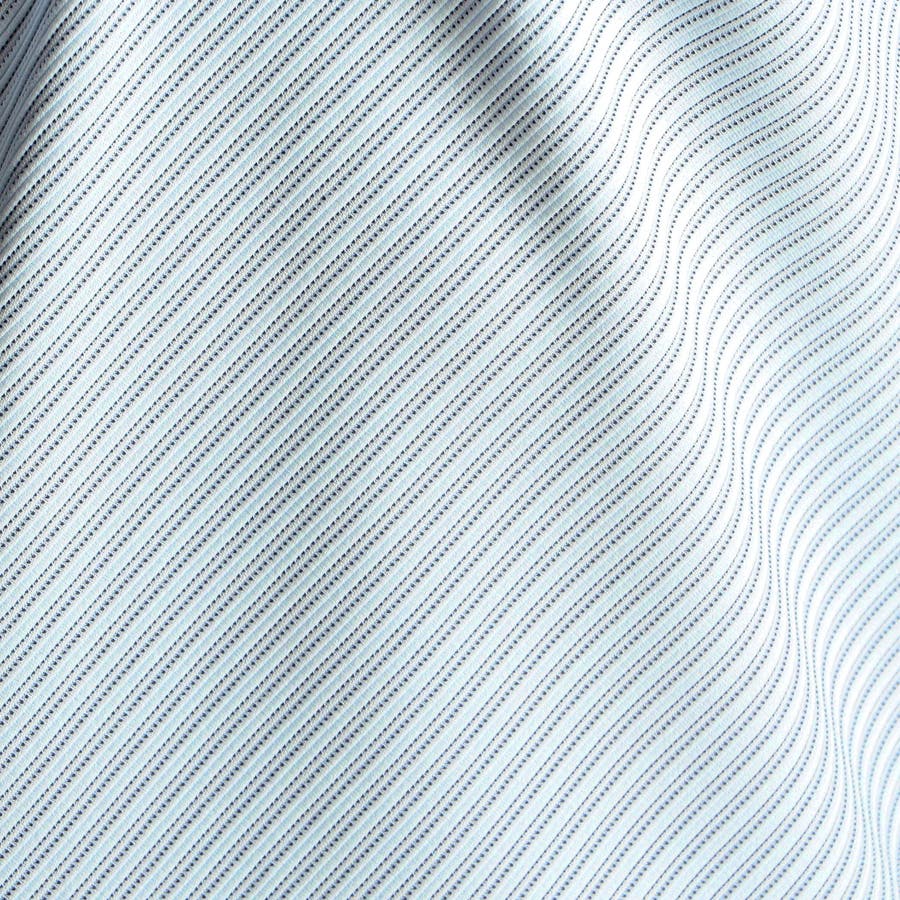 ピッチ変化のあるタック編みの凹凸と質感の違う2種類のポリエステル糸でボーダーを表現しました。原着ブライト糸の光沢がアクセントとして効いています。合繊の為、軽くて張りがありスポーツウエアの様な快適な着用感が特徴。速乾性と防シワ性にも優れています。