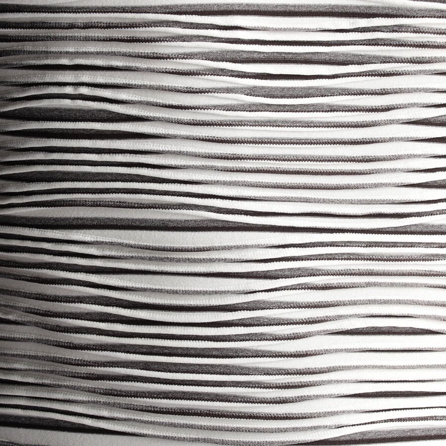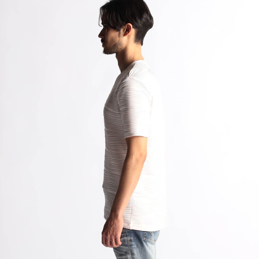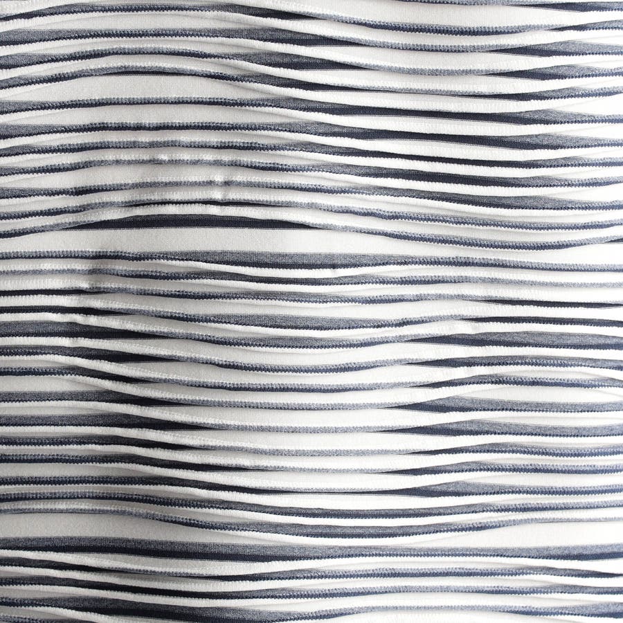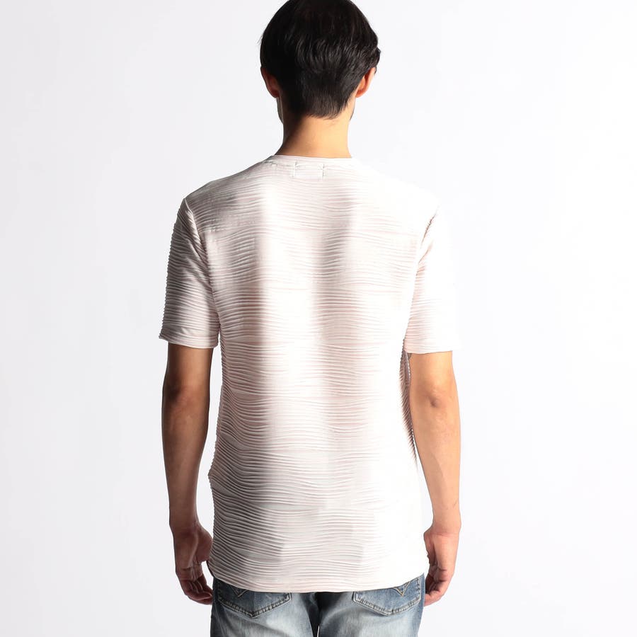 タック編みでランダムなウェーブ柄を表現しています。染色温度の異なるポリエステル糸で柄を編み濃中淡のグラデーションカラーを表現。独特なジャカード柄で軽く立体感のある編地のテクスチャーがポイントです。ポリエステルのサラッとした風合いと凹凸のある編地で清涼感を持たせ快適な着心地です。