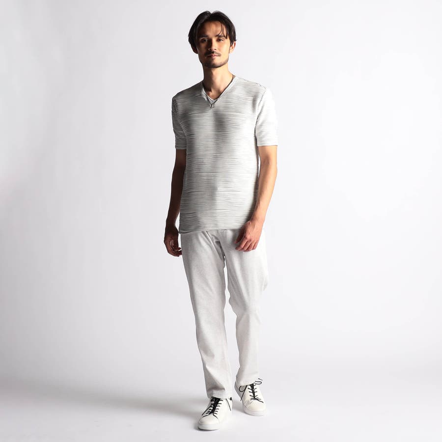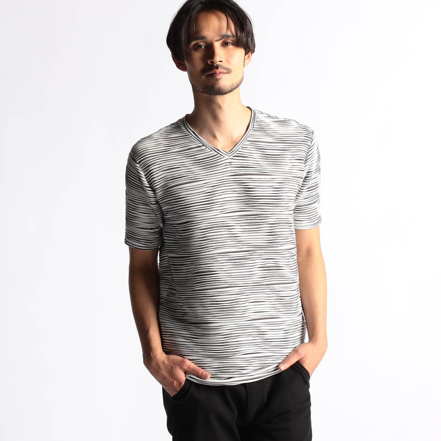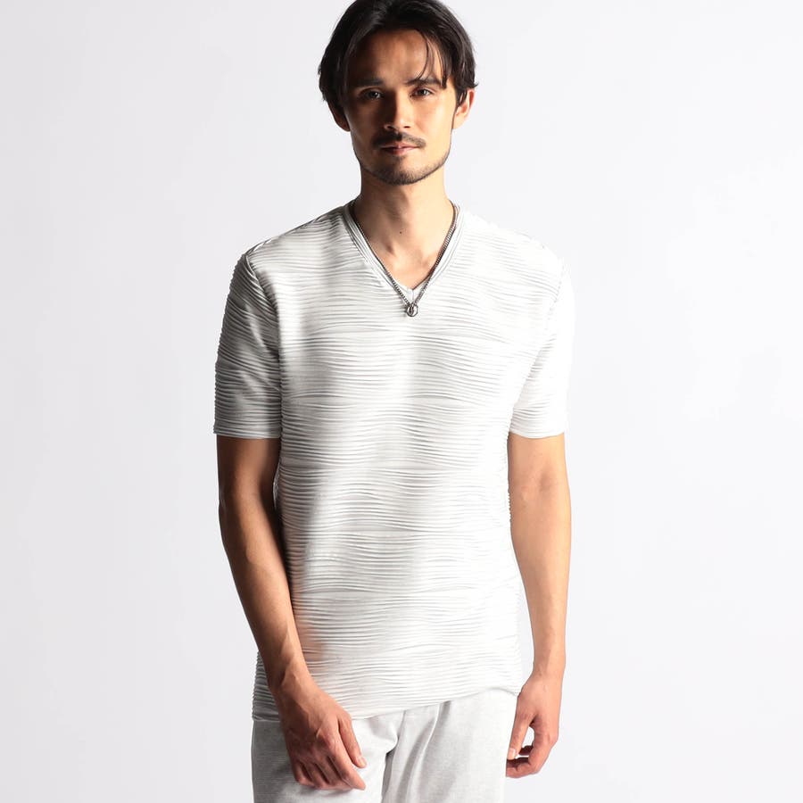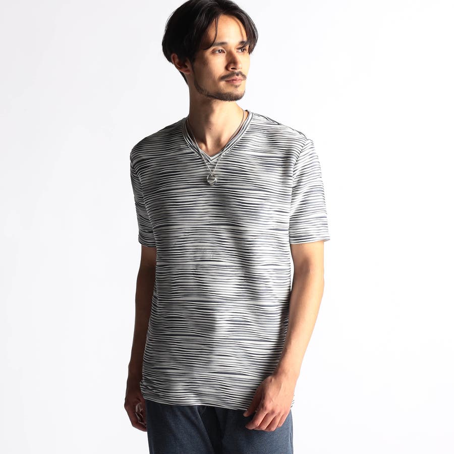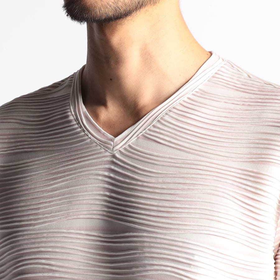 浅めVネックのシンプルなデザインで大人受けする上質なカットソーに仕上げました。独特なジャカード゛柄の表情豊かなテキスタイルデザインがスタイリングを魅力的に演出してくれる一着。インナーとしては勿論、1枚で着ても存在感抜群な仕上がりになっています。