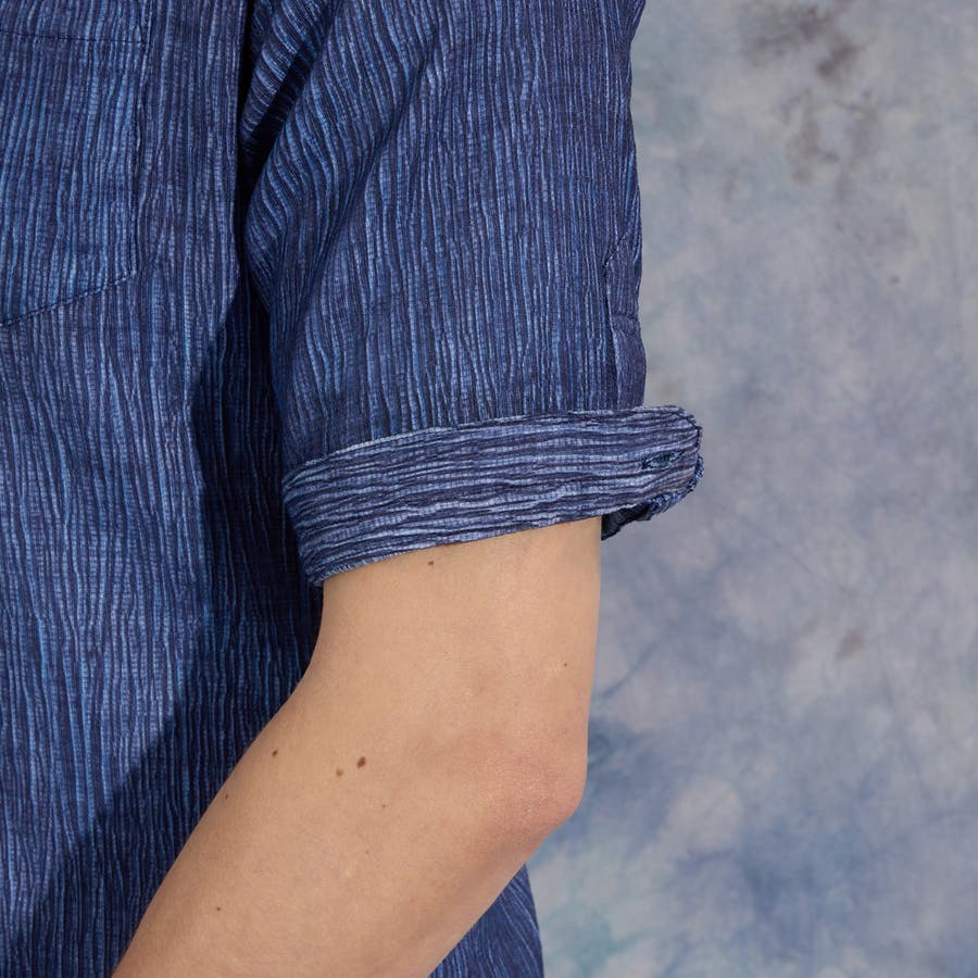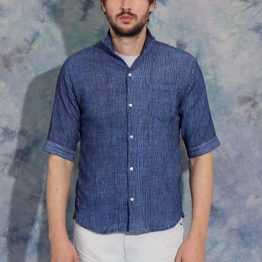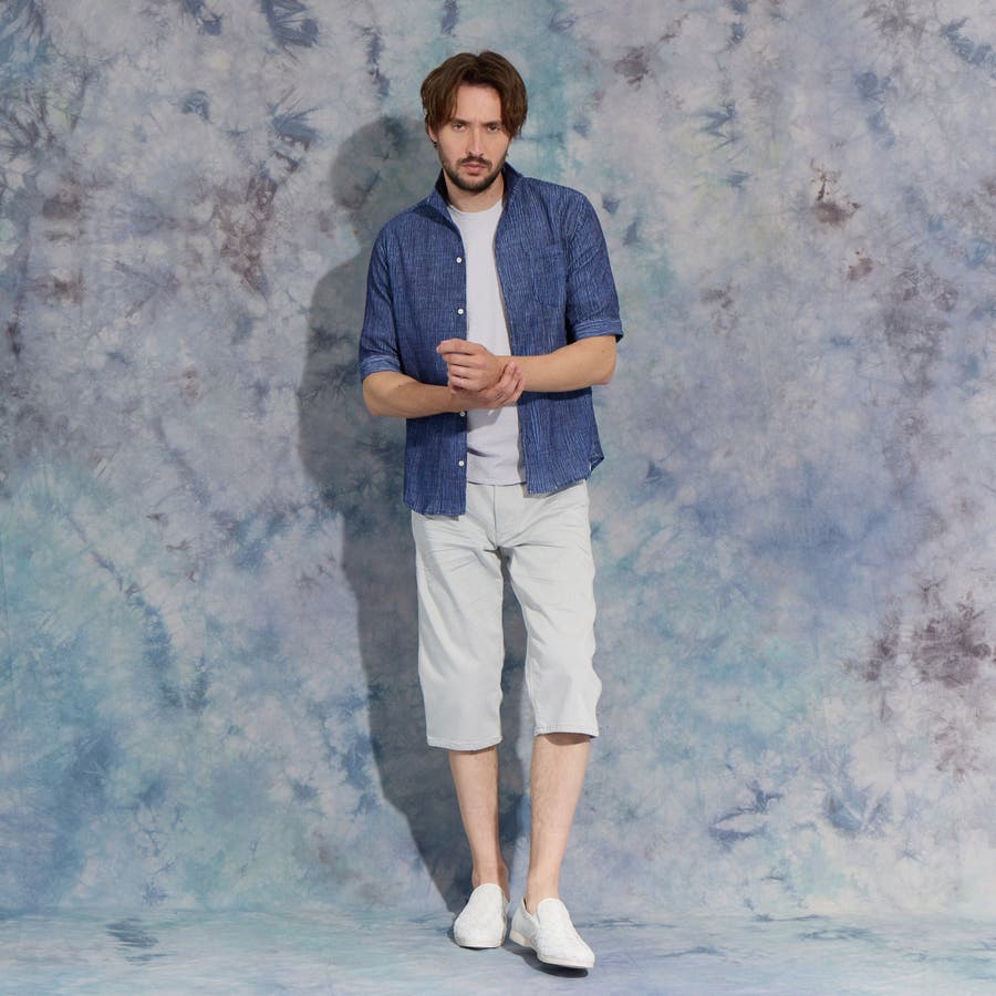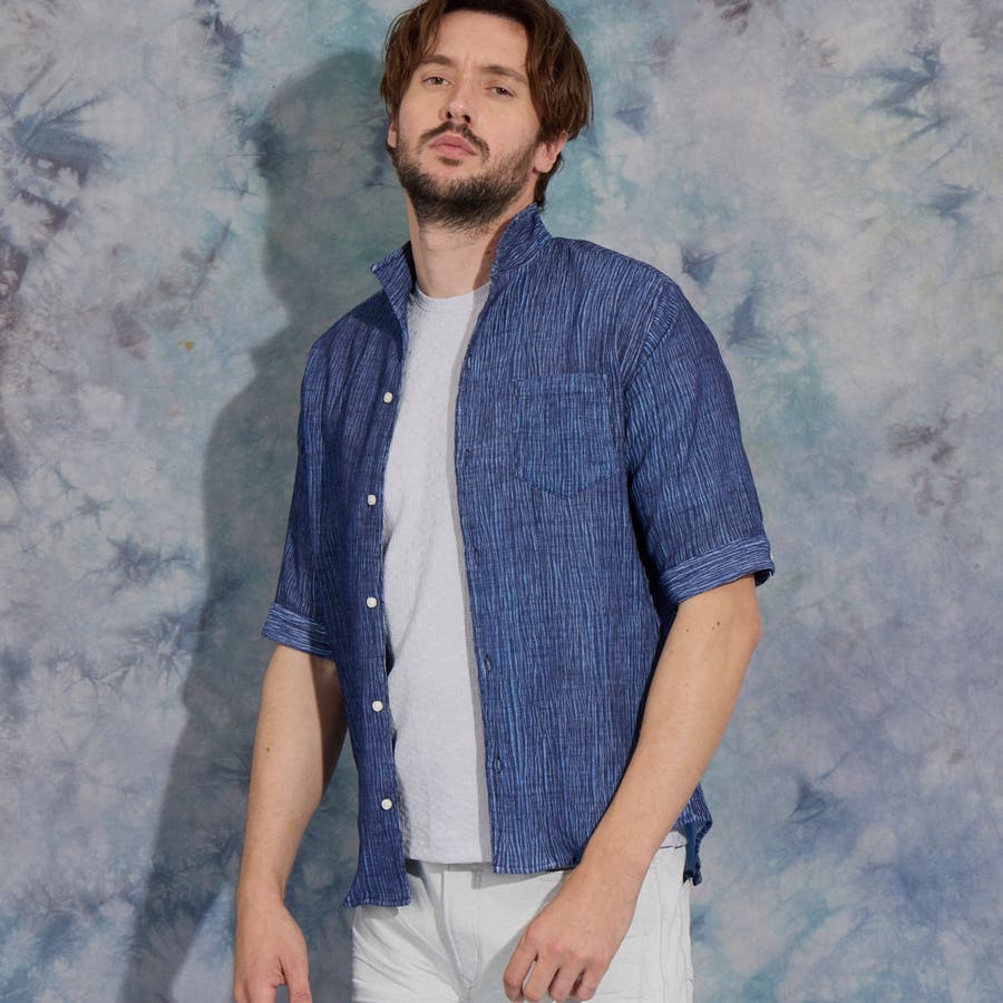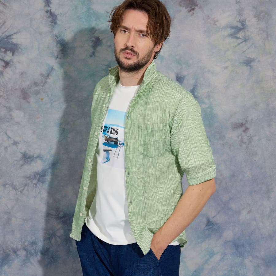 イタリアンカラーの5分袖シャツ。