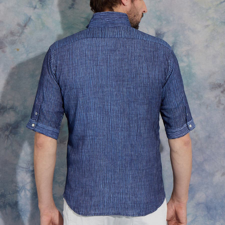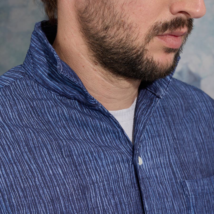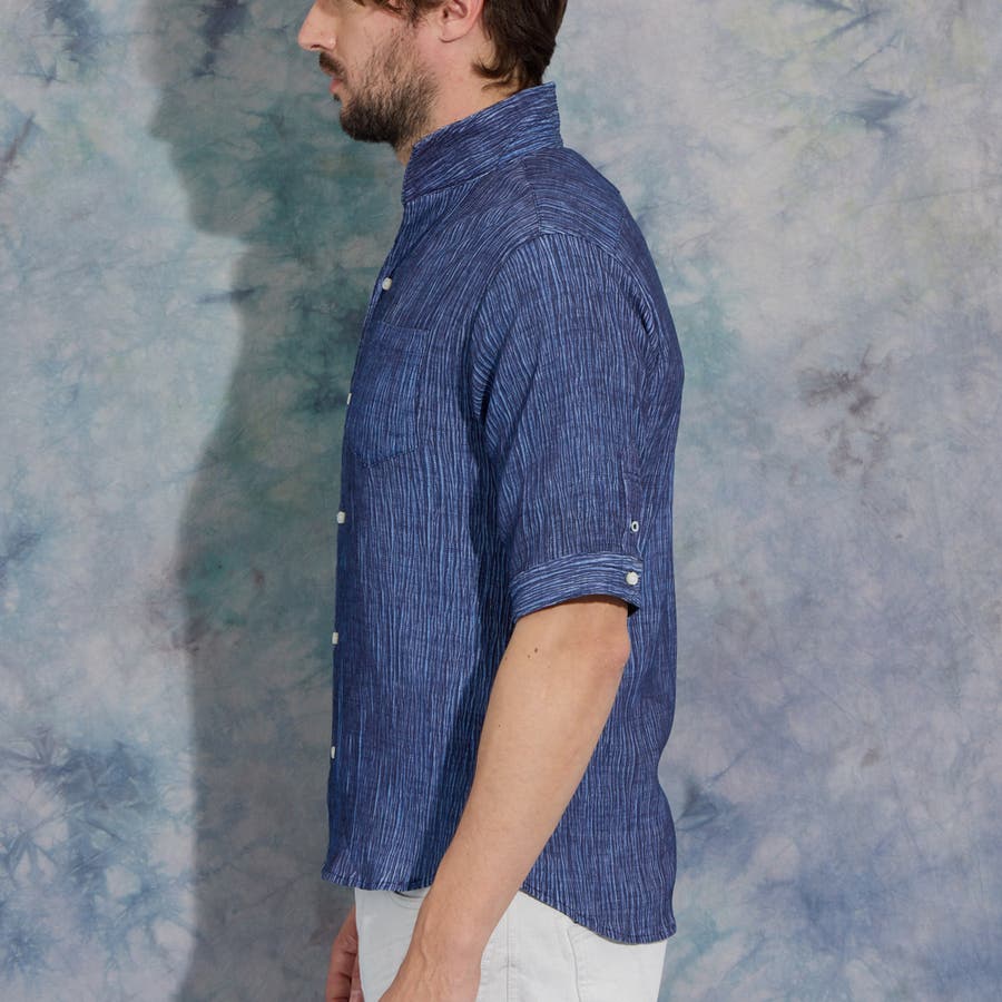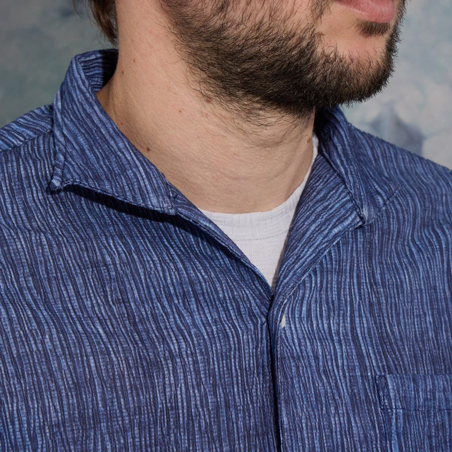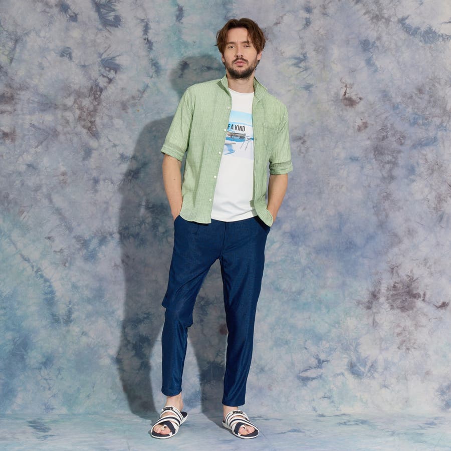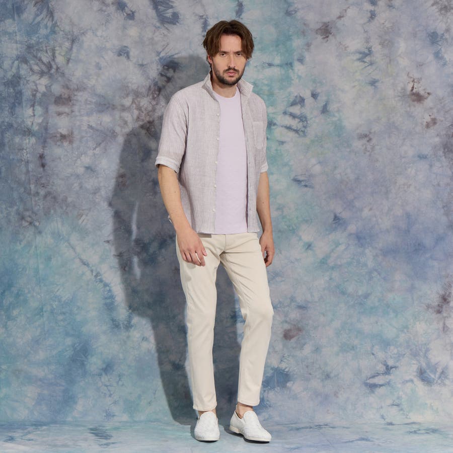 イタリアンカラーの5分袖シャツ。