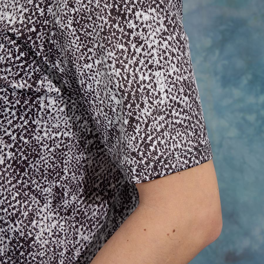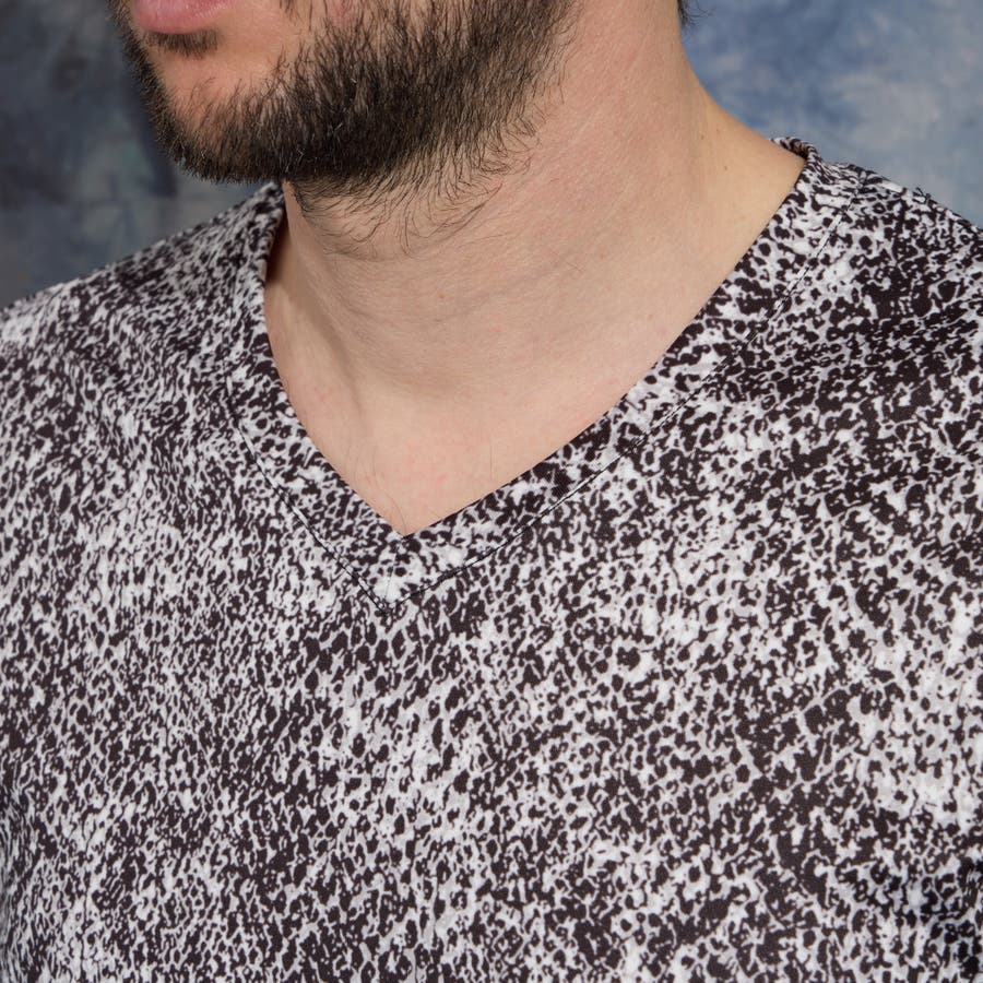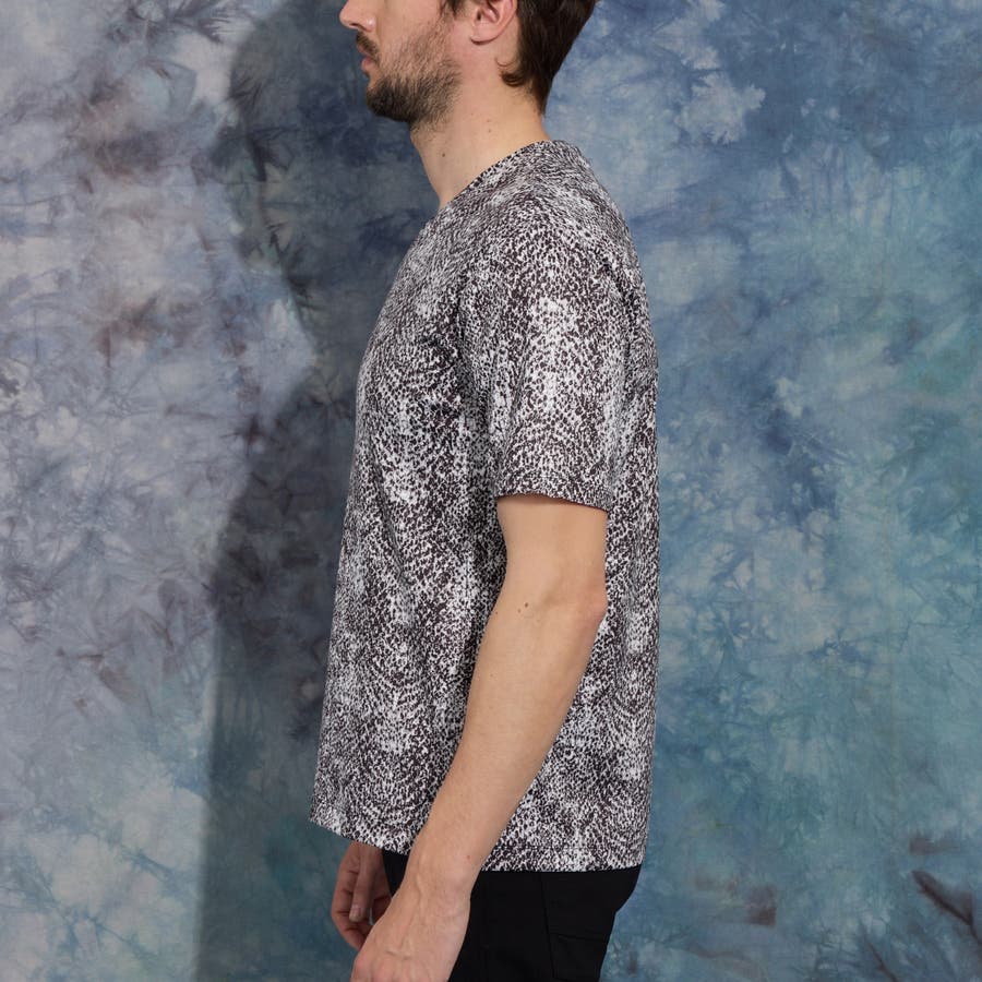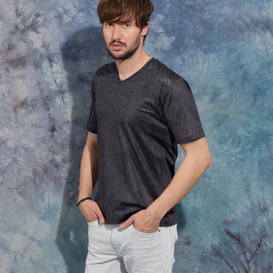 ポンチ素材にインパクトのあるアニマル柄をプリントしたVネック半袖プルオーバーになります。