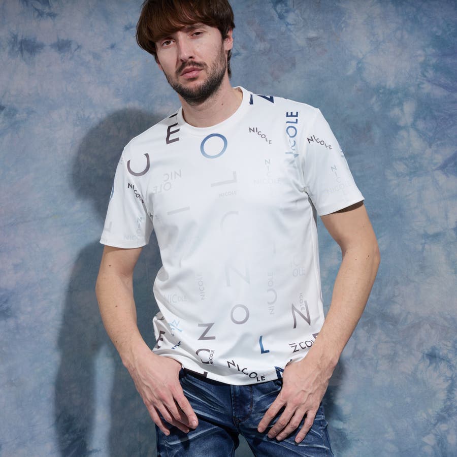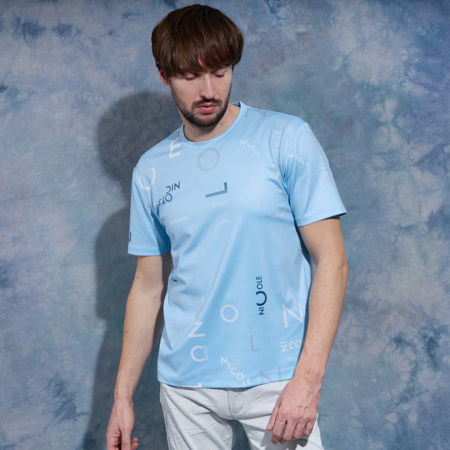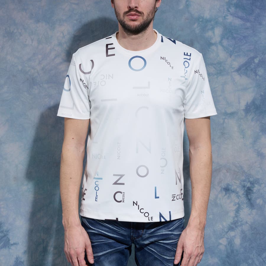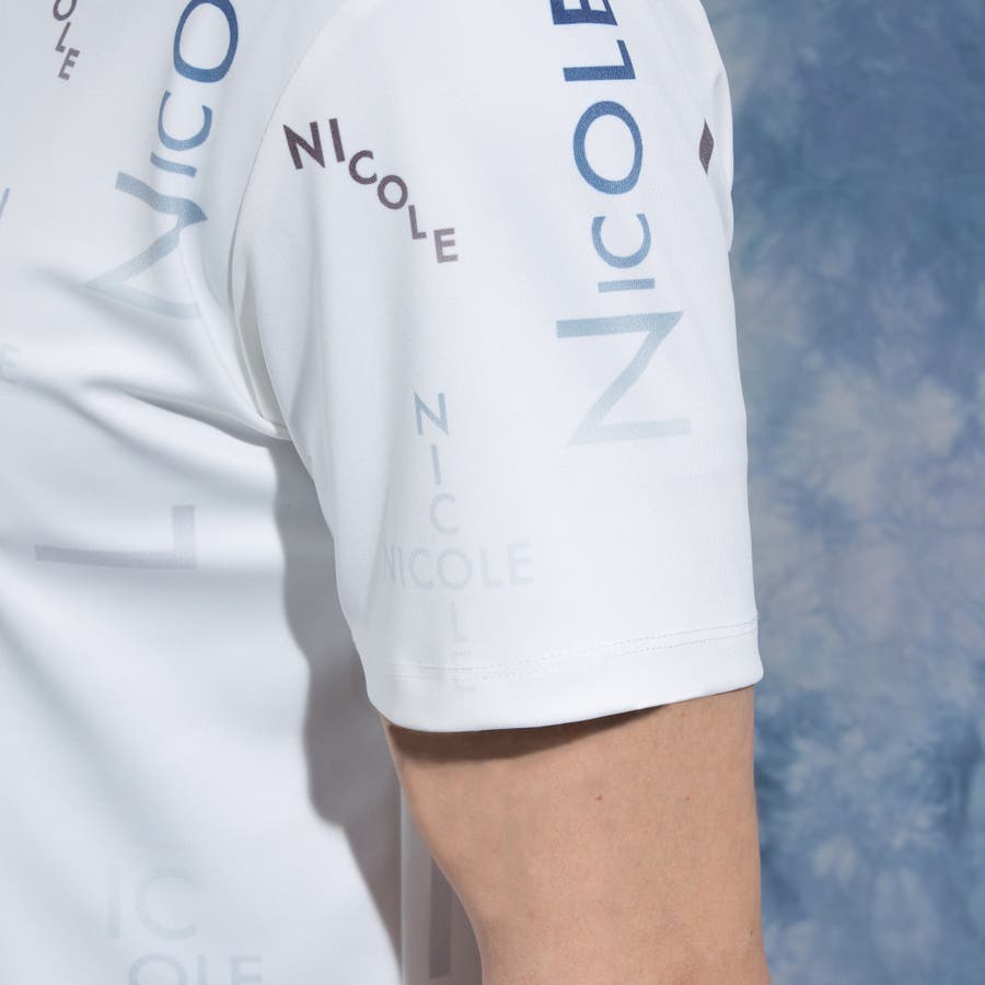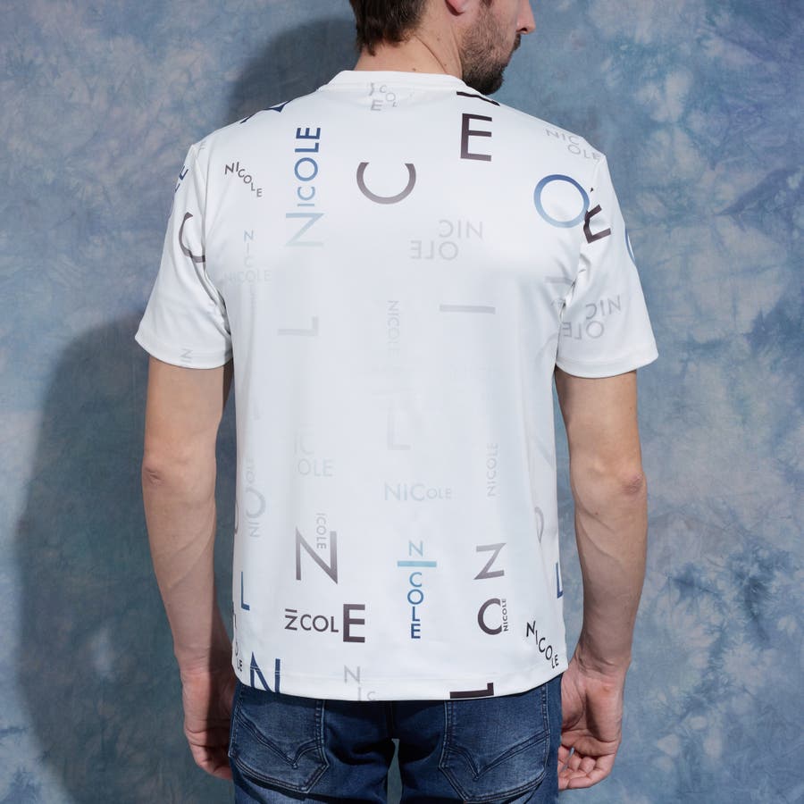 NICOLEのロゴをランダムに配置した総柄クルーネック半袖Tシャツになります。