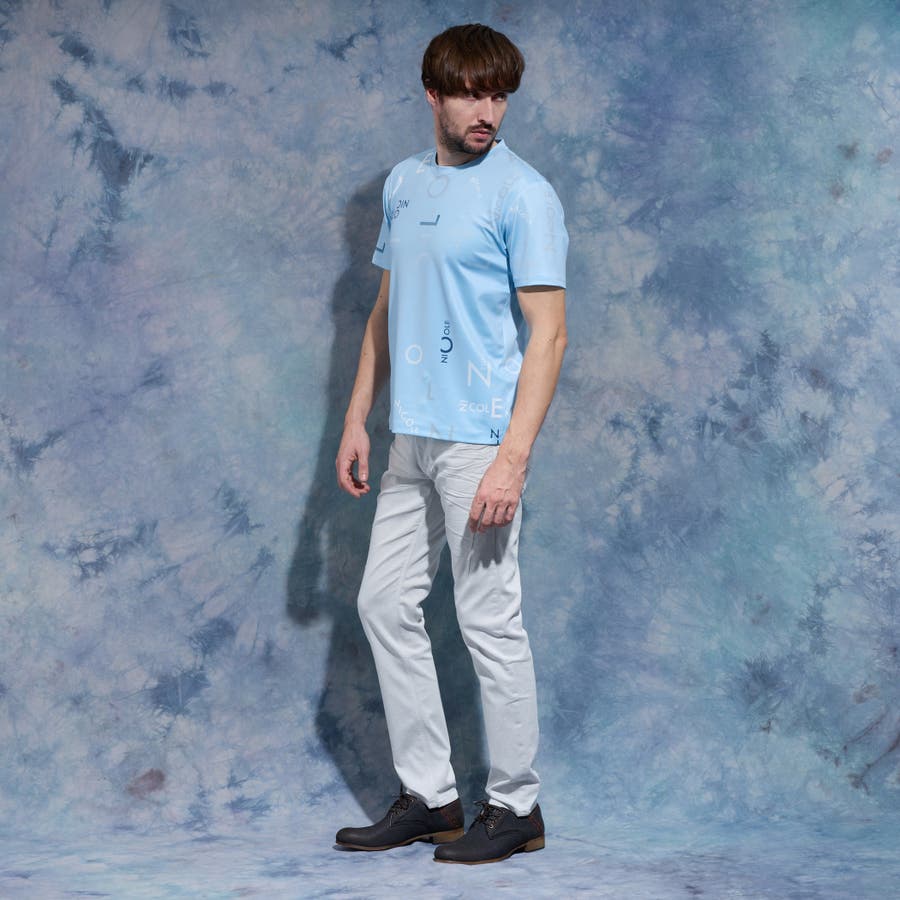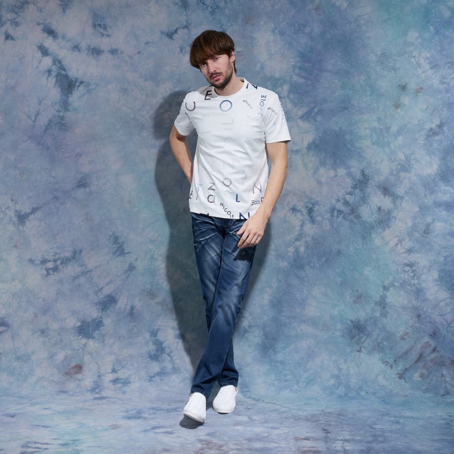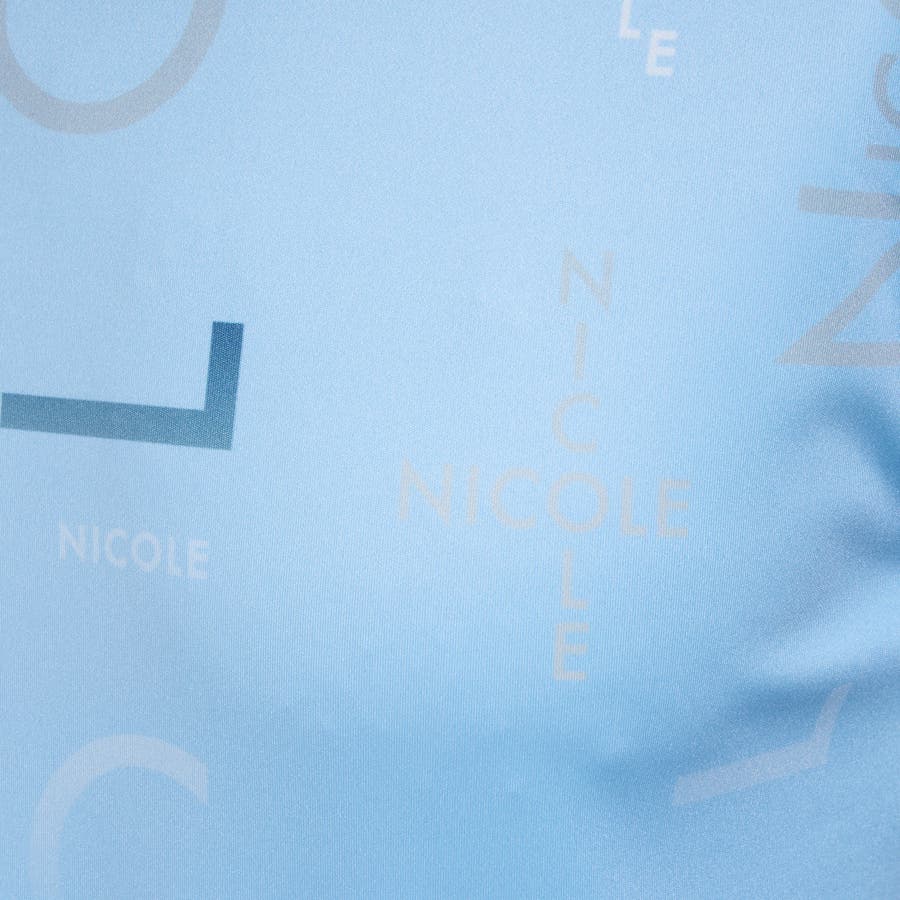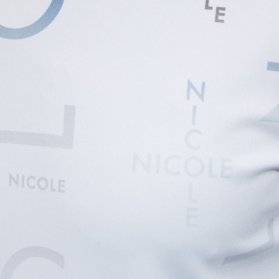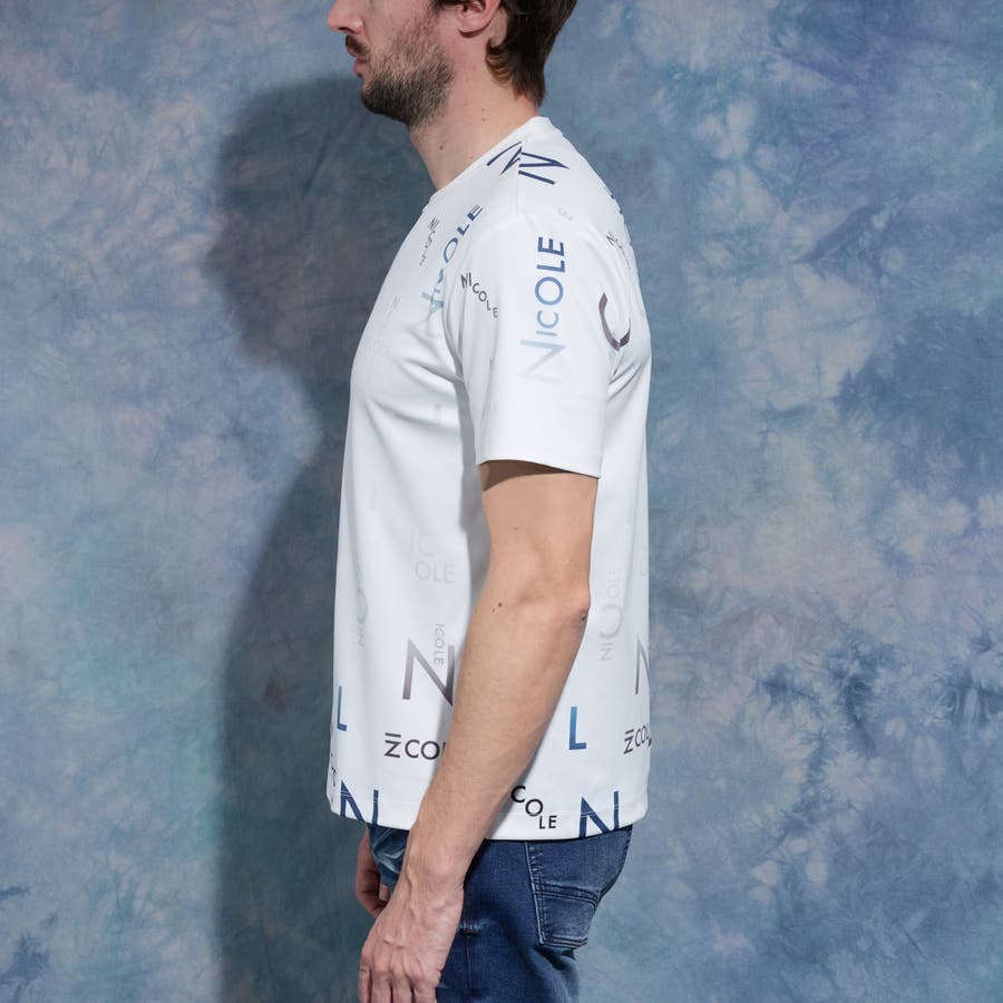 NICOLEのロゴをランダムに配置した総柄クルーネック半袖Tシャツになります。