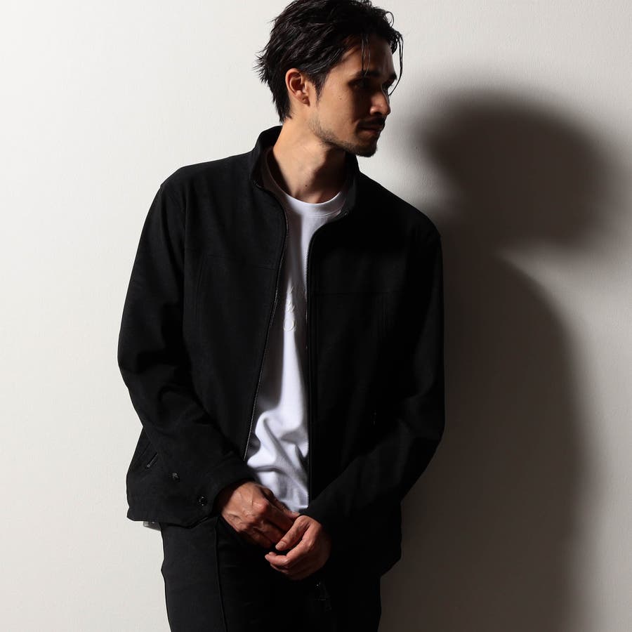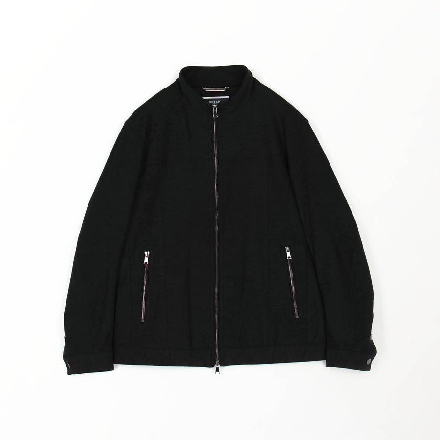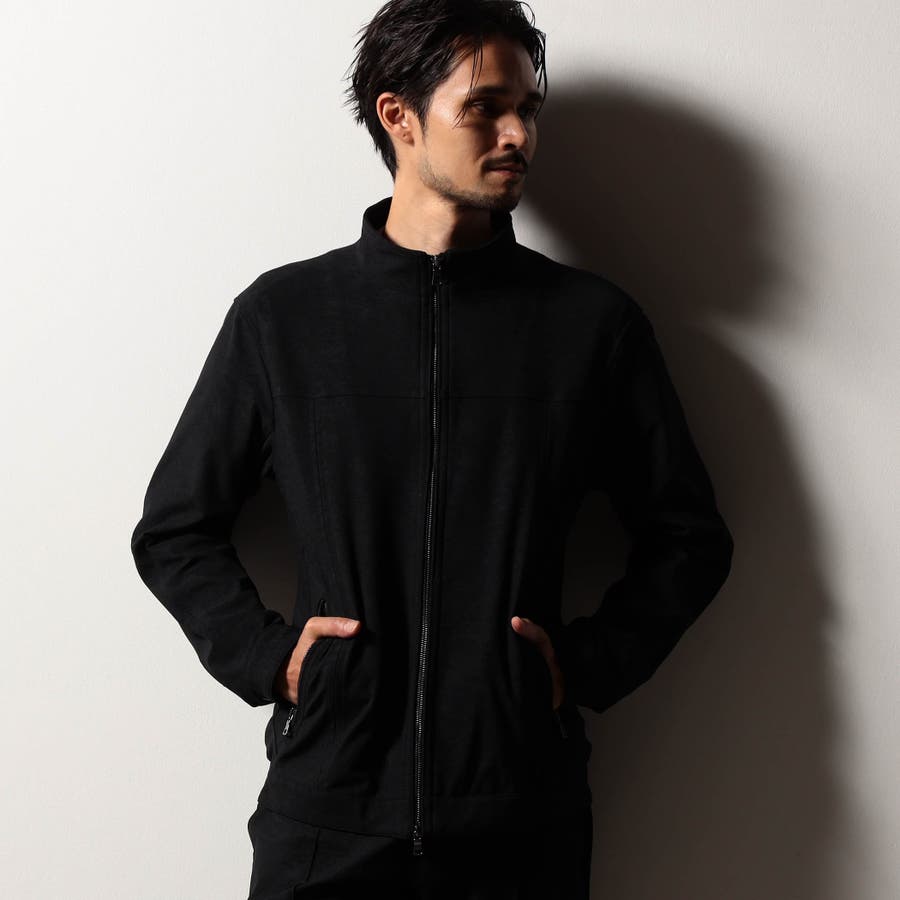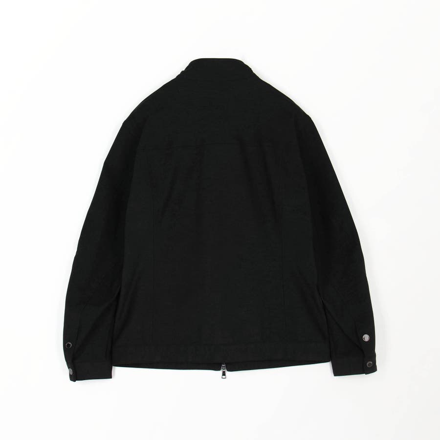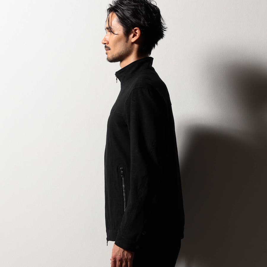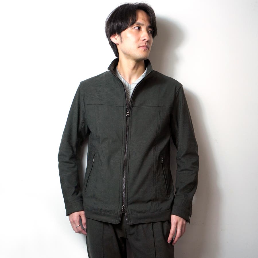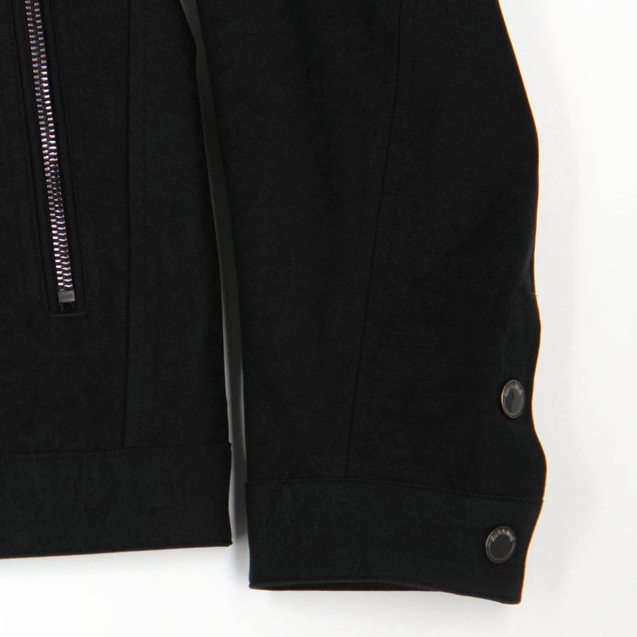 シャープなシルエットのショートスタンドブルゾン。切り替えデザインと両割りステッチをアクセントに、立体的なツイストライダース袖に作っています。衿端にはワイヤーを入れ、箔転写の軽量ファスナーやオリジナルドット釦を使い、シンプルだけど細かい所まで凝ったデザインにしています。ハイテンションのカットソー素材になりますのでとても着やすく、レザーブルゾン感覚でスタリングも合わせやすいです。この素材はとても特殊で縫製が難しいので工場に頼み込んで作っています。