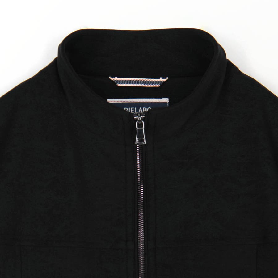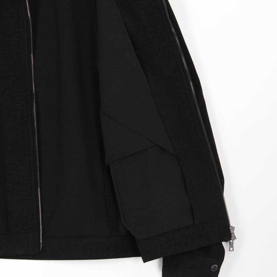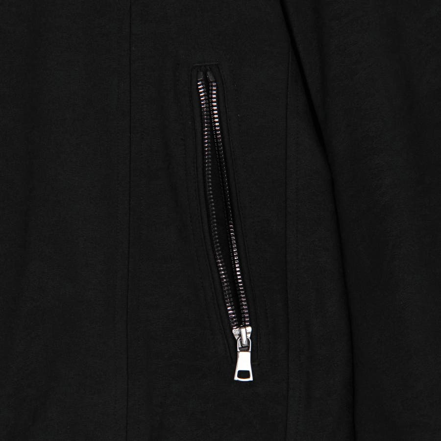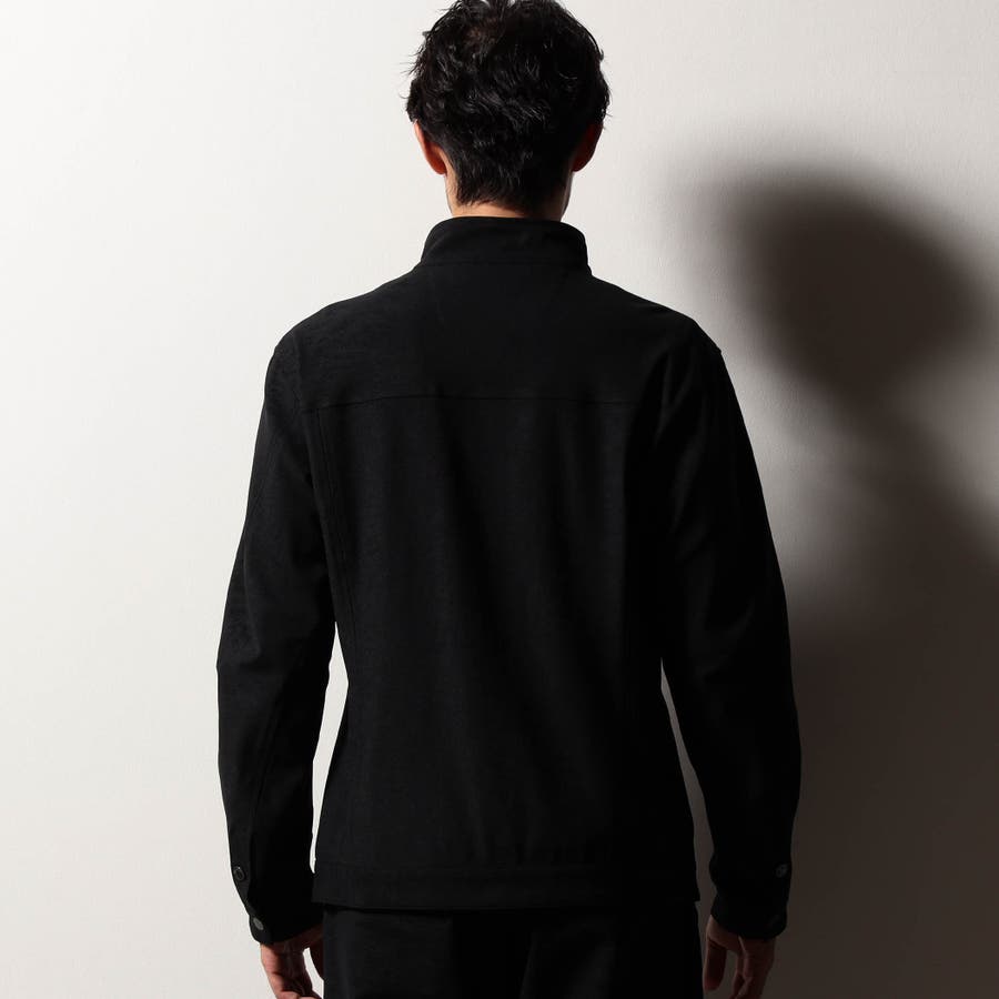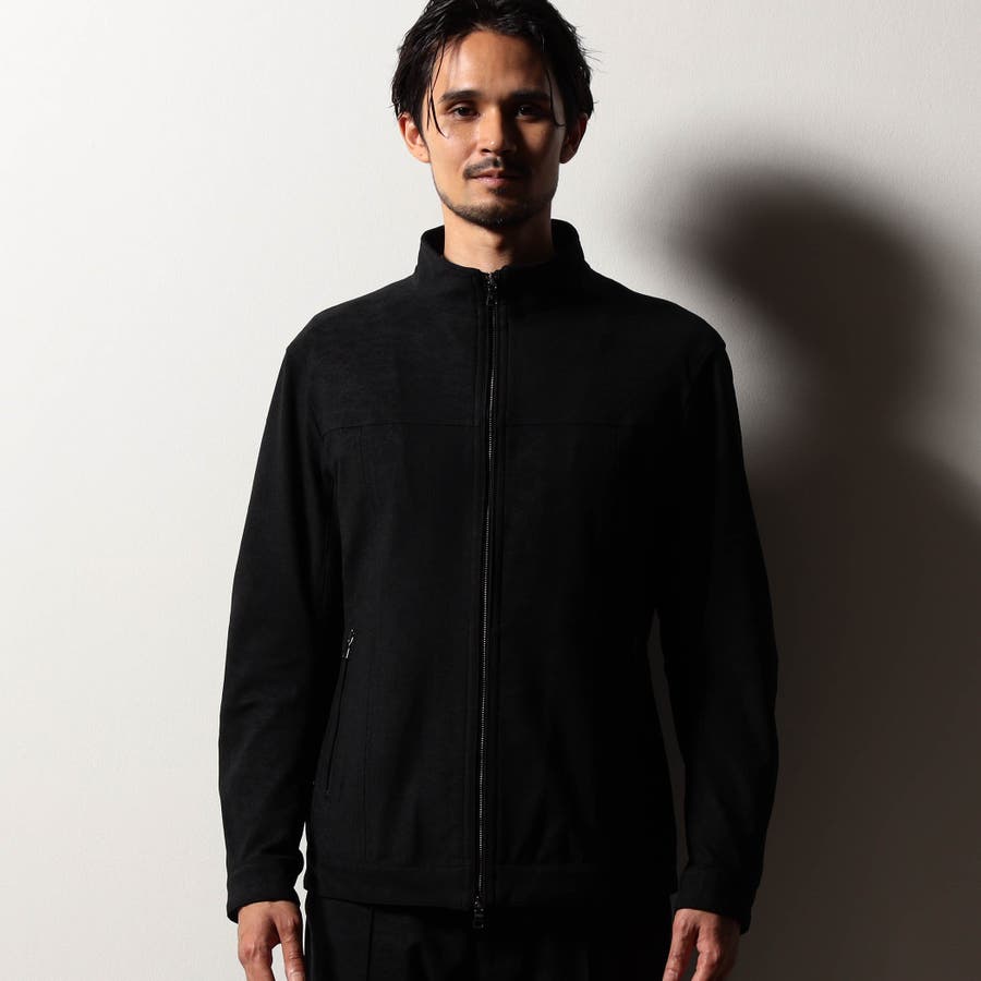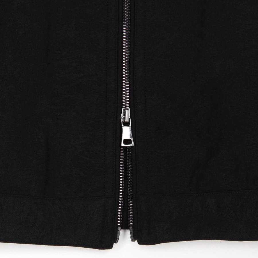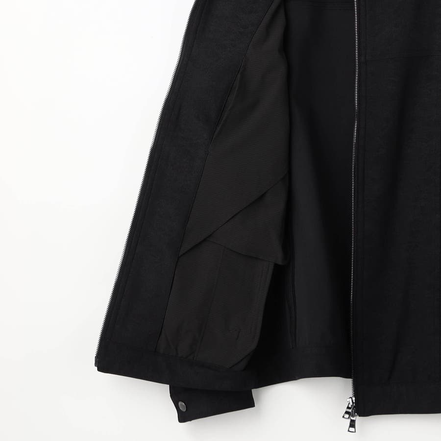 シャープなシルエットのショートスタンドブルゾン。切り替えデザインと両割りステッチをアクセントに、立体的なツイストライダース袖に作っています。衿端にはワイヤーを入れ、箔転写の軽量ファスナーやオリジナルドット釦を使い、シンプルだけど細かい所まで凝ったデザインにしています。ハイテンションのカットソー素材になりますのでとても着やすく、レザーブルゾン感覚でスタリングも合わせやすいです。この素材はとても特殊で縫製が難しいので工場に頼み込んで作っています。