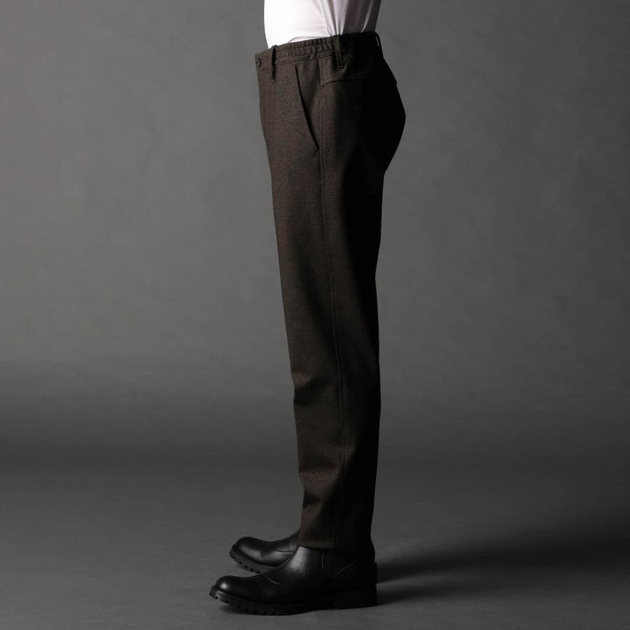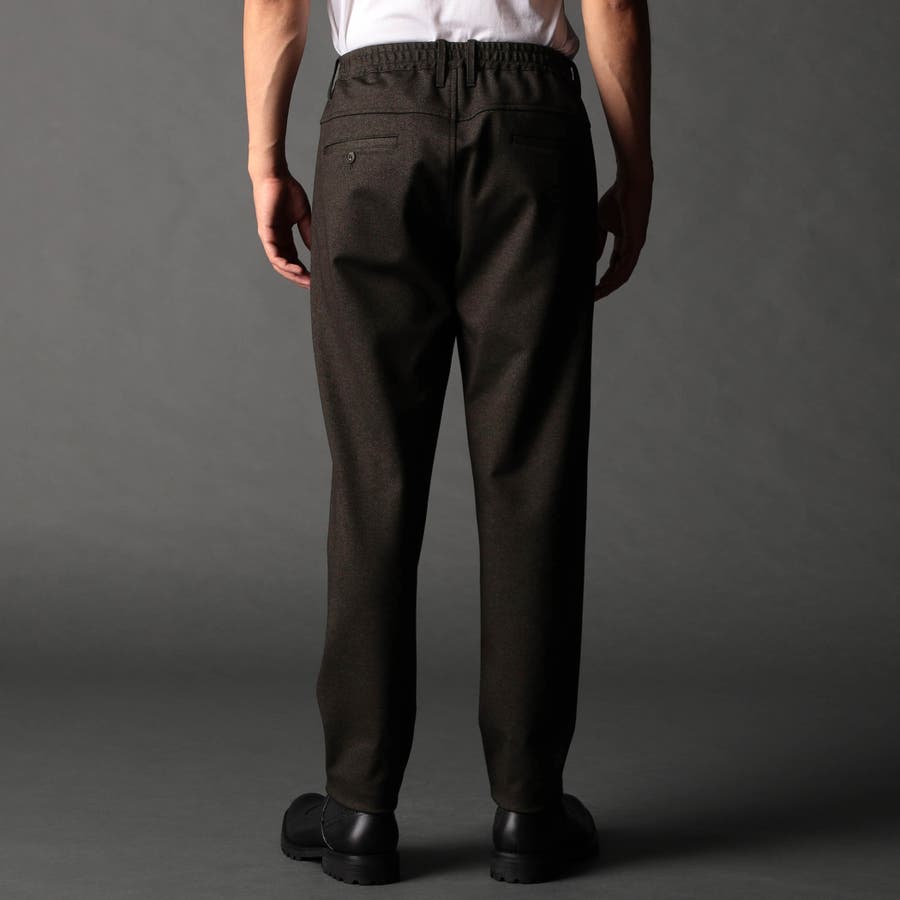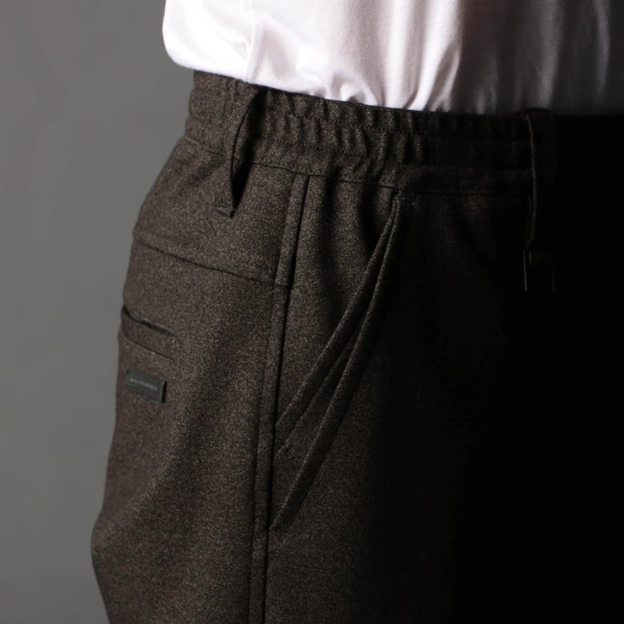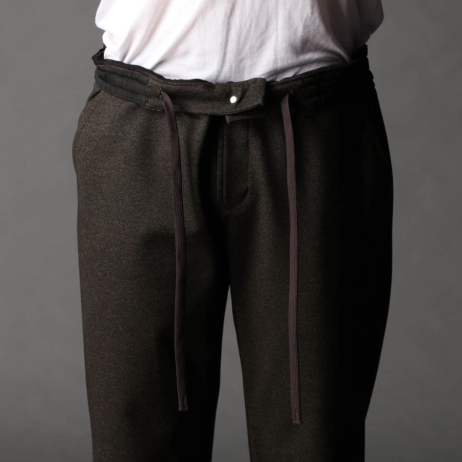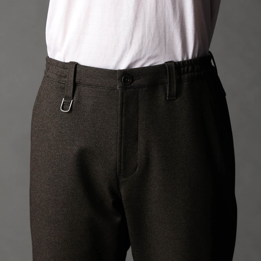 イージーパンツ仕様のスラックスデザイン。裏側にはストレッチ裏地を使用して表地に追従する様に馴染みを良くしています。ジャージ素材なのでキックバックの利いたテンションがあります。ヒップ周りから渡り幅を細くして裾口にかけてテーパードさせたシルエット。フロントの前端からベルトループ辺りまでをフラットに仕上げる事で、前から見た時にスラックス調のスッキリした見え方に仕上げにしています。右側の脇ポケットにはモバイル用ポケットを作っています。
