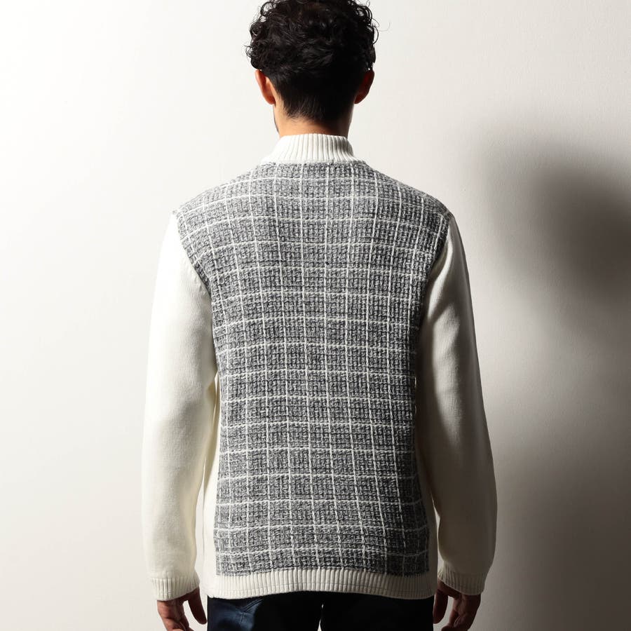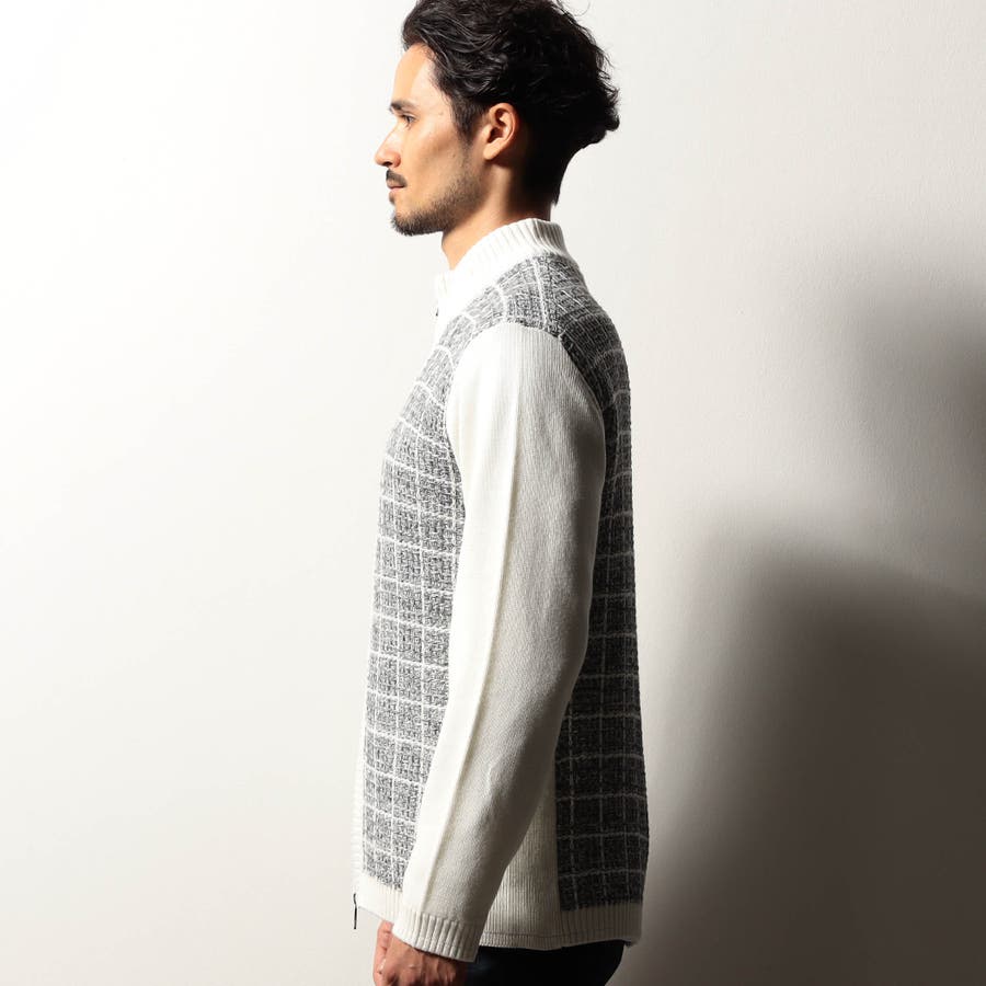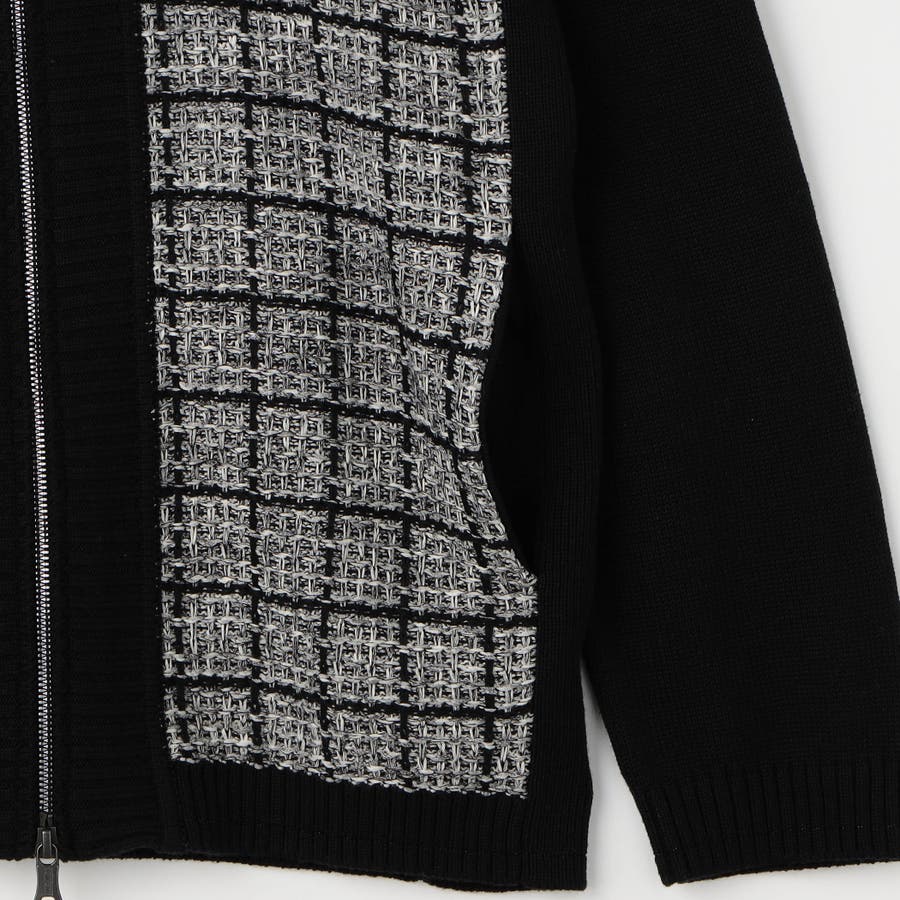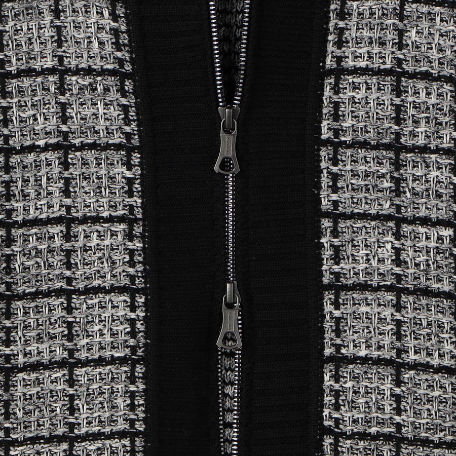 身頃をモノトーンのツイードチェック柄に編み立てたドライバーズニット。編地の中にちらっと覗くラメ糸がさりげなくもエレガントな雰囲気です。YKKのリエラボ別注箔転写ファスナーをポイントに、ラグジュアリーかつモードな印象に仕上げました。部分的に編地を切り替え着用感を高めながらシャープなシルエットを演出。脇前の切替部分にはスラッシュポケットを設け、脇下の縫代部分にはデオドラントテープを叩きつけて機能性もプラスしています。
