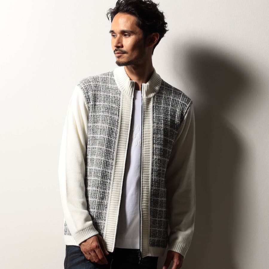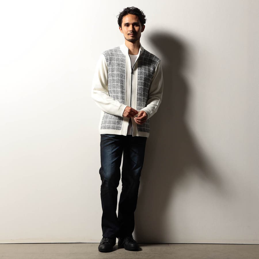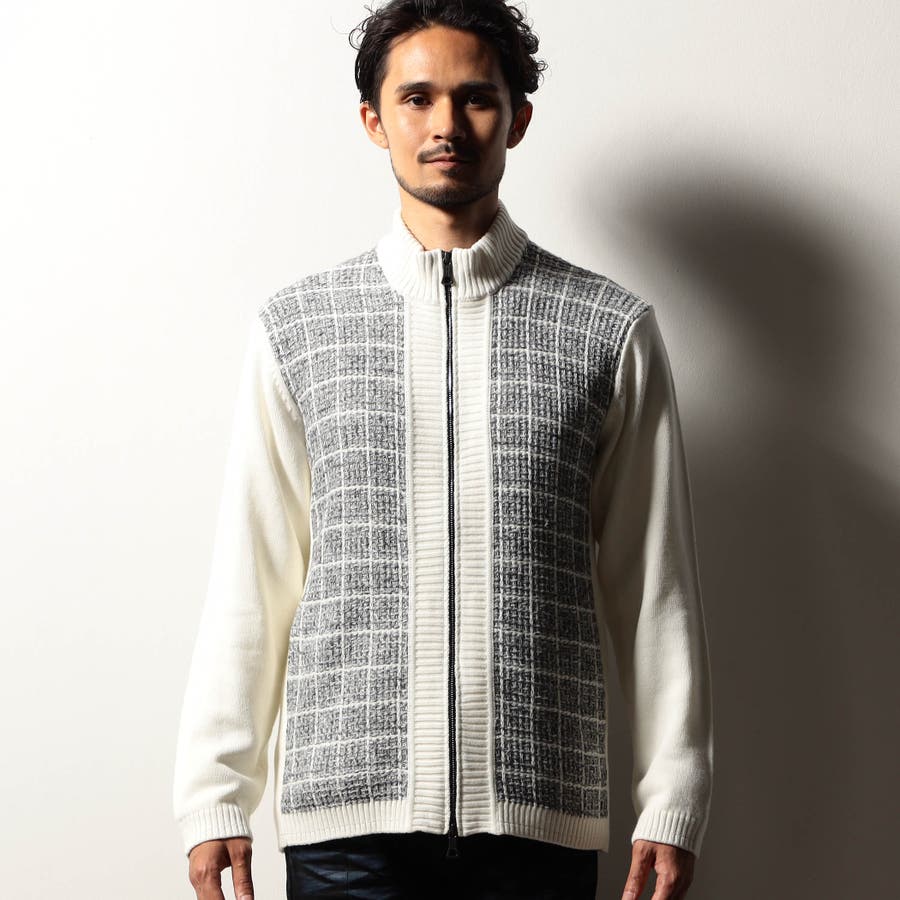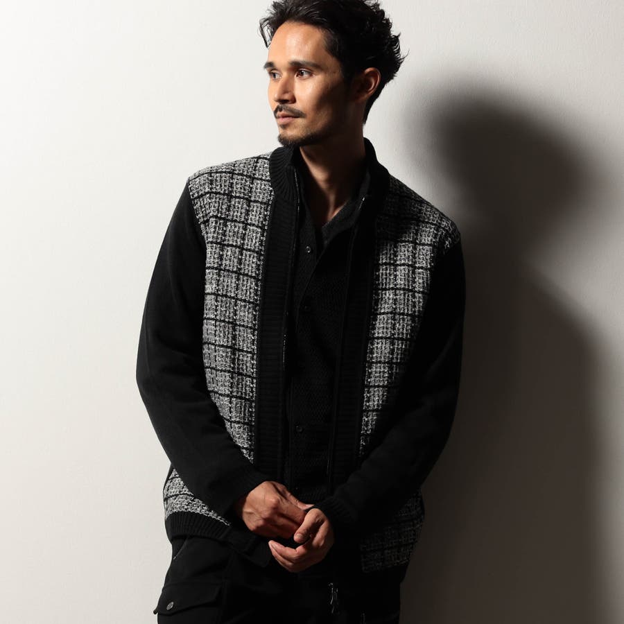 身頃をモノトーンのツイードチェック柄に編み立てたドライバーズニット。編地の中にちらっと覗くラメ糸がさりげなくもエレガントな雰囲気です。YKKのリエラボ別注箔転写ファスナーをポイントに、ラグジュアリーかつモードな印象に仕上げました。部分的に編地を切り替え着用感を高めながらシャープなシルエットを演出。脇前の切替部分にはスラッシュポケットを設け、脇下の縫代部分にはデオドラントテープを叩きつけて機能性もプラスしています。