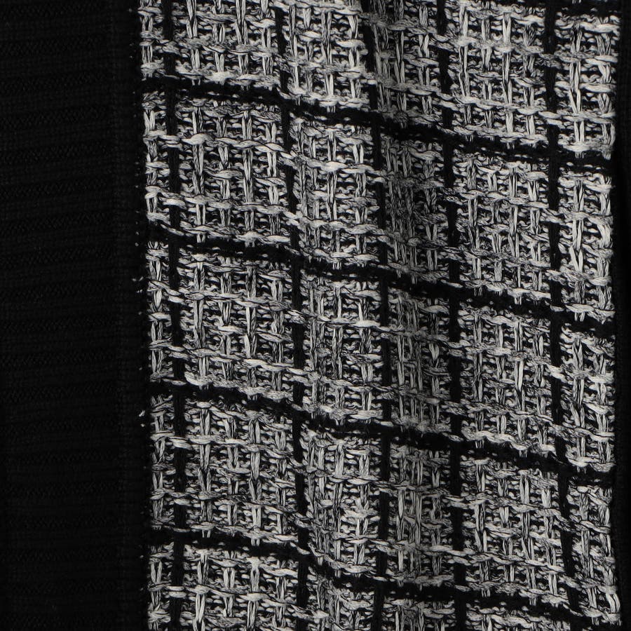 身頃には絣染めの中空糸で編みたてたツイードチェック柄編地を採用。ストライプのラーベンタックで立体感のあるツイード柄を表現しました。さらにラメ糸を交編することでラグジュアリー感を増しています。袖は天竺編み、前立てと細腹はリブ編みにすることでメリハリを付けました。ニットならではのストレッチ性にも優れ、長時間の着用でも疲れにくいストレスフリーな素材です。